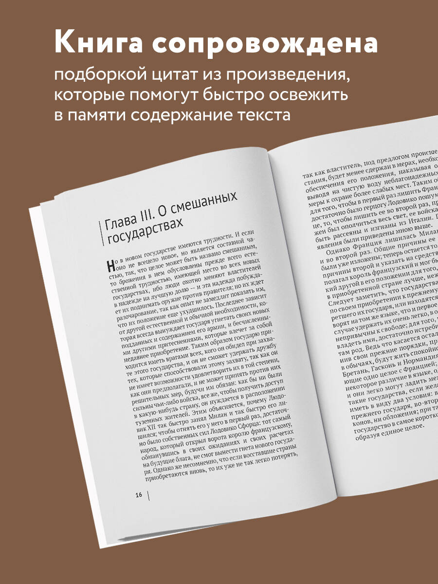 Классическое, не теряющее своей актуальности произведение итальянского мыслителя и политического деятеля эпохи Возрождения Никколо Макиавелли. Благодаря этому философскому труду читатель сможет познакомиться с ключевыми идеями государственности. Работа не теряет своей актуальности, начиная с XVI века: здесь можно найти ответы на вопросы о том, каким должен быть правитель, какие методы помогают ему сохранить власть и доброе отношение народа, как грамотно управлять своим государством и выстраивать политические взаимоотношения с другими. Используя исторические примеры, Макиавелли конкретизирует свои тезисы и тем самым дает им право на существование в реальной жизни. Некоторые из этих идей покажутся вам сегодня резкими и провокационными, остальные заиграют по-новому в современной действительности. Книга входит в обязательную программу гуманитарных направлений, а также будет полезна тем, кто связан с управленческой деятельностью. Если вы уже знакомы с другими книгами из серии «Великие идеи», куда вошли идеи Платона и Ницше, Фрейда и Шопенгауэра и других выдающихся личностей своего времени, «Государь» отлично дополнит вашу коллекцию. Для кого: - для тех, кто интересуется философией; - для тех, кто интересуется политикой; - для тех, кто ценит удобные форматы. Об авторе: Никколо Макиавелли - выдающийся мыслитель, философ и писатель эпохи Возрождения, основатель политической науки. В своих трудах он провозглашал государство вершиной развития цивилизации и утверждал, что для его процветания правитель может использовать практически любые средства. Макиавелли описывает идеального правителя, свойства его характера, методы государственного контроля для удержания и процветания его власти. Его именем назван принцип правления, основанный на грубой силе и отсутствии моральных норм, - "макиавеллизм".| Издательство | ООО "Издательство "Эксмо" |