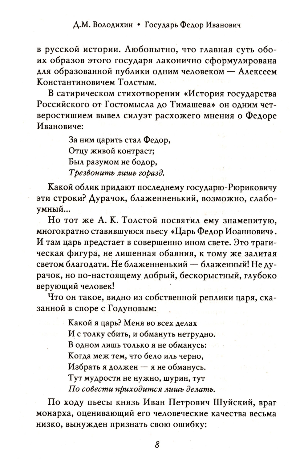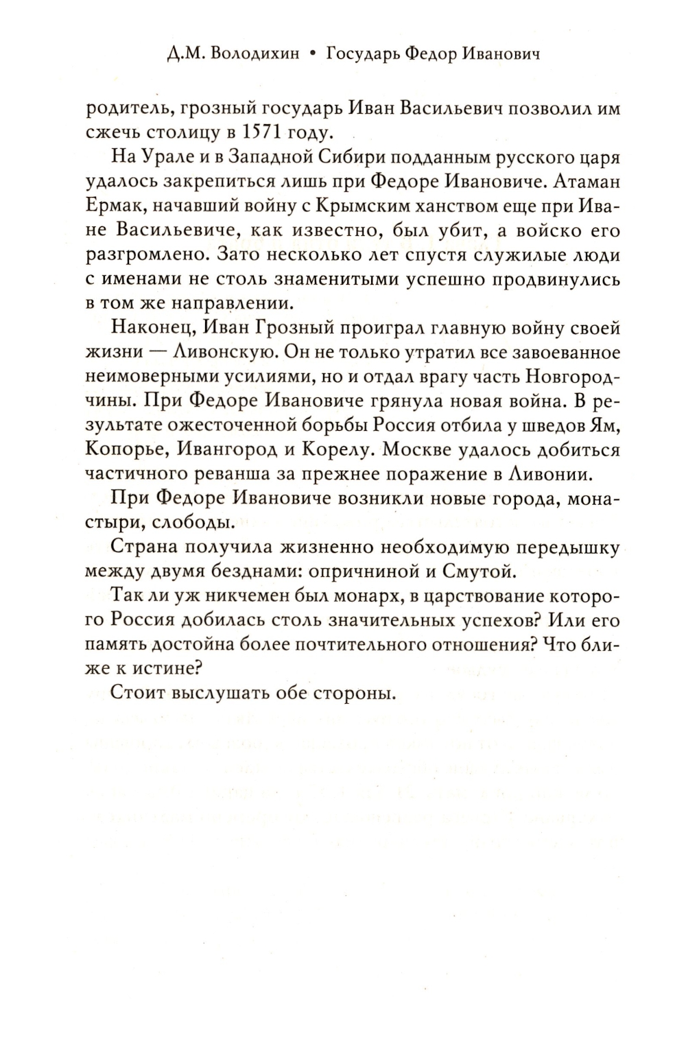 Федор Иванович был последним русским правителем из московской княжеской династии, основанной Даниилом Александровичем. В 1584 году он унаследовал престол после смерти своего отца Ивана Грозного. Ставший главой государства в непростые для страны времена государь был глубоко верующим, добрым и милосердным человеком. Таким предстает он и в книге «Государь Федор Иванович» доктора исторических наук Д.М. Володихина. Издание дополняет пьеса А.К. Толстого «Царь Федор Иоаннович». Проект «Собиратели Земли Русской» реализуется Российским военно-историческим обществом при поддержке партии «Единая Россия».| Издательство | Проспект |