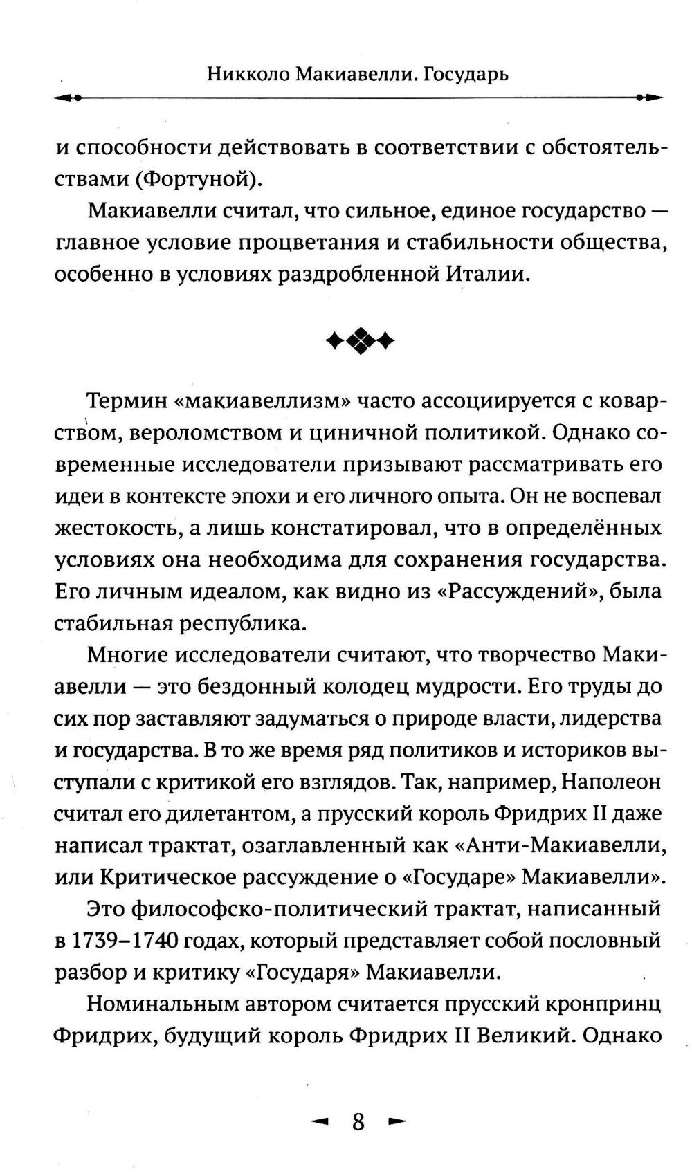 «Государь» - бессмертный трактат флорентийского мыслителя и государственного деятеля Никколо Макиавелли (1469-1527), ставший фундаментальным трудом политической философии и руководством для правителей во всём мире на протяжении многих веков. Написанный в 1513 году, этот труд представляет собой глубокий и беспрецедентно прагматичный анализ технологий захвата, удержания и эффективного использования политической власти. Отбросив идеализированные представления о добродетельном правителе, Макиавелли создал реалистичное руководство, основанное на его личном дипломатическом опыте, а также на изучении истории Древнего Рима и современных ему итальянских государств. Данная книга будет интересна как тем, кто просто интересуется историей политической мысли, так и тем, кто хочет разобраться в перипетиях современной международной политики.| Издательство | Изд. Книга |