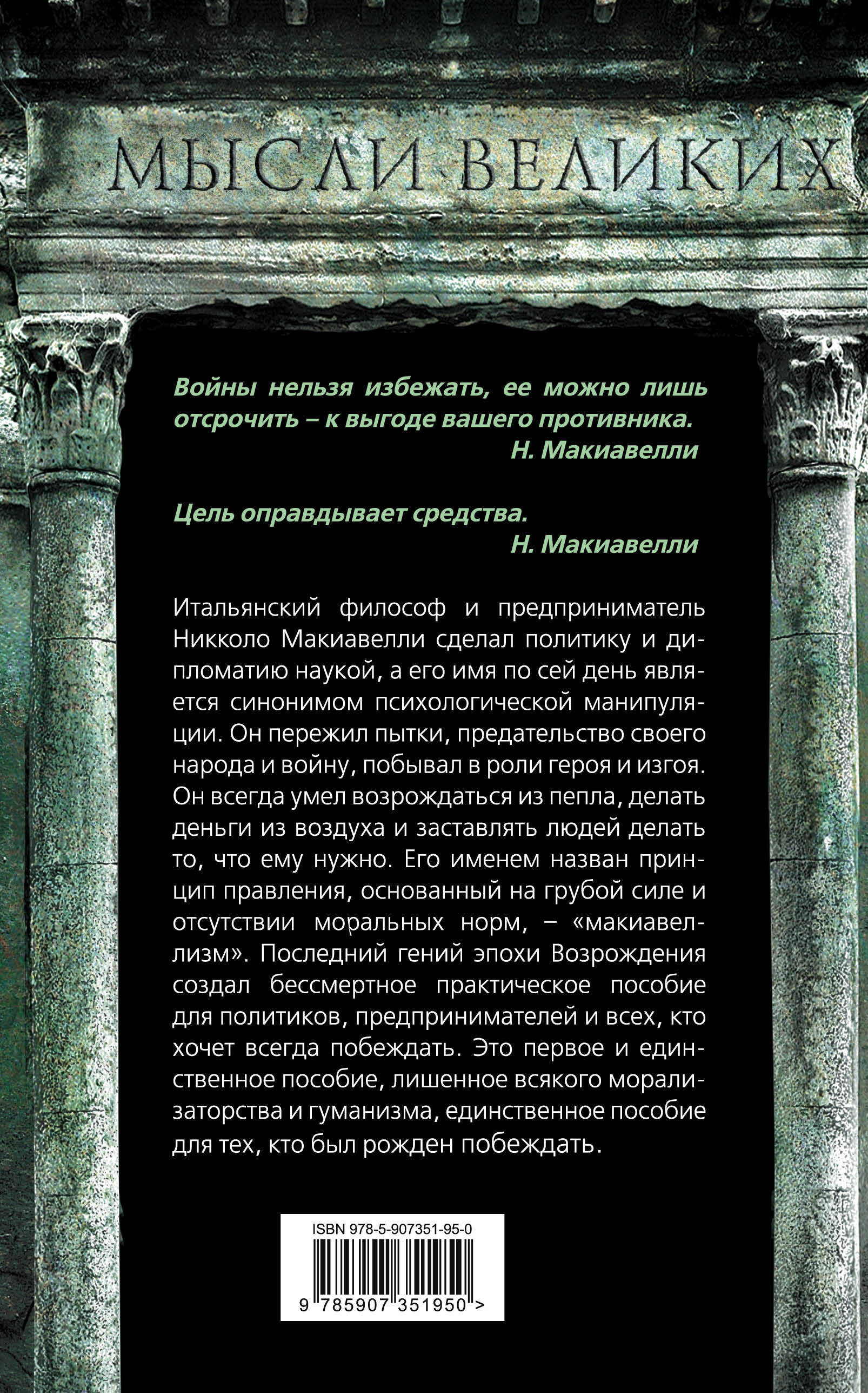 «Войны нельзя избежать, ее можно лишь отсрочить - к выгоде вашего противника». - Никколо Макиавелли «Цель оправдывает средства». - Никколо Макиавелли Итальянский философ и предприниматель Никколо Макиавелли сделал политику и дипломатию наукой, а его имя по сей день является синонимом психологической манипуляции. Он пережил пытки, предательство своего народа и войну, побывал в роли героя и изгоя. Он всегда умел возрождаться из пепла, делать деньги из воздуха и заставлять людей делать то, что ему нужно. Его именем назван принцип правления, основанный на грубой силе и отсутствии моральных норм-- «макиавеллизм». Последний гений эпохи Возрождения создал бессмертное практическое пособие для политиков, предпринимателей и всех, кто хочет всегда побеждать. Это первое и единственное пособие, лишенное всякого морализаторства и гуманизма, единственное пособие для тех, кто был рожден побеждать.| Издательство | Родина Издательство ООО |