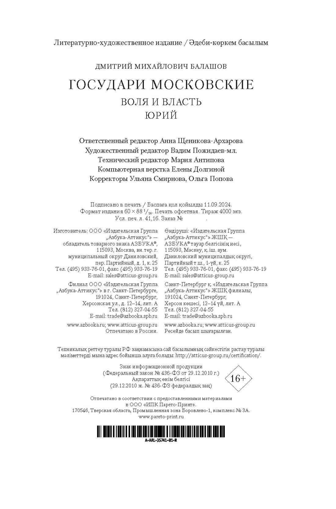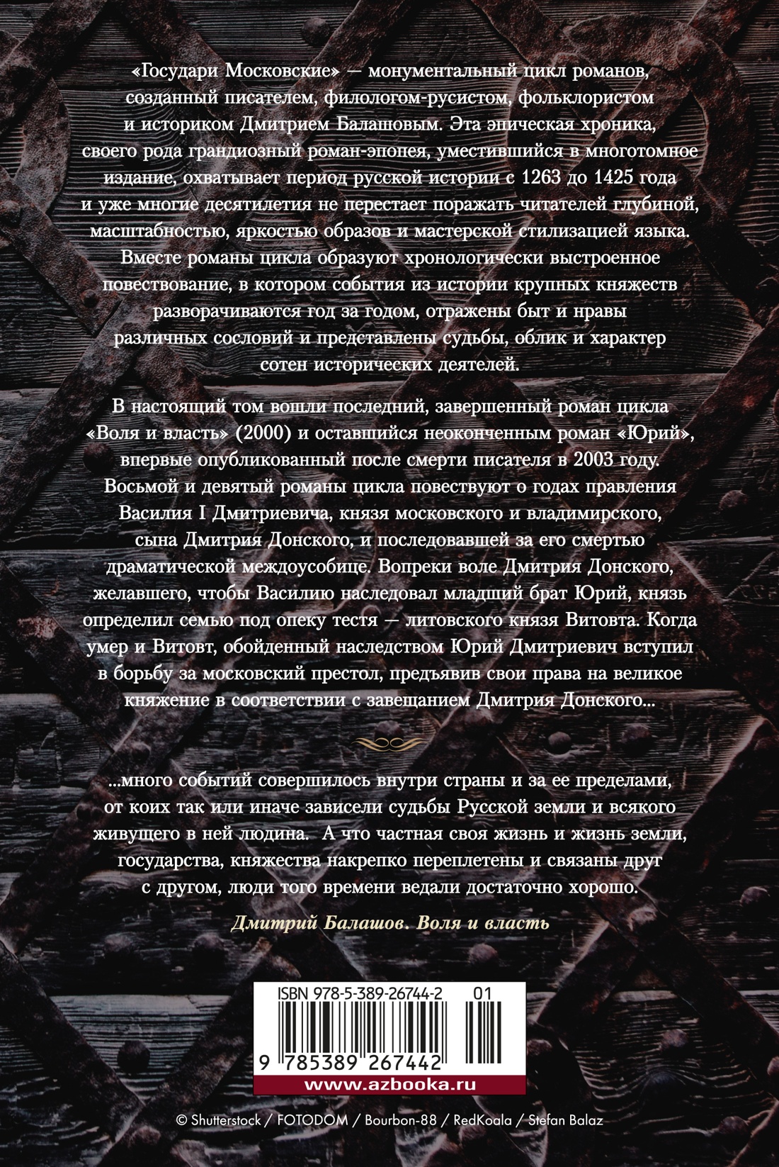 «Государи Московские» - монументальный цикл романов, созданный писателем, филологом-русистом, фольклористом и историком Дмитрием Балашовым. Эта эпическая хроника, своего рода грандиозный роман-эпопея, уместившийся в многотомное издание, охватывает период русской истории с 1263 до 1425 года и уже многие десятилетия не перестает поражать читателей глубиной, масштабностью, яркостью образов и мастерской стилизацией языка. Вместе романы цикла образуют хронологически выстроенное повествование, в котором события из истории крупных княжеств разворачиваются год за годом, отражены быт и нравы различных сословий и представлены судьбы, облик и характер сотен исторических деятелей. В настоящий том вошли последний, завершенный роман цикла «Воля и власть» (2000) и оставшийся неоконченным роман «Юрий», впервые опубликованный после смерти писателя в 2003 году. Восьмой и девятый романы цикла повествуют о годах правления Василия I Дмитриевича, князя московского и владимирского, сына Дмитрия Донского, и последовавшей за его смертью драматической междоусобице. Вопреки воле Дмитрия Донского, желавшего, чтобы Василию наследовал младший брат Юрий, князь определил семью под опеку тестя - литовского князя Витовта. Когда умер и Витовт, обойденный наследством Юрий Дмитриевич вступил в борьбу за московский престол, предъявив свои права на великое княжение в соответствии с завещанием Дмитрия Донского...| Издательство | Азбука |
