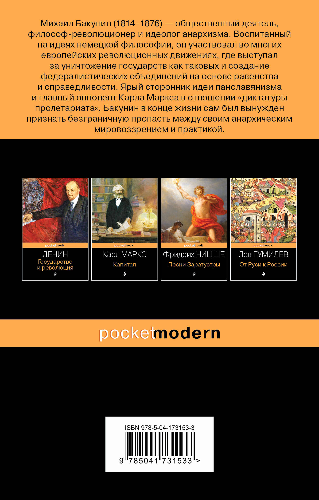 Михаил Бакунин (1814-1876) - общественный деятель, философ-революционер и идеолог анархизма. Воспитанный на идеях немецкой философии, он участвовал во многих европейских революционных движениях, где выступал за уничтожение государств как таковых и создание федералистических объединений на основе равенства и справедливости. Ярый сторонник идеи панславянизма и главный оппонент Карла Маркса в отношении «диктатуры пролетариата», Бакунин под конец жизни сам был вынужден признать безграничную пропасть между своим анархическим мировоззрением в теории и на практике.| Издательство | ООО "Издательство "Эксмо" |