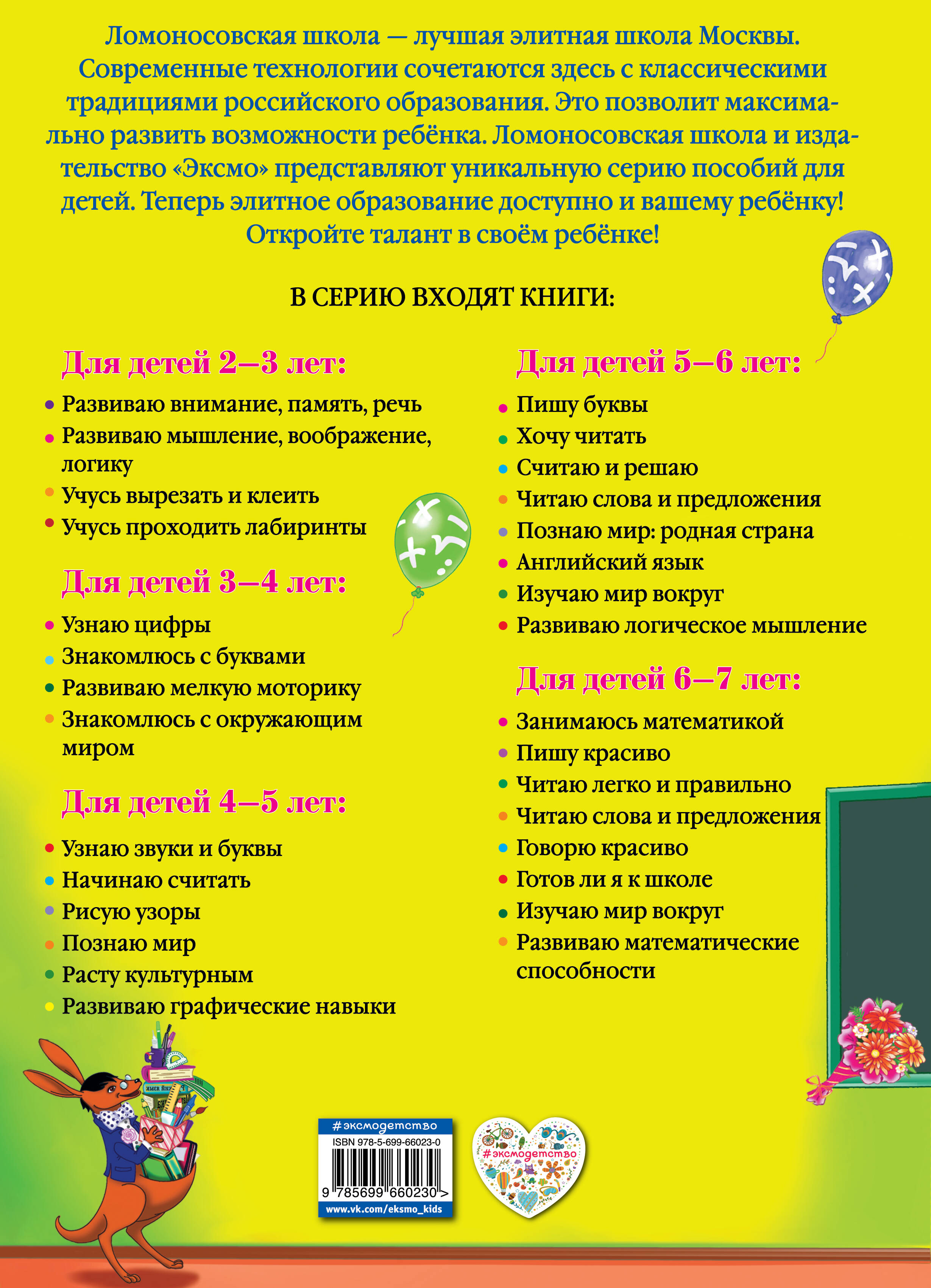 Педагоги «Ломоносовской школы» создали серию обучающих пособий с учетом особенностей развития современного ребенка, новейших достижений педагогики, психологии, возрастной физиологии, собственного многолетнего опыта работы с дошкольниками и предлагают эффективное решение для качественной подготовки современных детей к дальнейшему обучению! Покупая это пособие своему ребенку, вы сможете: • понять, насколько ребенок готов к обучению в школе: как долго он может заниматься, есть ли у него мотивация, насколько у него развиты познавательные способности и т.д.; • оценить знания ребенка по нескольким темам: «Речь и письмо», «Математика», «Осведомленность», «Пространство»; • вовремя выявить и устранить пробелы в знаниях.| Издательство | Эксмо |