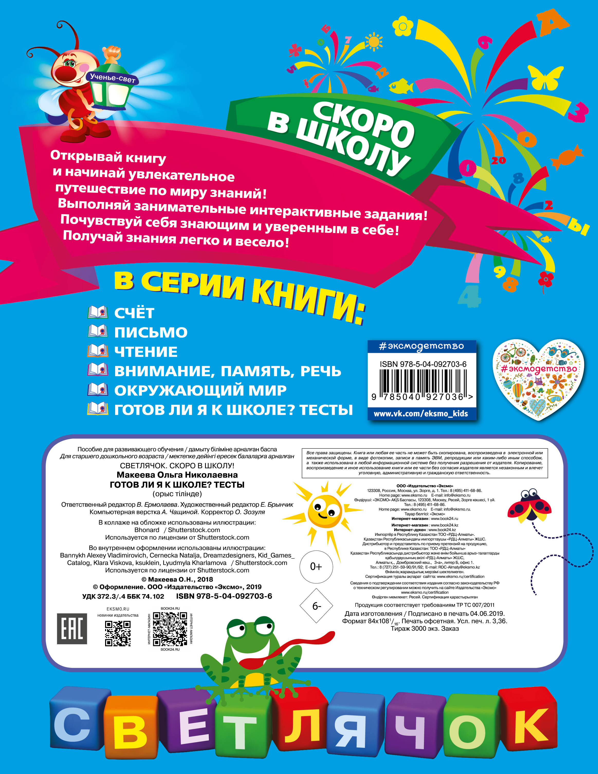 Основная задача книги - диагностика готовности ребенка к обучению в школе. Проверочные тесты, апробированные на практике, помогут родителям понять, готов ли их ребенок к школе, и устранить пробелы.| Издательство | ООО "Издательство "Эксмо" |