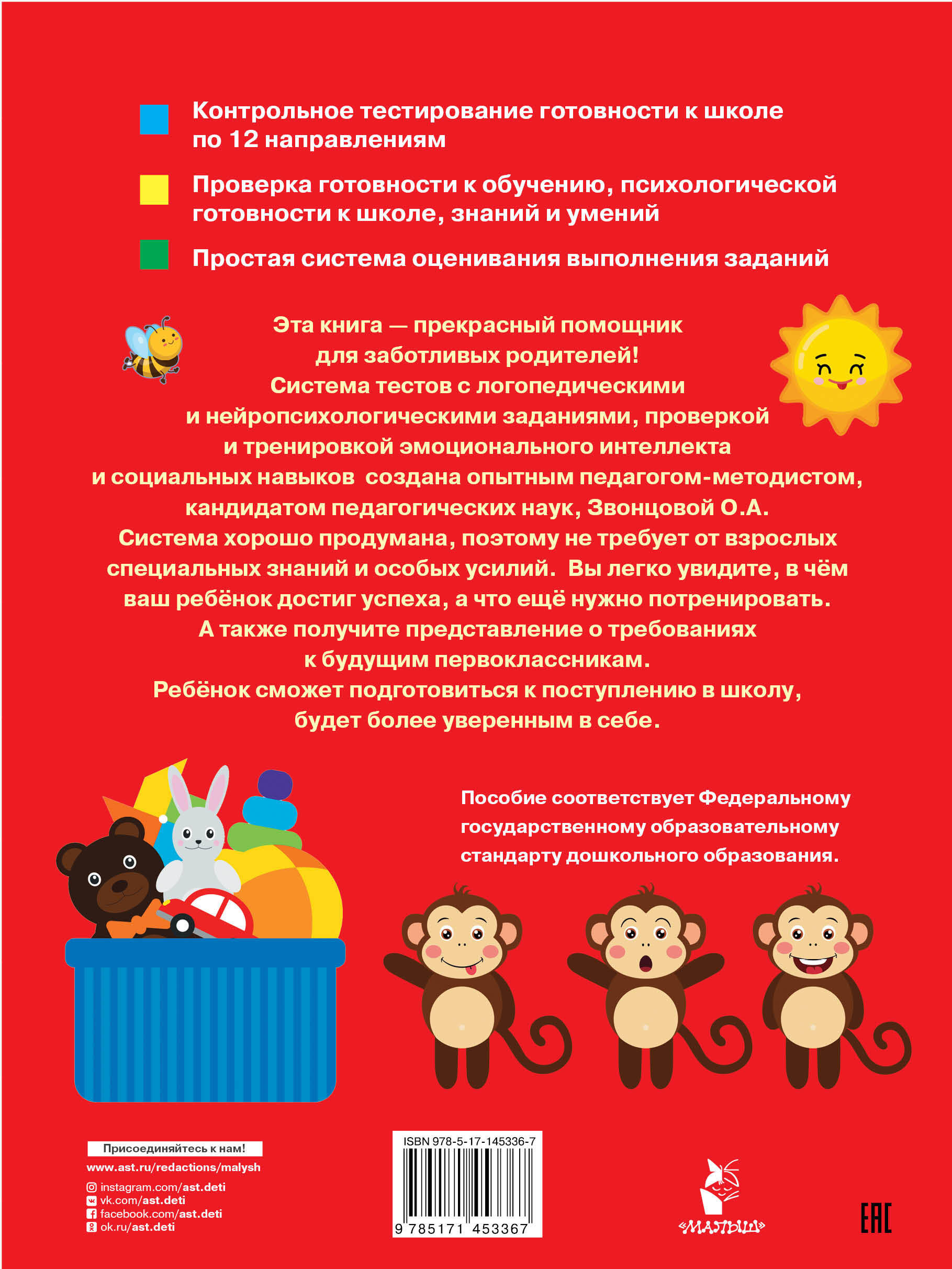 Эта книга - прекрасный помощник для заботливых родителей! Система тестов с логопедическими и нейропсихологическими заданиями, проверкой и тренировкой эмоционального интеллекта и социальных навыков создана опытным педагогом-методистом, кандидатом педагогических наук, Звонцовой О.А. Система хорошо продумана, поэтому не требует от взрослых специальных знаний и особых усилий. Вы легко увидите, в чём ваш ребёнок достиг успеха, а что ещё нужно потренировать. А также получите представление о требованиях к будущим первоклассникам. Ребёнок сможет подготовиться к поступлению в школу, будет более уверенным в себе.| Издательство | ИЗДАТЕЛЬСТВО "АСТ" |