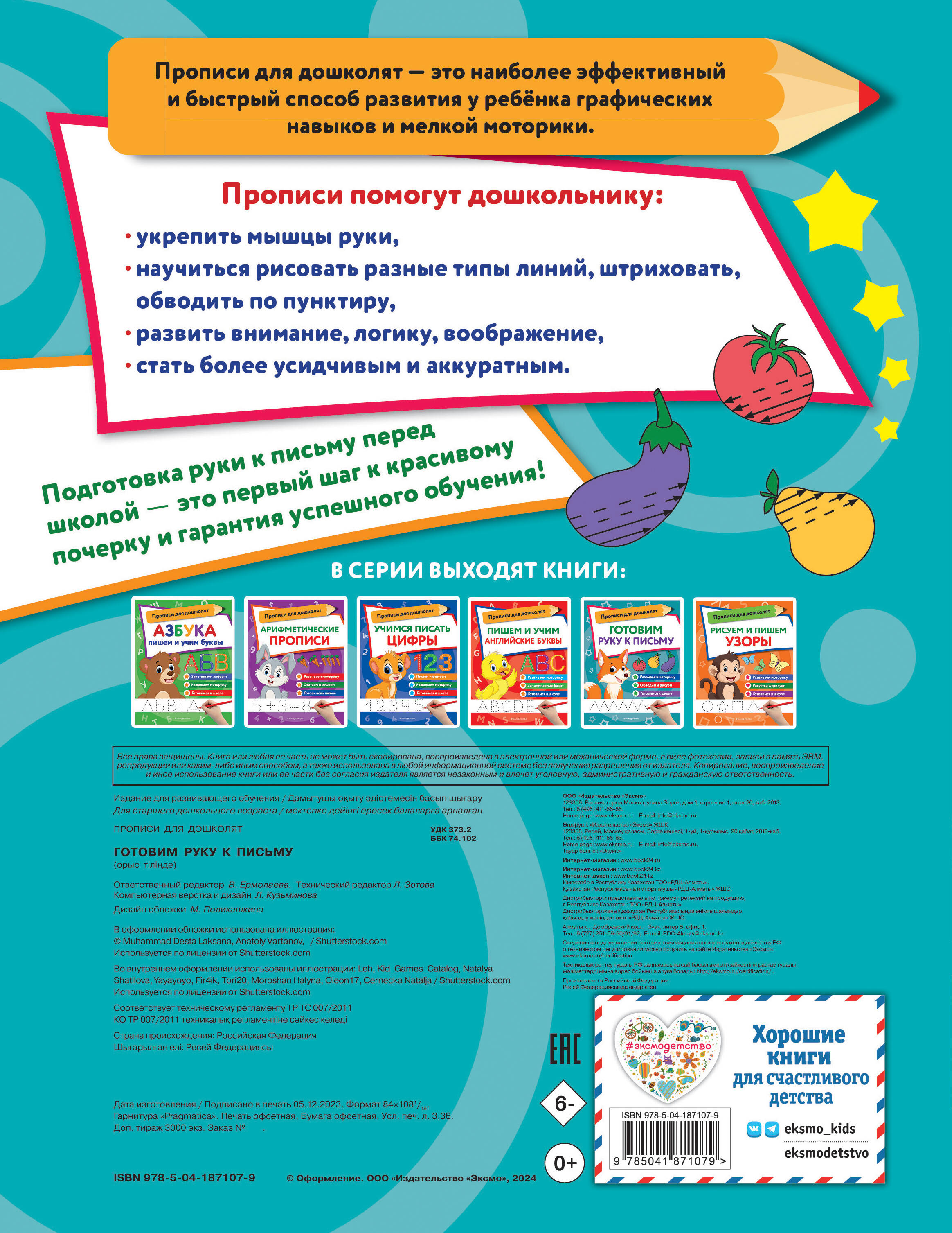 Задача прописей для дошкольников - подготовить руку ребенка к письму. Выполняя увлекательные игровые задания, дошкольник будет штриховать, обводить разные типы линий и предметы по пунктиру, копировать изображения по клеточкам, проходить лабиринты, дорисовывать половинки, рисовать узоры в клетках и в линейках. Забавные позитивные картинки доставят детям удовольствие и будут способствовать получению высокого результата. Кроме того, пропись поможет развить у ребенка усидчивость, внимание и терпение - навыки, которые очень важны для обучения в школе.