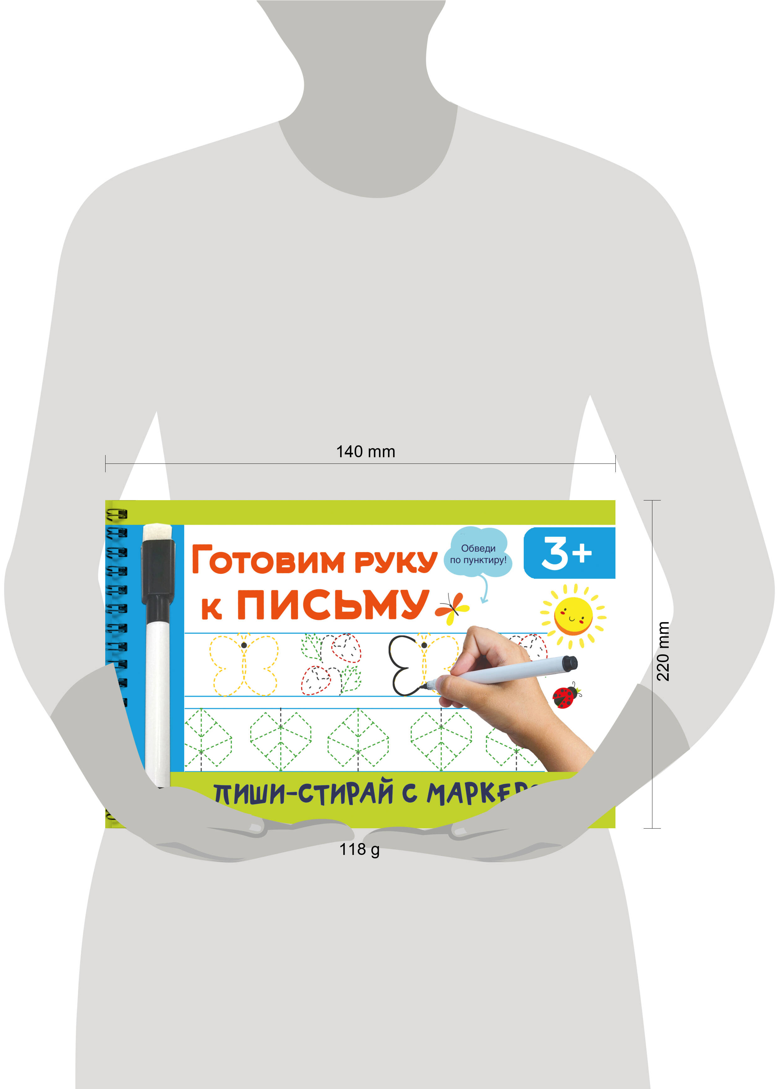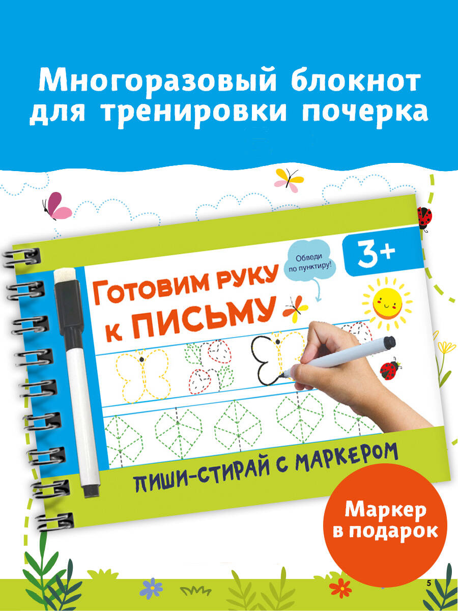 Многоразовая тетрадь на спирали «Готовим руку к письму» - замечательная книга, которая поможет ребёнку научиться держать маркер, развить мелкую моторику и подготовить руку к письму. Все страницы ламинированы. Маркер стирается одним движением. Можно не бояться ошибок, пробовать писать снова и снова! Обучение в игровой форме поможет ребёнку развить мелкую моторику, память, логику, улучшить навык письма и аккуратность. Задания разных типов: прописи с линиями, рисунки по точкам, рисунки двумя руками и многое-многое другое. Яркие картинки, отличное качество и удобная спираль, чтобы перелистывать страницы. У книги удобный небольшой формат - А5, поэтому она поместится и в мамину сумку, и в детский рюкзачок.| Издательство | Издательство "АСТ" |
