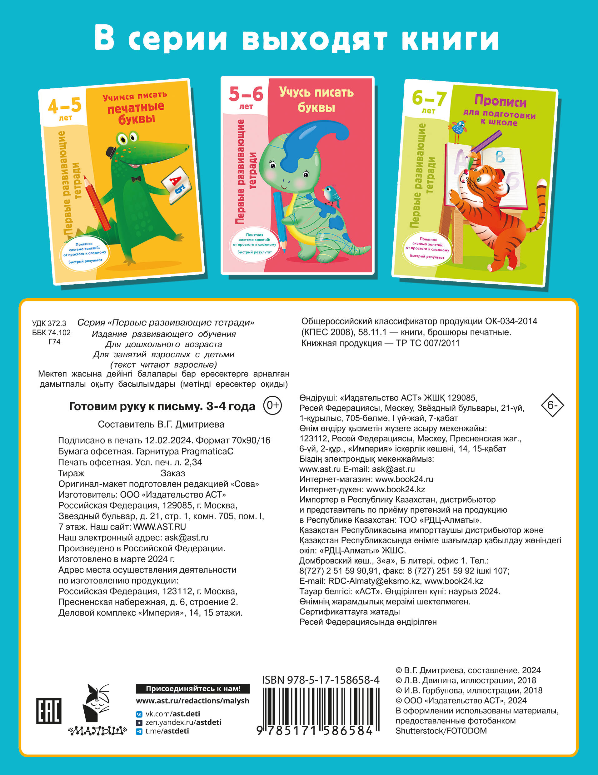 Ребёнок до сих пор плохо держит ручку в руке? Не умеет проводить прямые линии? Вы переживаете, как он научится писать буквы и цифры? Исправить эту ситуацию поможет универсальная тетрадь-тренажёр «Готовим руку к письму. 3-4 года». Будущие первоклассники научатся правильно держать ручку, разовьют мелкую моторику, зрительное восприятие, внимательность, аккуратность. В тренажёре собраны разнообразные задания. Малыш потренируется выводить линии, штриховать рисунки, обводить картинки по точкам, прописывать элементы фигур в строчках и многое другое. Подходит для индивидуальных и групповых занятий. Вперёд - навстречу новым умениям!| Издательство | Издательство "АСТ" |