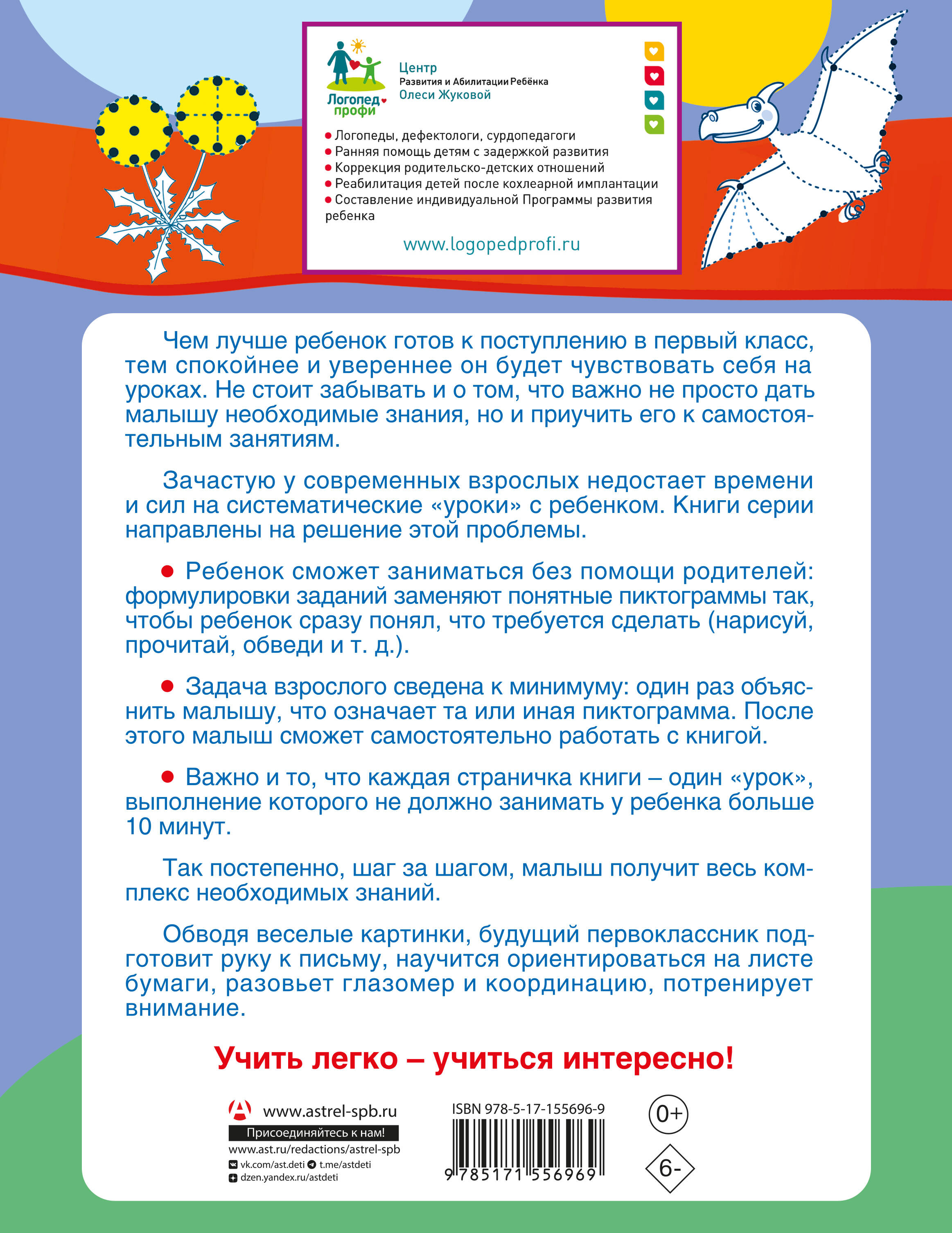 Книги этой серии созданы специально для занятых родителей. Дети вполне смогут заниматься без помощи взрослых: формулировки заданий заменяют понятные пиктограммы так, чтобы ребенок сразу понял, что требуется сделать (нарисуй, раскрась, обведи и т. д.). Такие занятия приучают малыша к самостоятельному выполнению заданий, что является важнейшим навыком для будущего первоклассника. Обводя веселые картинки, будущий первоклассник подготовит руку к письму, научится ориентироваться на листе бумаги, разовьет глазомер и координацию, потренирует внимание и усидчивость. Для дошкольного возраста.