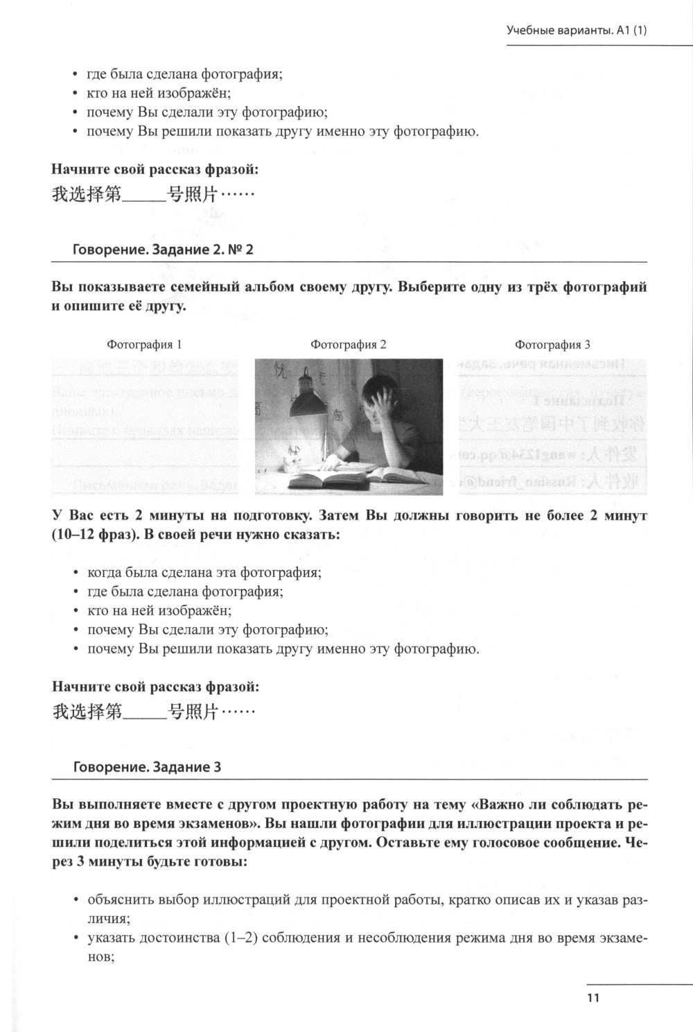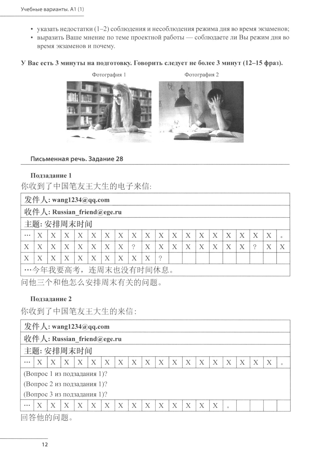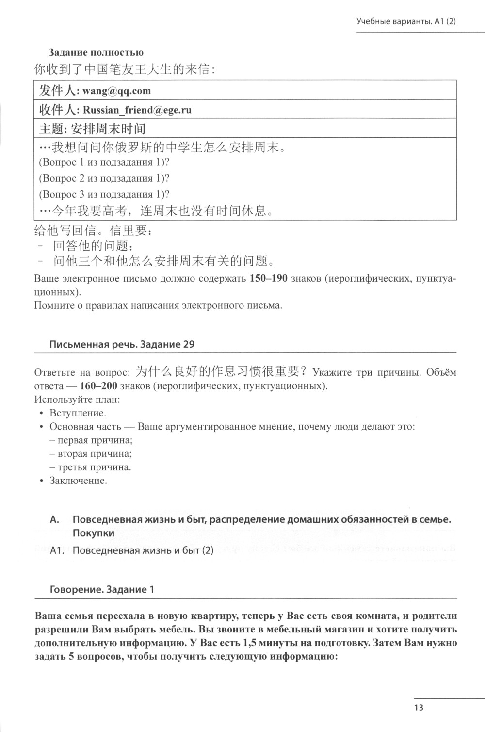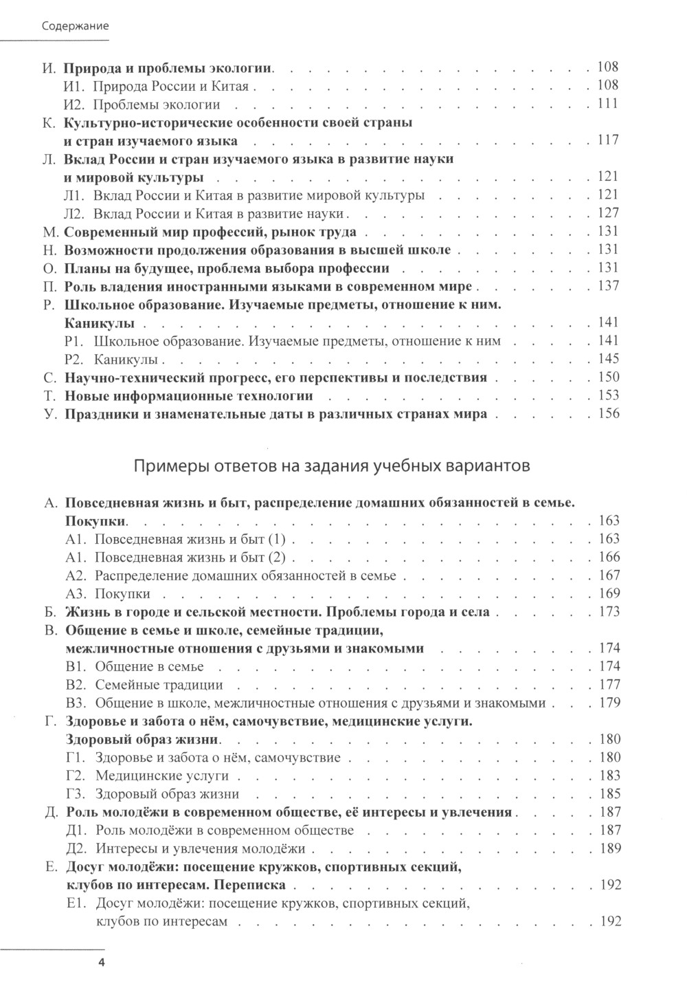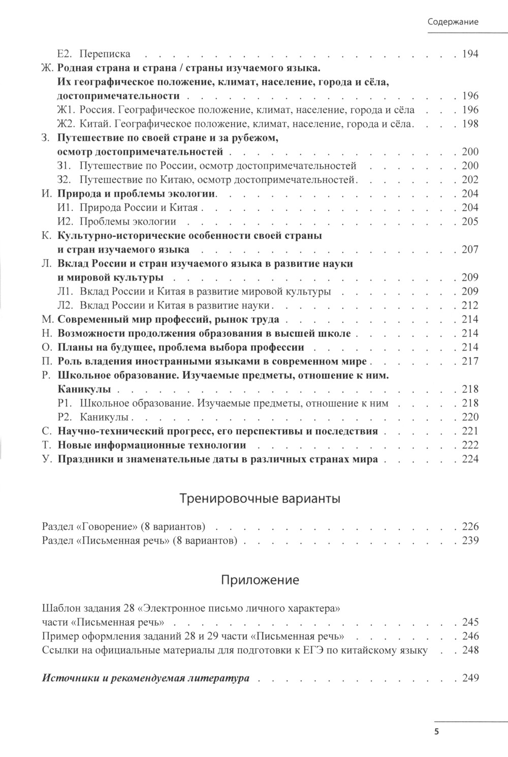 Задания разделов «Письменная речь» и «Говорение» требуют от участника ЕГЭ по китайскому языку умения продуцировать письменную и устную речь в ситуациях общения, указанных в таблице «Предметное содержание речи» кодификатора КИМ данного экзамена. Как правило, эти задания вызывают у учащихся наибольшие трудности. В пособии предлагается совместить подготовку к обоим разделам. Первая часть пособия («Учебные варианты») разбита на параграфы в соответствии с темами таблицы «Предметное содержание речи». Задания в формате раздела ЕГЭ «Говорение» в начале каждого параграфа подготавливают к выполнению заданий в формате раздела ЕГЭ «Письменная речь». Во второй части пособия («Примеры ответов на задания учебных вариантов») даны слова для справки и примеры ответов. После выполнения заданий первой части пособия обучающемуся предлагается решить тренировочные варианты в формате ЕГЭ по китайскому языку (восемь вариантов раздела «Говорение» и восемь вариантов раздела «Письменная речь»).| Издательство | Восточная книга |