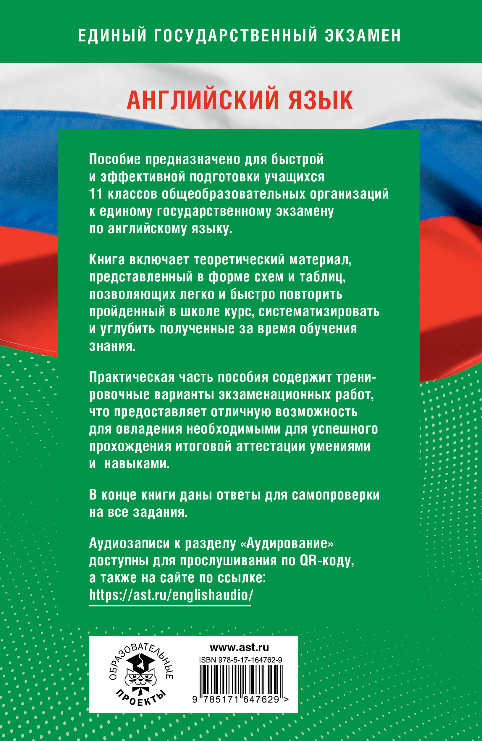 Пособие предназначено для быстрой и эффективной подготовки учащихся 11 классов общеобразовательных организаций к единому государственному экзамену по английскому языку. Книга включает теоретический материал, представленный в форме схем и таблиц, позволяющих легко и быстро повторить пройденный в школе курс, систематизировать и углубить полученные за время обучения знания. Практическая часть пособия содержит тренировочные варианты экзаменационных работ, что предоставляет отличную возможность для овладения необходимыми для успешного прохождения итоговой аттестации умениями и навыками. В конце книги даны ответы для самопроверки на все задания. Аудиозаписи к разделу "Аудирование" доступны для прослушивания по QR-коду, а также на сайте по ссылке: https://ast.ru/englishaudio| Издательство | Издательство "АСТ" |