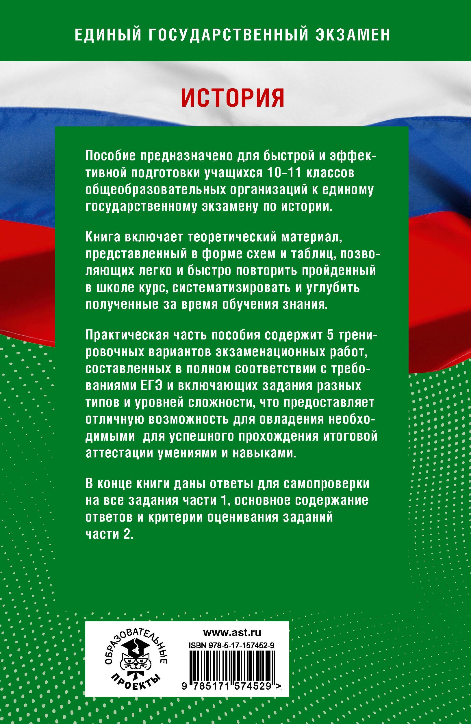 Пособие предназначено для быстрой и эффективной подготовки учащихся 10 - 11 классов общеобразовательных организаций к единому государственному экзамену по истории. Книга включает теоретический материал, представленный в форме схем и таблиц, позволяющих легко и быстро повторить пройденный в школе курс, систематизировать и углубить полученные за время обучения знания. Практическая часть пособия содержит 5 тренировочных вариантов экзаменационных работ, составленных в полном соответствии с требованиями ЕГЭ и включающих задания разных типов и уровней сложности, что предоставляет отличную возможность для овладения необходимыми для успешного прохождения итоговой аттестации умениями и навыками. В конце книги даны ответы для самопроверки на все задания части 1 и основное содержание ответов и критерии оценивания на задания части 2.| Издательство | ИЗДАТЕЛЬСТВО "АСТ" |