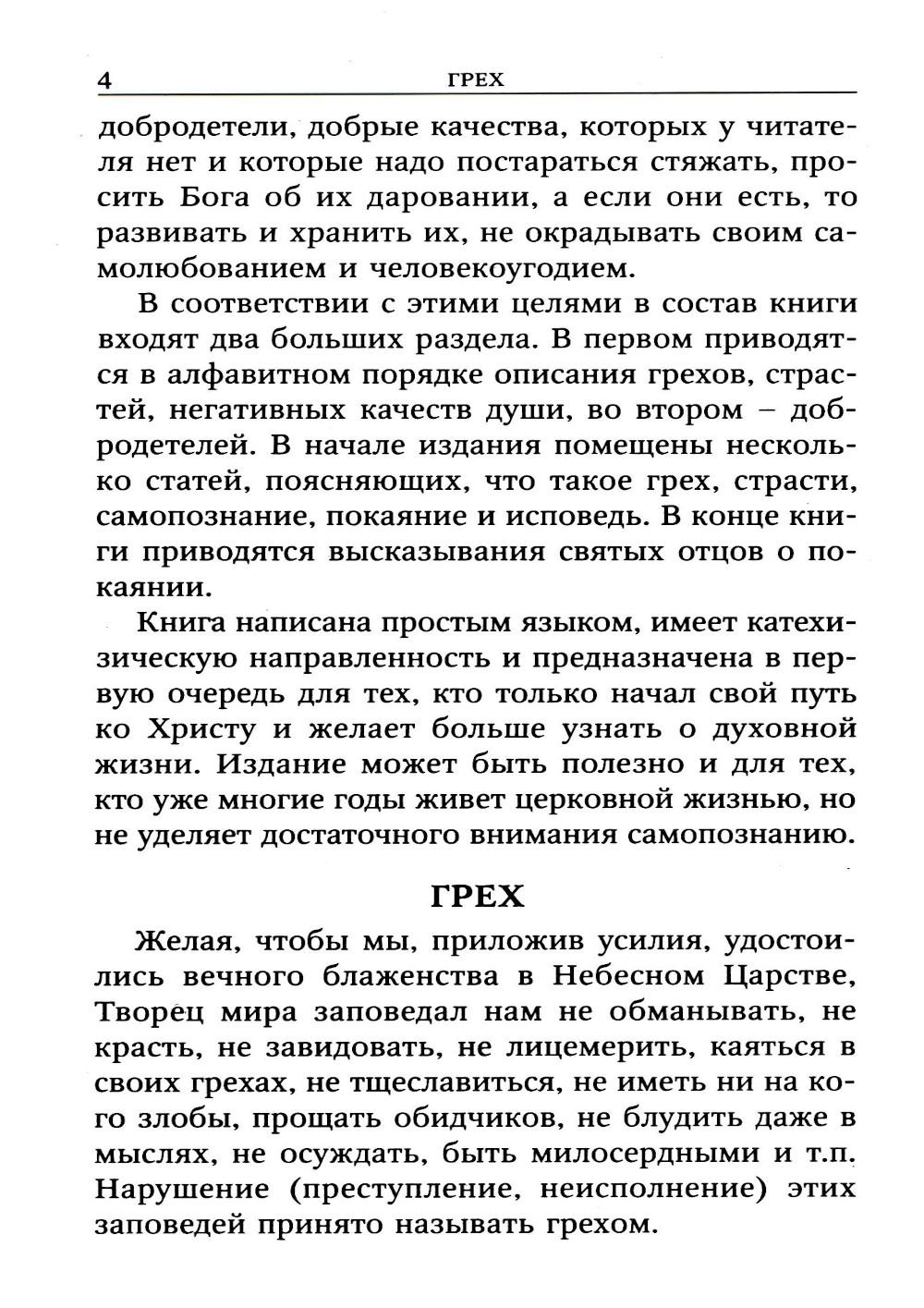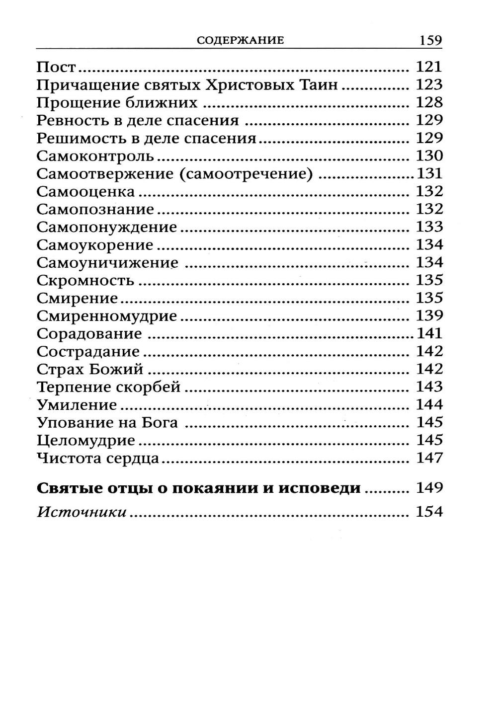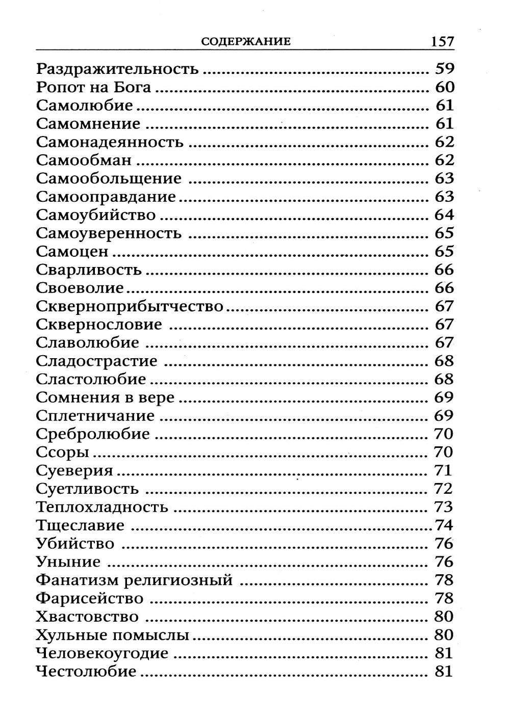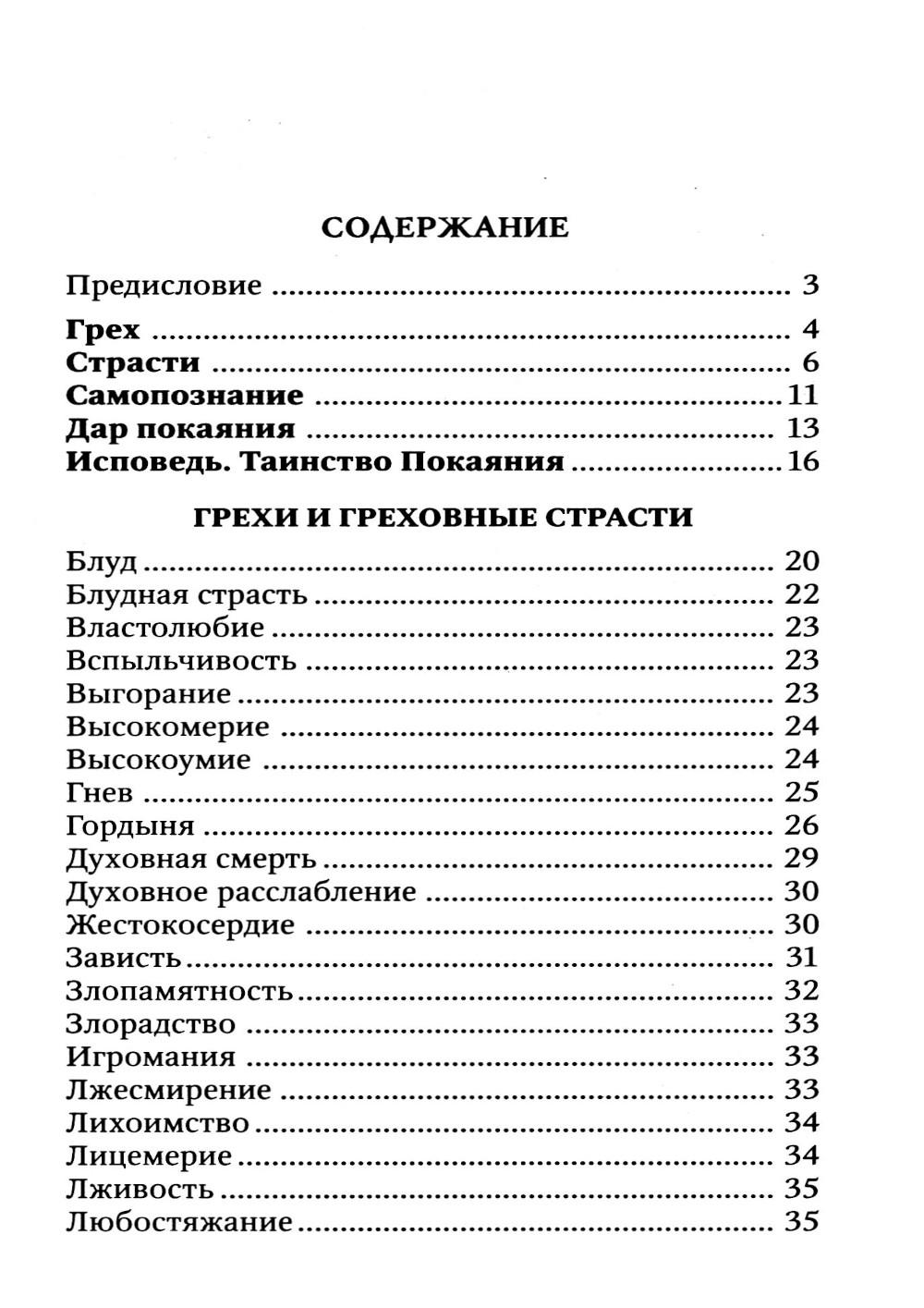 Основу книги составляют два больших раздела. В первом приводятся в алфавитном порядке описания грехов, страстей, негативных состояний души; во втором - добродетелей. В начале книги помещены статьи, дающие общее представление о грехе, страстях, самопознании, покаянии и исповеди. В приложении приводятся высказывания святых отцов о покаянии. Цель издания - помочь читателю яснее увидеть и осознать свои грехи и греховные страсти, а также те добродетели, которых у него нет и которые надо постараться стяжать, а если они есть, то хранить их, не окрадывать самолюбованием и человекоугодием. Книга написана простым языком, имеет катехизическую направленность и предназначена в первую очередь для тех, кто только начал свой путь ко Христу и желает больше узнать о духовной жизни. Издание может оказаться полезным и для тех, кто уже многие годы живет церковной жизнью, но не уделяет достаточного внимания самопознанию.| Издательство | Скрижаль |