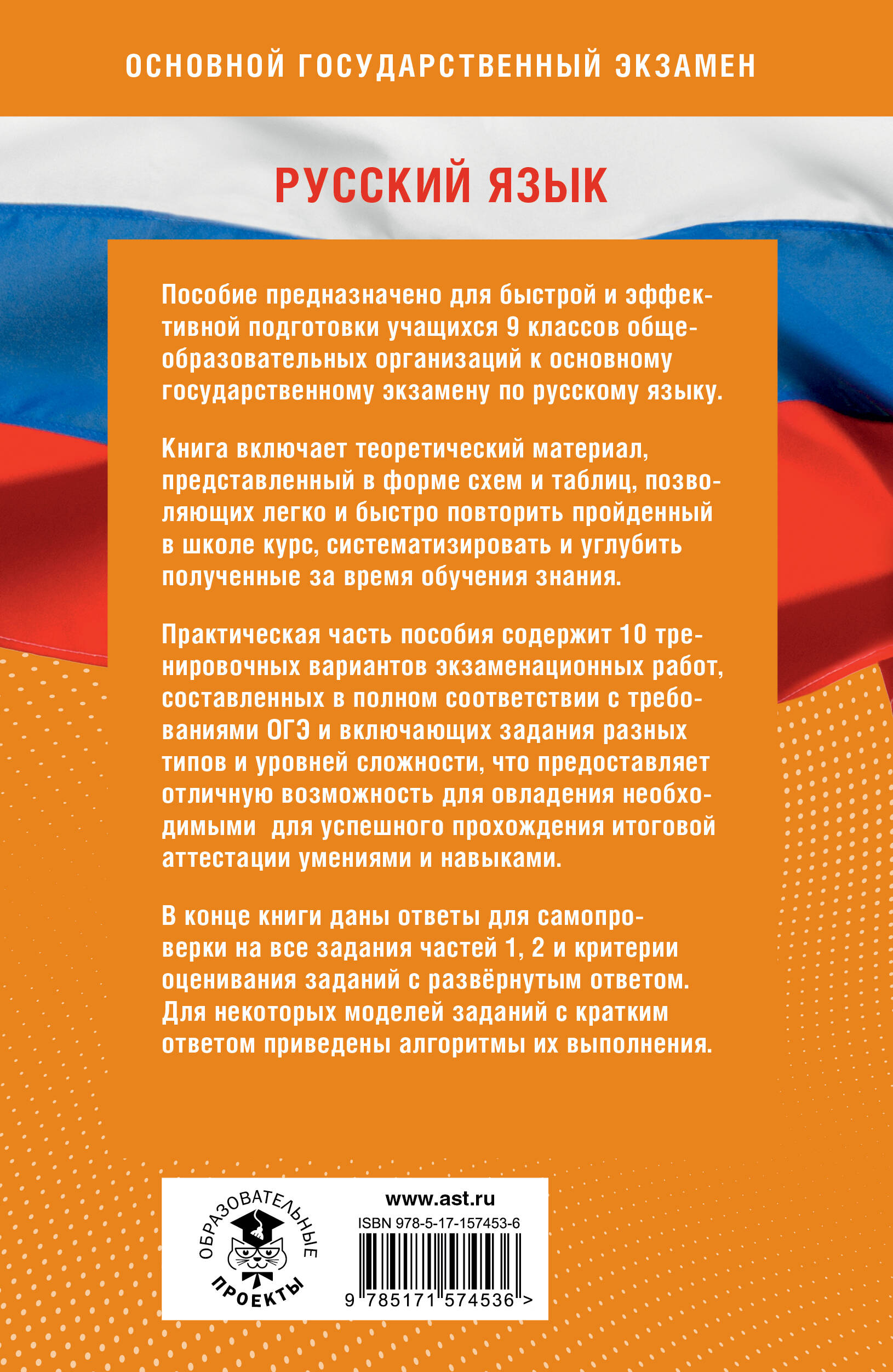 Пособие предназначено для быстрой и эффективной подготовки учащихся 9 классов классов общеобразовательных организаций к основному государственному экзамену по русскому языку. Книга включает теоретический материал, представленный в форме схем и таблиц, позволяющих легко и быстро повторить пройденный в школе курс, систематизировать и углубить полученные за время обучения знания. Практическая часть пособия содержит 10 тренировочных вариантов экзаменационных работ, составленных в полном соответствии с требованиями ОГЭ и включающих задания разных типов и уровней сложности, что предоставляет отличную возможность для овладения необходимыми для успешного прохождения итоговой аттестации умениями и навыками. В конце книги даны ответы для самопроверки на все задания частей 1, 2 и критерии оценивания заданий с развёрнутым ответом. Для некоторых моделей заданий с кратким ответом приведены алгоритмы их выполнения.| Издательство | ИЗДАТЕЛЬСТВО "АСТ" |