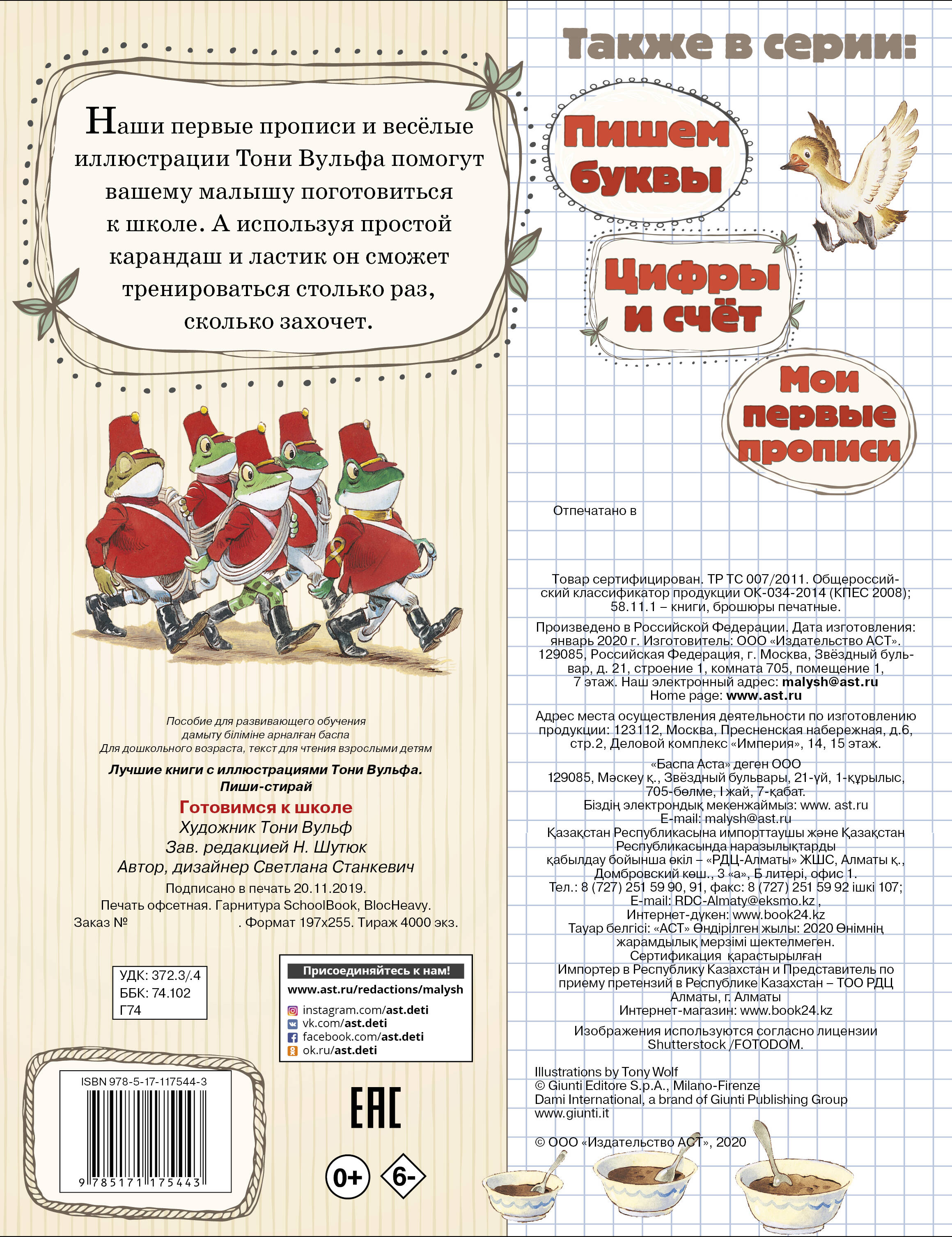 Серия "Пиши-стирай" это: - Идеальное решение для подготовки малыша к школе; - Обучение счёту, письму, развитие мелкой моторики; - Уроки выстроены от простого к сложному, что способствует лучшему усвоению материала; - Яркие и веселые иллюстрации Тони Вульфа.| Издательство | ИЗДАТЕЛЬСТВО "АСТ" |