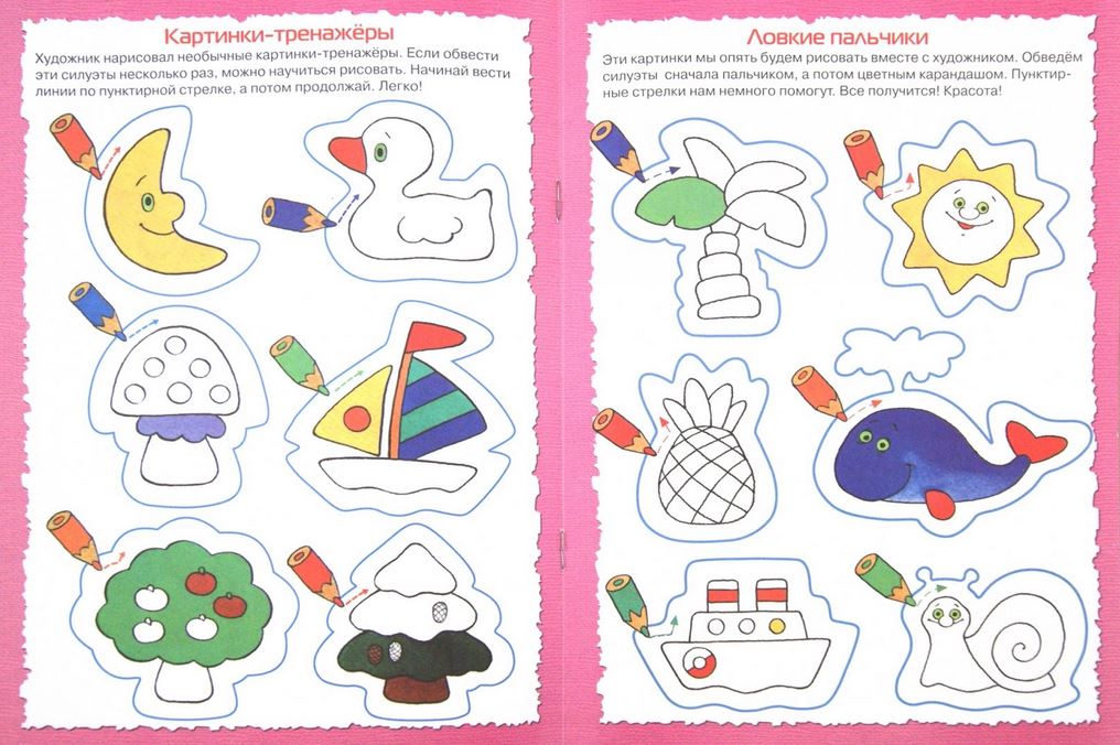 Прописи для дошколят существенно отличаются от школьных прописей. В них ребенок не пишет в буквальном смысле этого слова, а «играет» с персонажами: проводит для них дорожки, помогает преодолеть препятствия и проложить маршрут (в форме графических бордюров), раскрашивает силуэты по заданному цветовому коду, дорисовывает недостающие детали (будущие элементы письма), сочиняет и рассказывает истории. При этом, даже совсем маленькие дети получают чёткие указания: не заходить за контурную линию, проводить линию или строчку-дорожку точно по пунктиру, повторить очертания силуэта, заштриховать по зрительному ориентиру, начинать движение карандашом от стрелки в заданном направлении и обратно, и т.д. Прописи разработаны с учетом психо-физиологических особенностей дошкольников, поэтому точно адресованы детям 4-5, 5-6 и 6-7 лет.