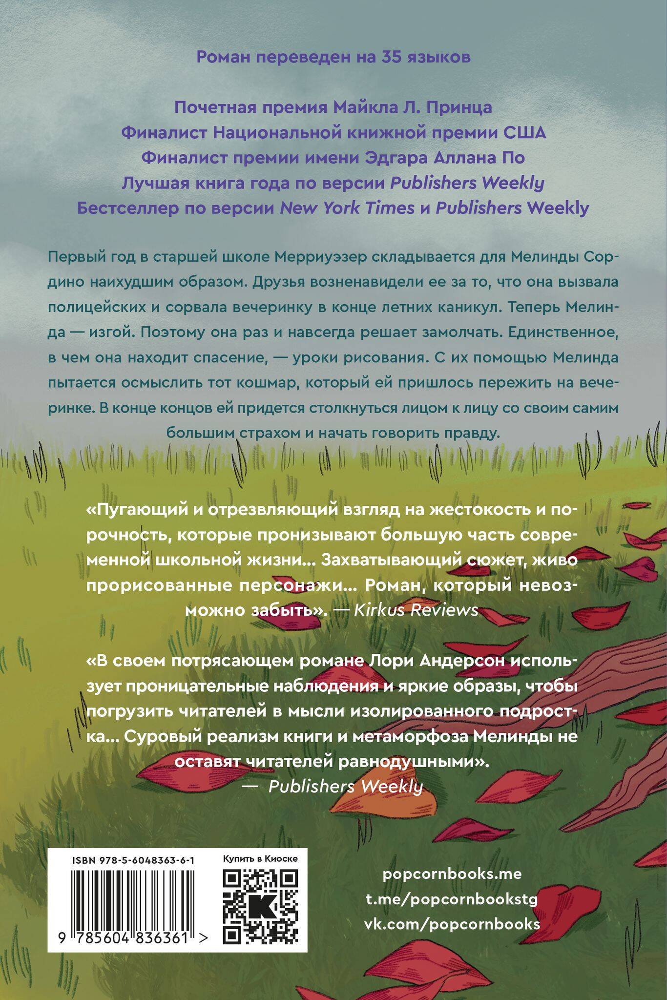 Первый год в старшей школе Мерриуэзер складывается для Мелинды Сордино наихудшим образом. Друзья возненавидели ее за то, что она вызвала полицейских и сорвала вечеринку в конце летних каникул. Теперь Мелинда изгой. Поэтому она решает замолчать - раз и навсегда. Единственное, в чем она находит спасение, - уроки рисования. С их помощью Мелинда пытается осмыслить тот кошмар, который ей пришлось пережить на вечеринке. В конце концов ей придется столкнуться лицом к лицу со своим самым большим страхом и начать говорить правду.| Издательство | ИНДИВИДУУМ ПРИНТ ООО |