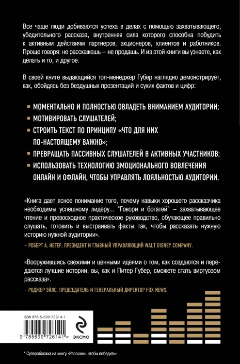 СУПЕРОБЛОЖКА НА КНИГУ "РАССКАЖИ, ЧТОБЫ ПОБЕДИТЬ" Сегмент Коммуникация Для начинающих Питер Губер - выдающийся топ-менеджер из индустрии развлечений. С помощью его книги вы овладеете искусством рассказывать так, чтобы окружающие становились пылкими приверженцами ваших идей. Мировой бестселлер| Издательство | Эксмо |