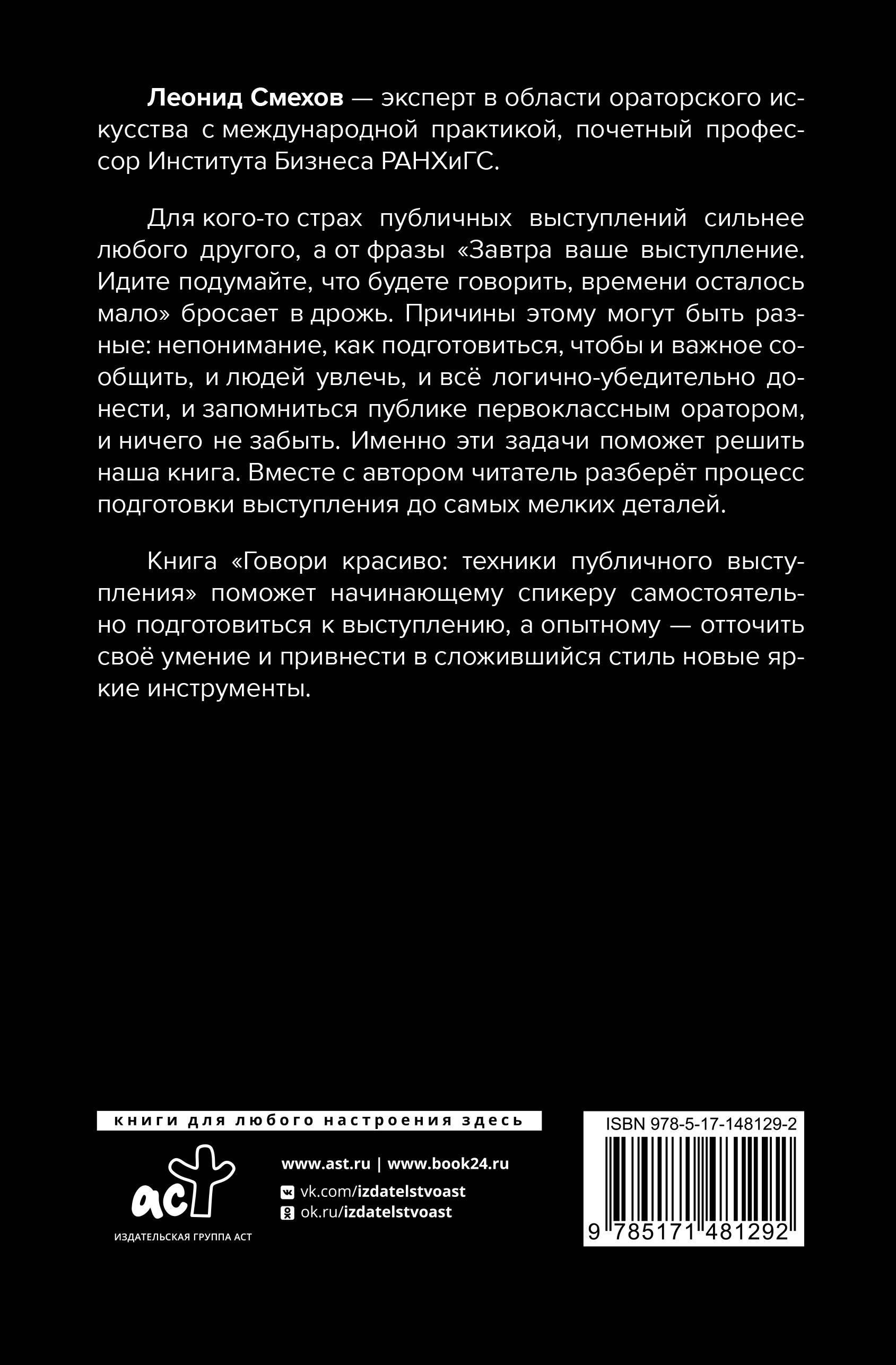 Леонид Смехов - эксперт в области ораторского искусства с международной практикой, почетный профессор Института Бизнеса РАНХиГС. Для кого-то страх публичных выступлений сильнее любого другого, а от фразы: "Завтра ваше выступление. Идите подумайте, что будете говорить, времени осталось мало" бросает в дрожь. Причины этому могут быть разные: непонимание, как подготовиться, чтобы и важное сообщить, и людей увлечь, и всё логично-убедительно донести, и запомниться публике первоклассным оратором, и ничего не забыть. Именно эти задачи поможет решить наша книга. Вместе с автором читатель разберёт процесс подготовки выступления до самых мелких деталей. Книга "Говори красиво: техники публичного выступления" поможет начинающему спикеру самостоятельно подготовиться к выступлению, а опытному - отточить своё умение и привнести в сложившийся стиль новые яркие инструменты и техники. Ведь умение говорить красиво и грамотно, производить приятное впечатление, выступать на публике дает возможность добиться успеха в любой профессиональной сфере.| Издательство | ИЗДАТЕЛЬСТВО "АСТ" |