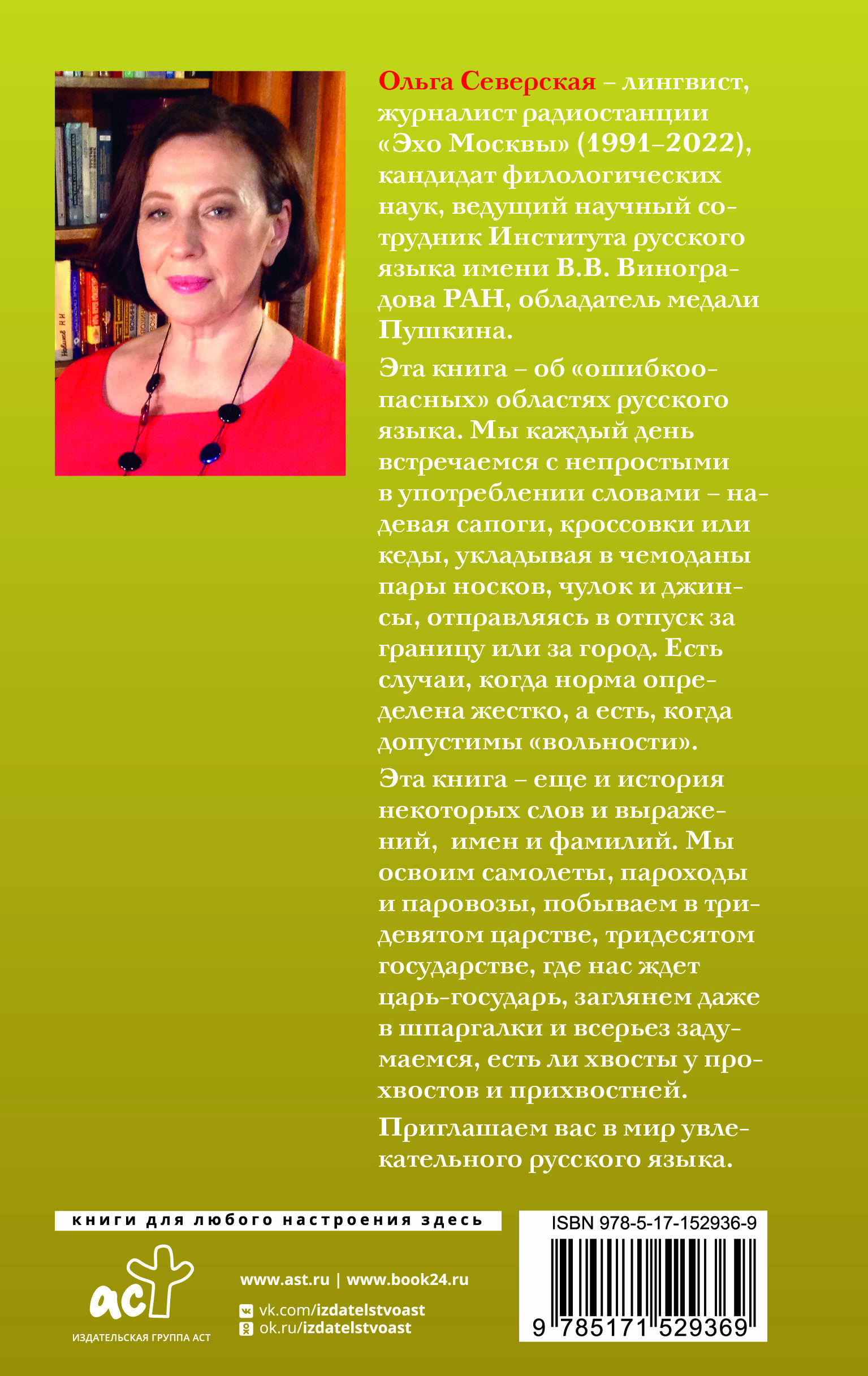 Ольга Северская - лингвист, журналист радиостанции "Эхо Москвы" (1991-2022), кандидат филологических наук, ведущий научный сотрудник Института русского языка имени В.В. Виноградова РАН, обладатель медали Пушкина. Эта книга - об "ошибкоопасных" областях русского языка. Мы каждый день встречаемся с непростыми в употреблении словами - надевая сапоги, кроссовки или кеды, укладывая в чемоданы пары носков, чулок и джинсы, отправляясь в отпуск за границу или за город. Есть случаи, когда норма определена жестко, а есть, когда допустимы "вольности". Эта книга - еще и история некоторых слов и выражений, имен и фамилий. Мы освоим самолеты, пароходы и паровозы, побываем в тридевятом царстве, тридесятом государстве, где нас ждет царь-государь, заглянем даже в шпаргалки и всерьез задумаемся, есть ли хвосты у прохвостов и прихвостней. Приглашаем вас в мир увлекательного русского языка.| Издательство | ИЗДАТЕЛЬСТВО "АСТ" |