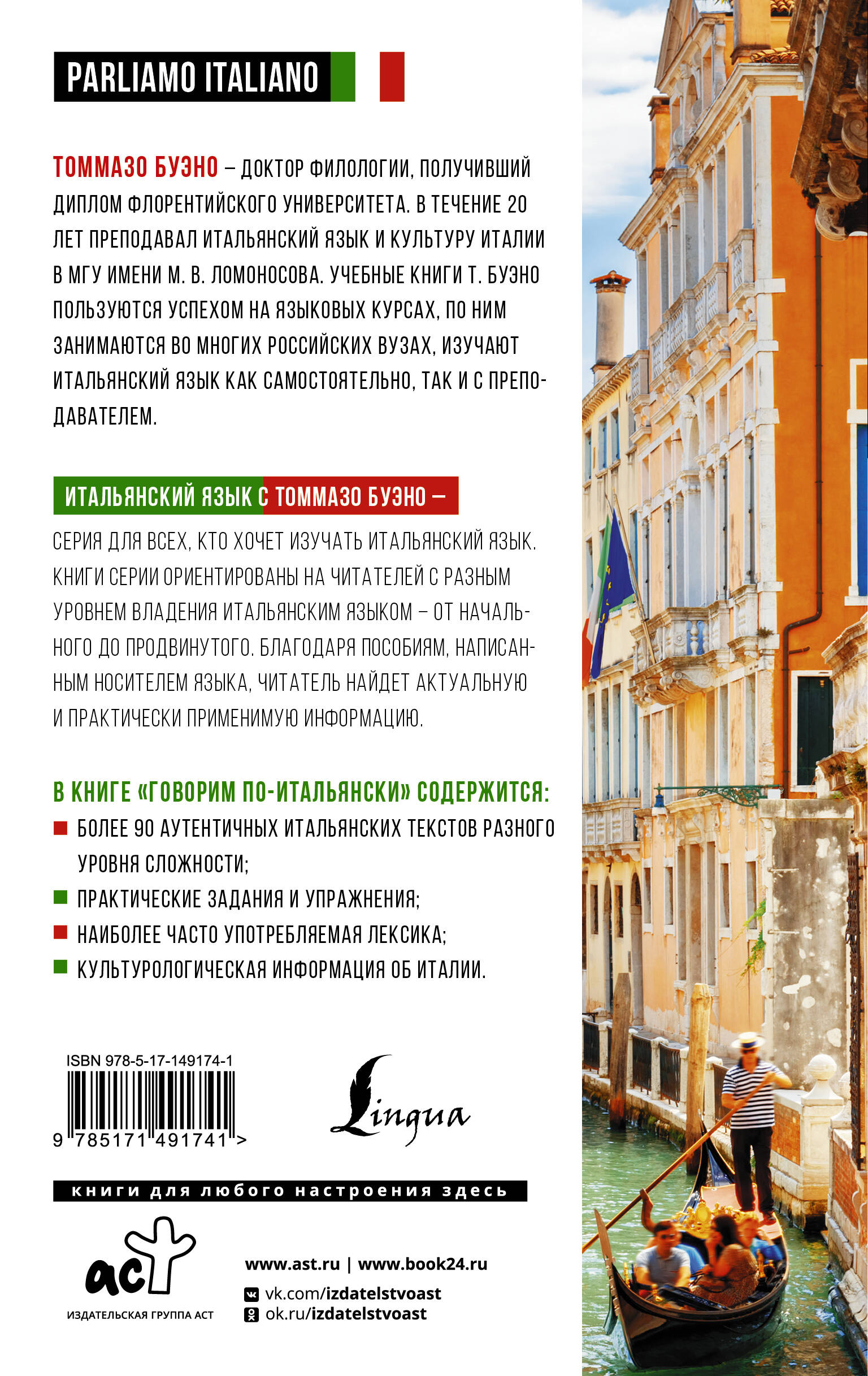 Томмазо Буэно - доктор филологии, получивший диплом Флорентийского университета. В течение 20 лет преподавал итальянский язык и культуру Италии в МГУ имени М. В. Ломоносова. «Говорим по-итальянски» - пособие, написанное носителем языка полностью на итальянском языке, благодаря чему вы сразу погрузитесь в язык и быстрее заговорите на итальянском. Эффективнее всего изучать язык в контексте. Пособие помогает прорабатывать слова и фразы, которые вы только что прочитали в текстах. Как лучше заниматься по пособию: • выделить 1-1,5 часа на занятие; • один или несколько раз прочитать текст; • проверить, что после прочтения вы понимаете в тексте все слова и конструкции; • выполнить первый блок заданий на проработку грамматики и лексики; • ответить на вопросы по содержанию текста; • перейти к творческим заданиям; • на всех этапах обязательно используйте фразы и конструкции из текста. Такой подход поможет естественнее и проще запоминать лексику и грамматику, так как таким же способом вы запоминаете конструкции и в родном языке.| Издательство | АСТ |