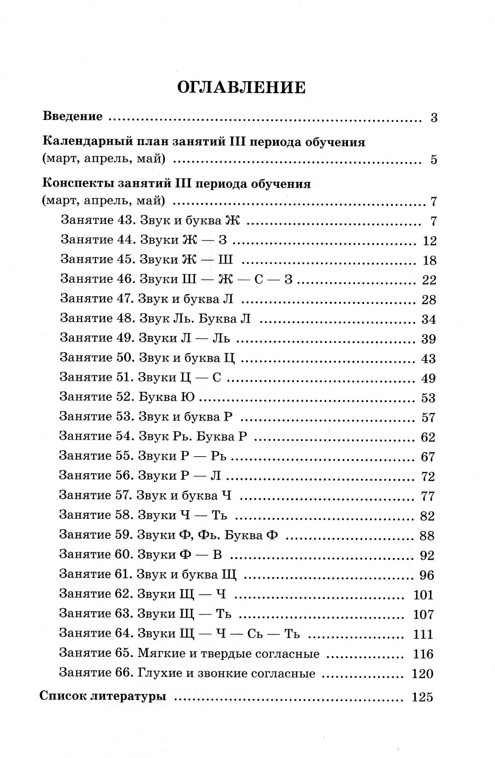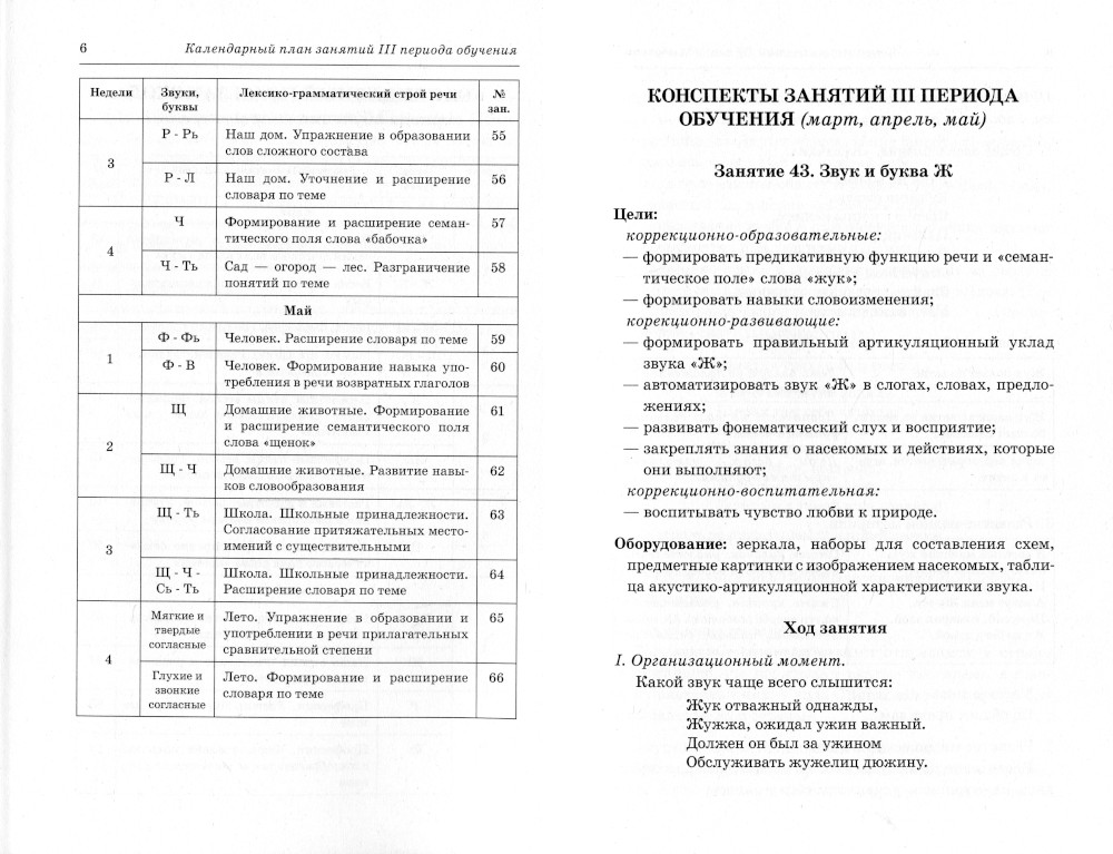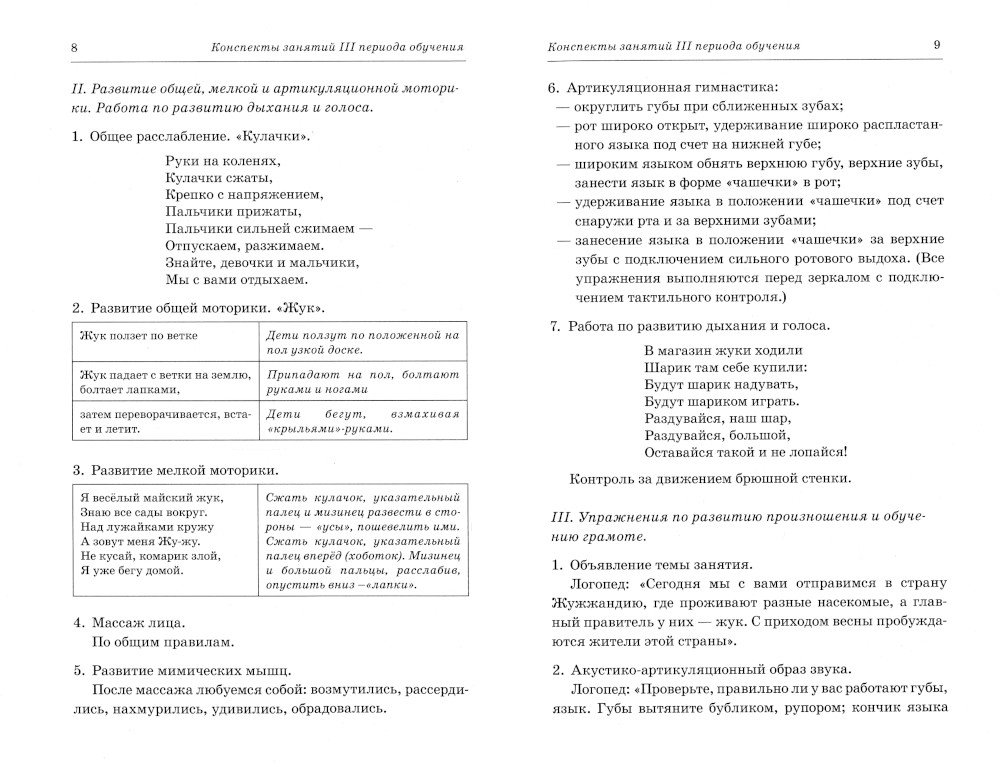 Каждое занятие комплексное, проводится на материале одной лексической темы и содержит подобранные по степени возрастающей сложности упражнения для развития общей, артикуляционной и мелкой моторики, речевого дыхания, голоса, произношения и обучения детей грамоте.