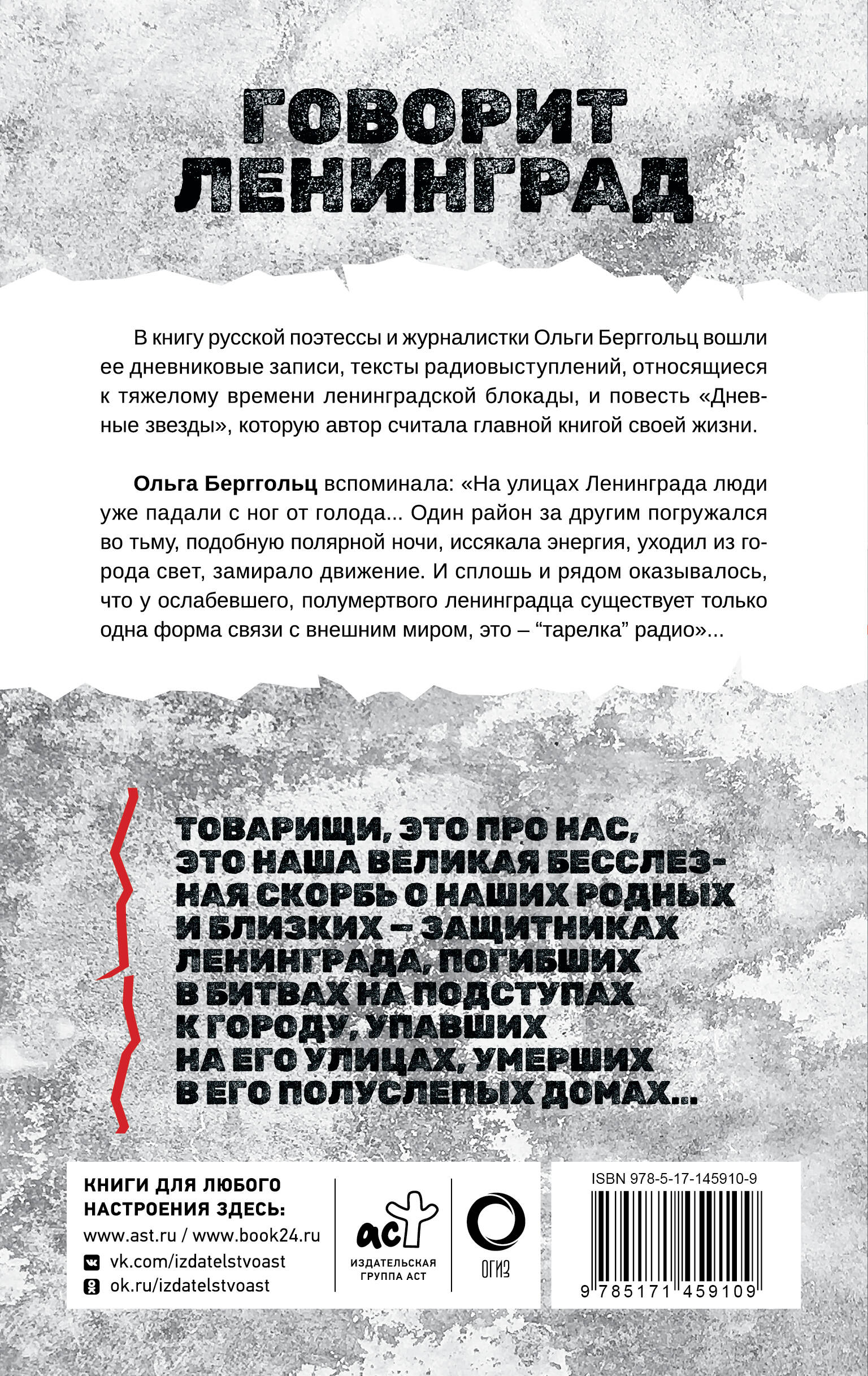 В книгу русской поэтессы и журналистки Ольги Берггольц вошли ее дневниковые записи, тексты радио-выступлений, относящиеся к тяжелому времени ленинградской блокады, и повесть "Дневные звезды", которую автор считала главной книгой своей жизни. Ольга Берггольц вспоминала: "На улицах Ленинграда люди уже падали с ног от голода... Один район за другим погружался во тьму, подобную полярной ночи, иссякала энергия, уходил из города свет, замирало движение. И сплошь и рядом оказывалось, что у ослабевшего, полумертвого ленинградца существует только одна форма связи с внешним миром, это - "тарелка" радио"..| Издательство | ИЗДАТЕЛЬСТВО "АСТ" |