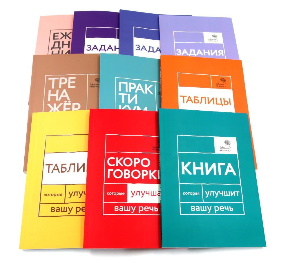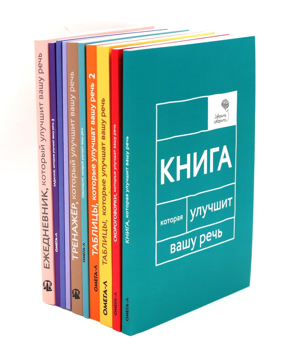 В комплект входят десять книг серии «Говорите, говорите»: - «Ежедневник, который улучшит вашу речь» (поможет улучшать свою речь за 5-10 минут в день, практически не отрываясь от дел); - «Тренажер, который улучшит вашу речь» (задания для улучшения памяти, внимания и речи); - «Практикум, который улучшит вашу речь» (упражнения для улучшения дикции и произношения); - «Скороговорки, которые улучшат вашу речь» (слоговые цепочки, скороговорки и визуальные таблицы для работы над дикцией); - «Задания, которые улучшат вашу речь» (три книги заданий для пополнения словарного запаса, тренировки навыка речевой импровизации, улучшения памяти и качества устной речи); - «Таблицы, которые улучшат вашу речь» (две книги с визуальными таблицами для работы с гласными и согласными звуками); - «Книга, которая улучшит вашу речь» (тренировка и профилактика снижения когнитивных функций (памяти, логического мышления, внимания), стимуляция речемыслительной деятельности). Пособия адресованы самому широкому кругу людей: специалистам (логопедам, нейропсихологам) в работе с пациентами, тренерам по технике речи и публичным выступлениям, работникам телевидения и радио, театральным педагогам и студентам театральных вузов, а также всем, кто любит самосовершенствоваться или хочет сделать свою речь лучше.| Издательство | Омега-Л |