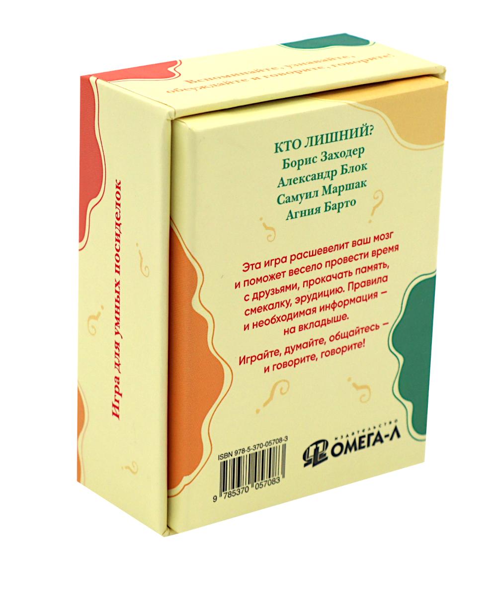 «Кто лишний?» - уникальная игра из 100 игровых карточек от авторов проекта «Говорите, говорите». «Даже самый совершенный в мире мозг ржавеет без дела», - утверждал Шерлок Холмс. Как и мышцы тела, мозг надо тренировать! Эта игра расшевелит ваш мозг и поможет весело провести время с друзьями, прокачать память, смекалку, логическое мышление и эрудицию. Правила и необходимая информация - внутри коробки. Играйте, думайте, общайтесь - и говорите, говорите!| Издательство | Омега-Л |