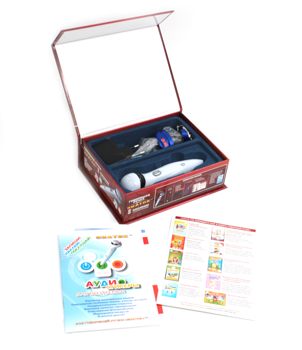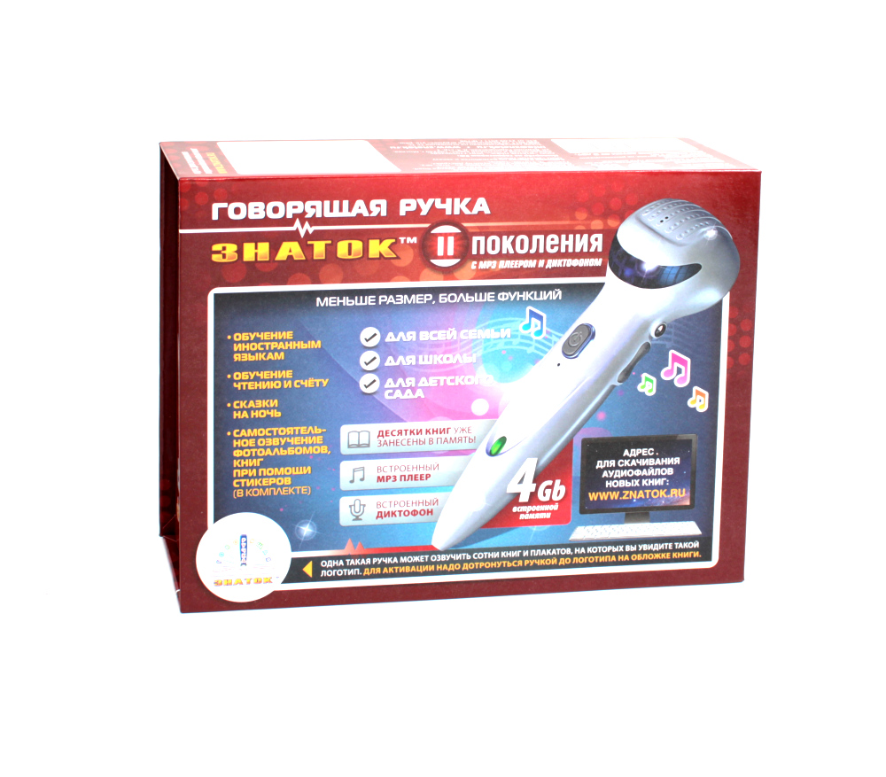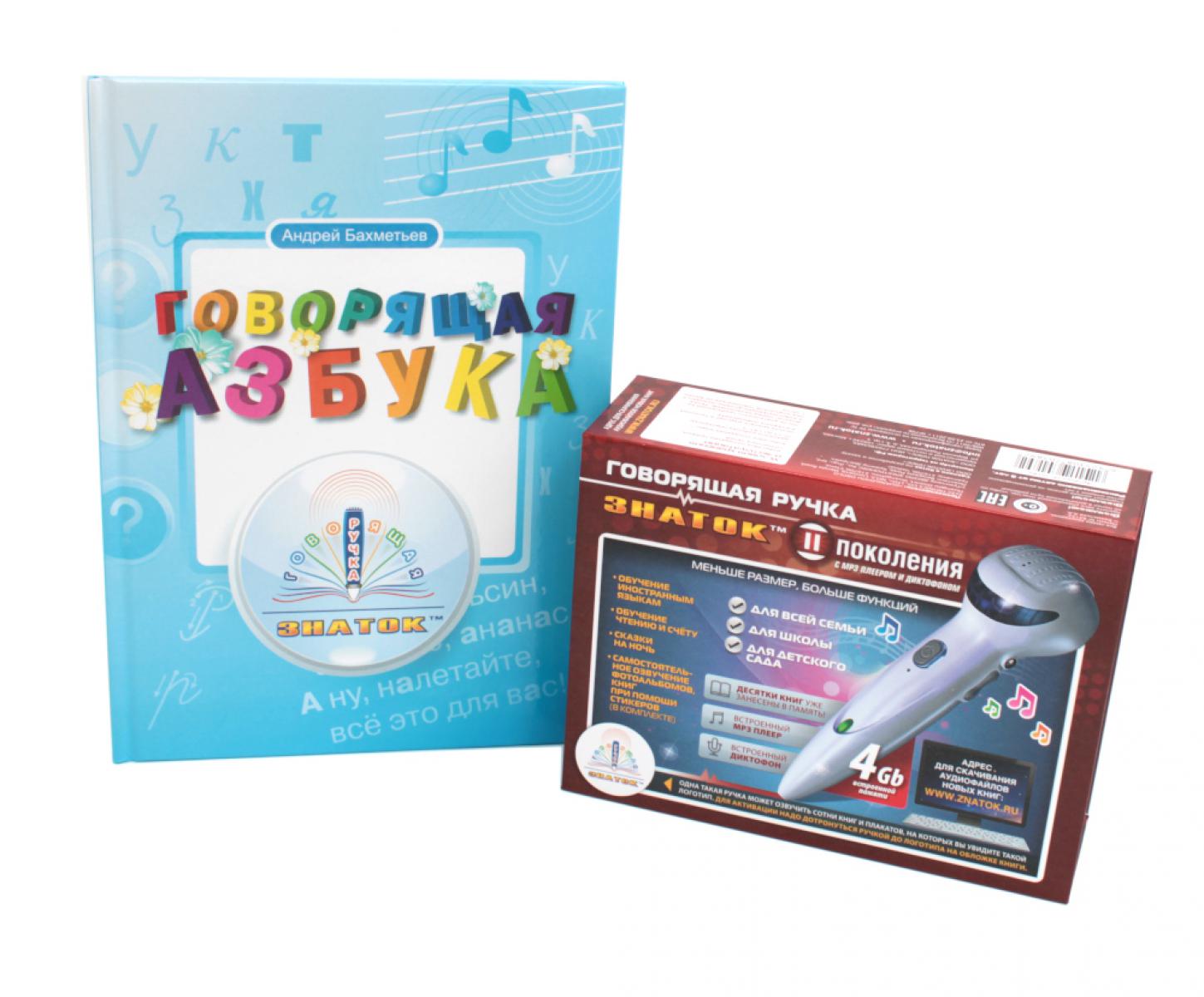 Комплект из книги и говорящей ручки: Говорящая азбука «Говорящая» азбука позволит ребёнку в весёлой форме ознакомиться с алфавитом, послушать и выучить стихи про каждую букву, загадки, узнать много новой информации. Маленькие читатели смогут проверить свои знания, ответив на предложенные вопросы, и заодно разучить весёлую песенку про алфавит. - Все тексты и стихи озвучены профессиональными актёрами; - Все основные персонажи иллюстраций озвучены; - При прикосновении «Говорящей ручкой ЗНАТОК»™ к иллюстрациям звучат дополнительные пояснения; - Звуковые экзамены с самостоятельным поиском правильных ответов. Ручка II поколения 4GB Очень простая в использовании уникальная помощница, предназначенная для эффективного обучения иностранным языкам, как детей, так и взрослых. Она так же поможет обучить детей чтению и счёту, расскажет сказку на ночь, познакомит ребёнка с окружающим миром. Причём, ручка озвучивает не только слова, но и рисунки! Для превращения ручки в удивительного рассказчика и доброго учителя достаточно коснуться, расположенного на книге или плакате, вот такого логотипа > В память ручки (4 GB) уже внесены книги, указанные на обратной стороне коробки и в инструкции. Аудиофайлы других книг можно бесплатно скачать в разделе «Книги» или с информационного сайта www.books.znatok.ru, подсоединив выключенную ручку при помощи прилагаемого USB-кабеля к компьютеру. Если памяти будет не хватать, то файлы можно перенести из ручки в компьютер, и создать там свою библиотеку аудиофайлов, при необходимости закачивая их в ручку. Особого внимания заслуживают входящие в набор аудиостикеры и их применение.| Издательство | ЗНАТОК |