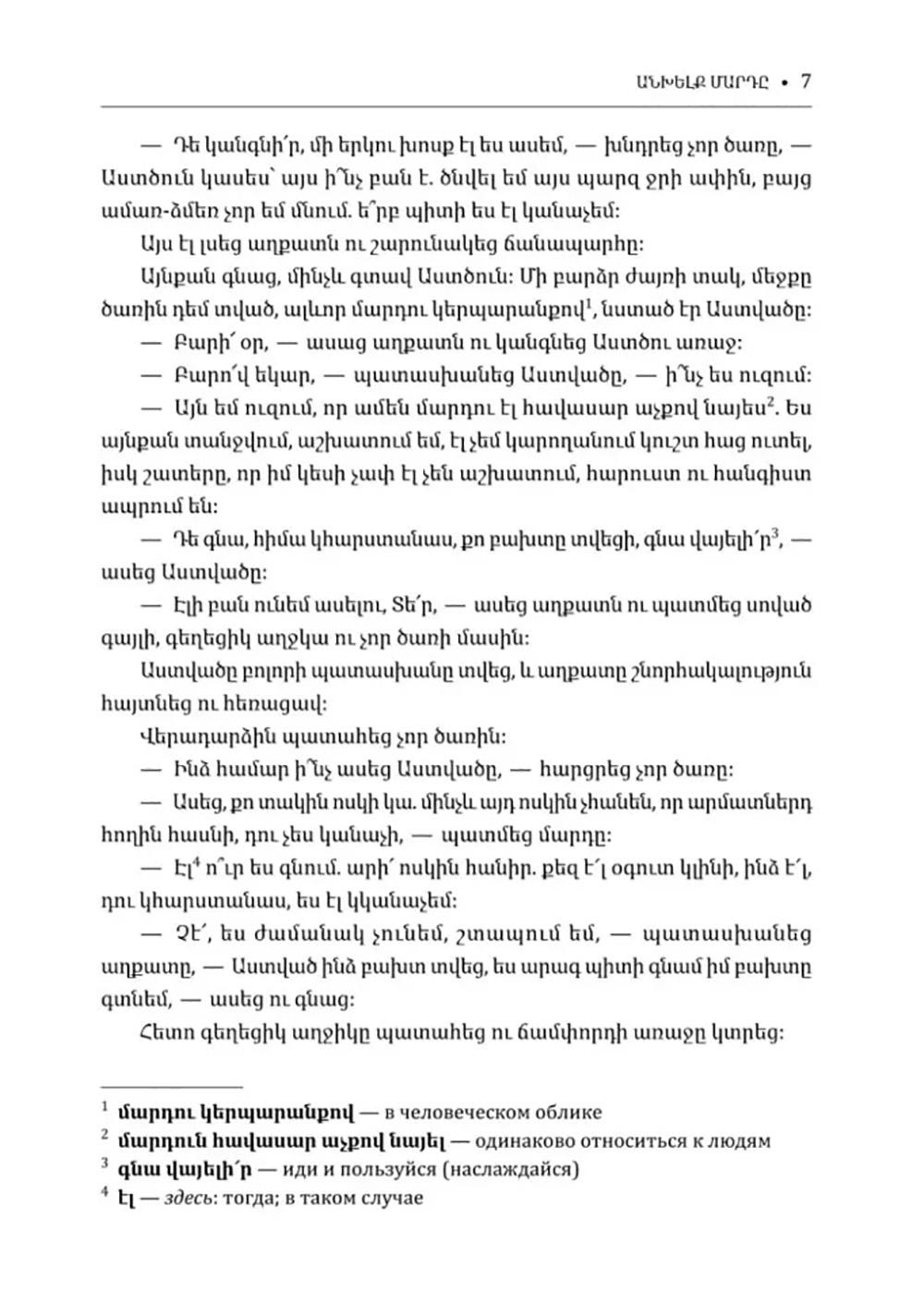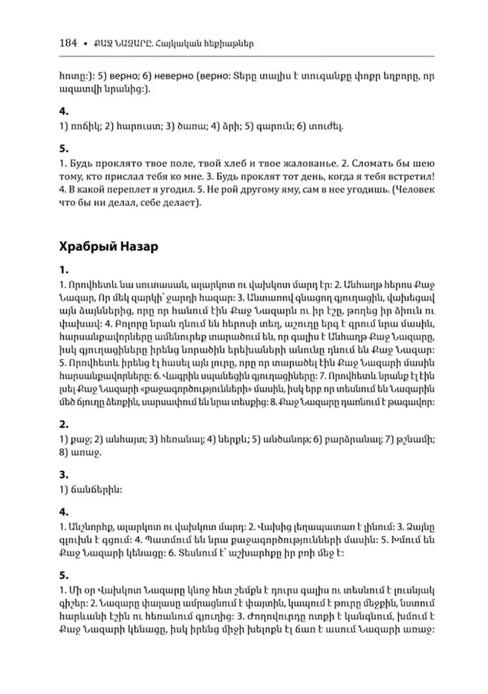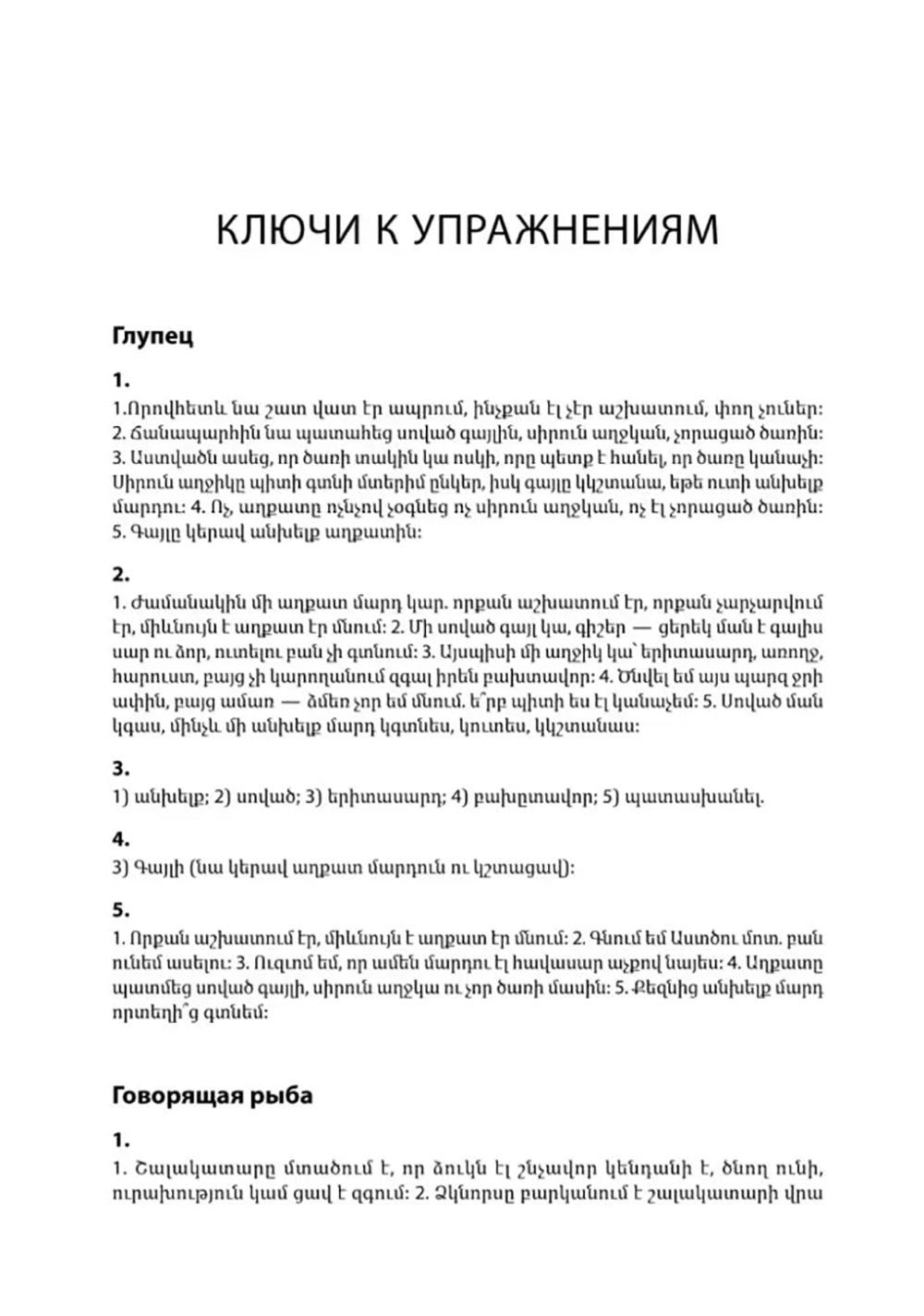 В сборник вошли 10 армянских народных сказок и их художественные переводы на русский язык. Для удобства читателя каждая сказка сопровождается словарем и упражнениями для усвоения и тренировки употребления базовой и более сложной лексики, распространенных грамматических конструкций, устойчивых выражений. Книга предназначена для тех, кто изучает армянский язык самостоятельно или с преподавателем, а также интересуется армянской культурой в целом. Рекомендуемый уровень владения армянским языком: В1-В2 и выше. Aрмянский текст приводится в обработке известных армянских авторов. Составление, перевод, упражнения и словарь Н. Чарчоглян.| Издательство | Каро |