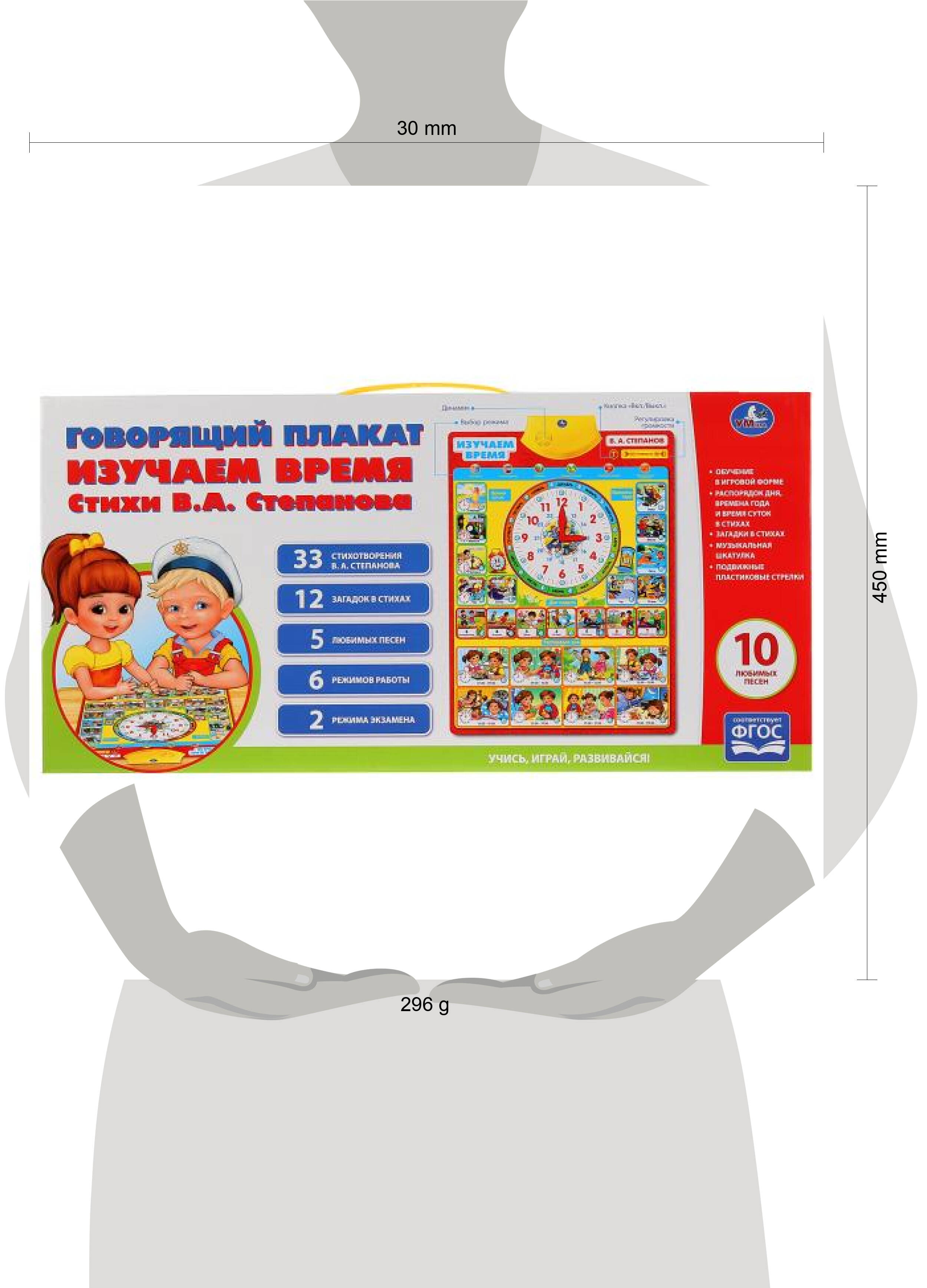 Аннотация: Говорящий плакат.Изучаем Время 33 стиха В.Степанова,12 загадок,5 любимых песен.ТМ"УМКА" в кор.48шт