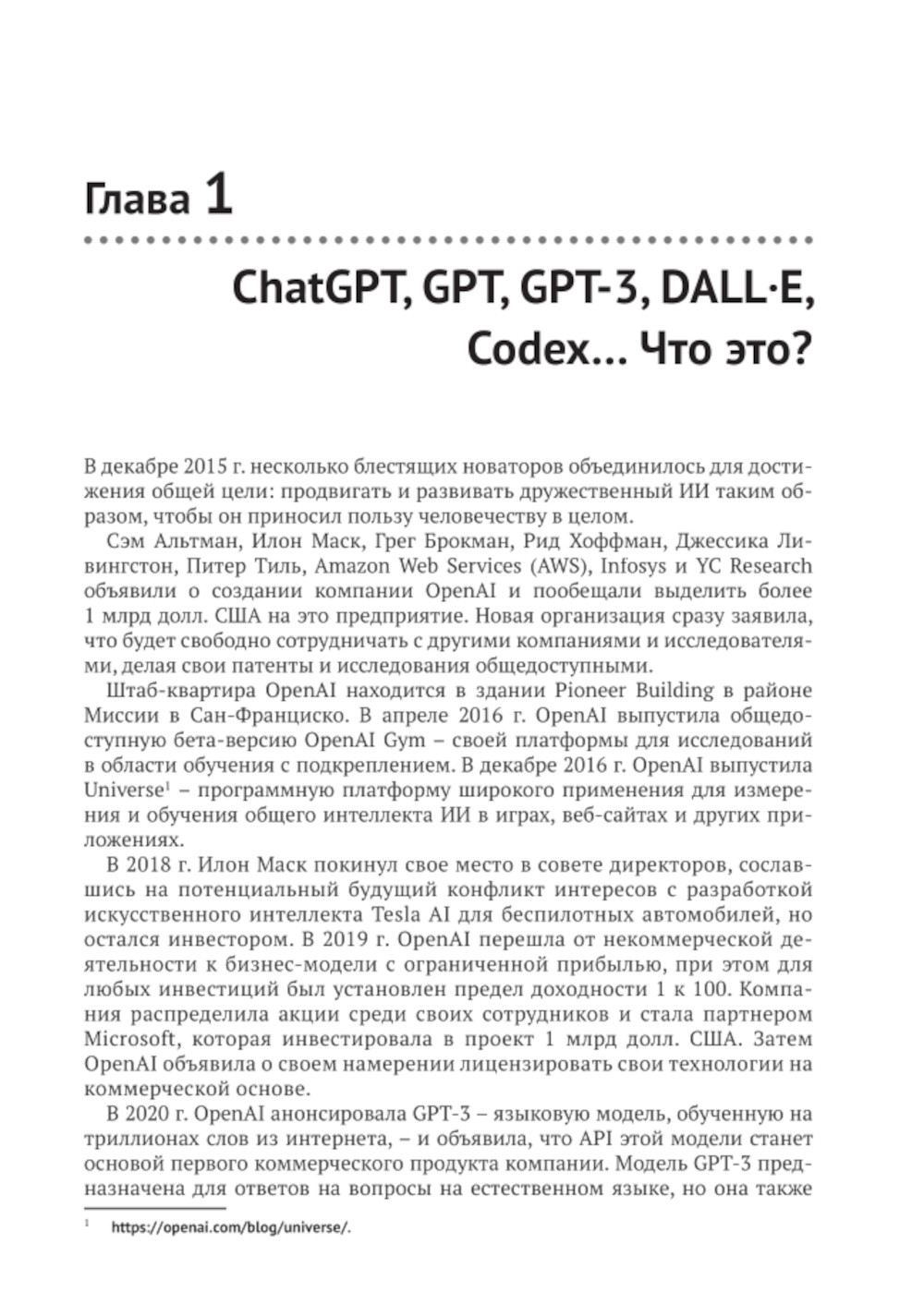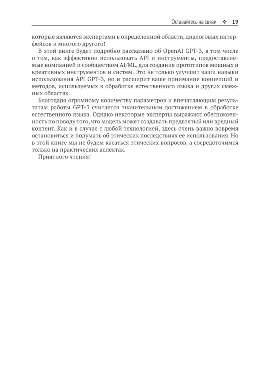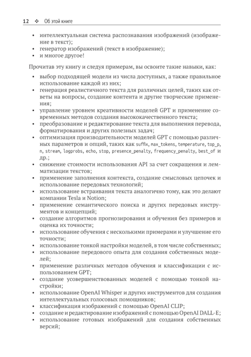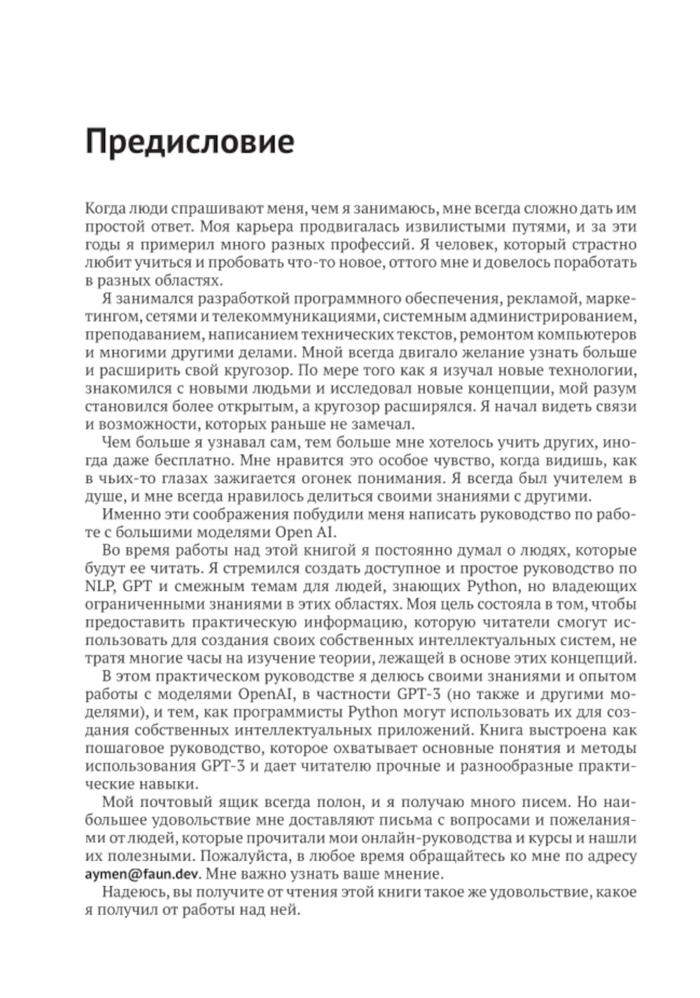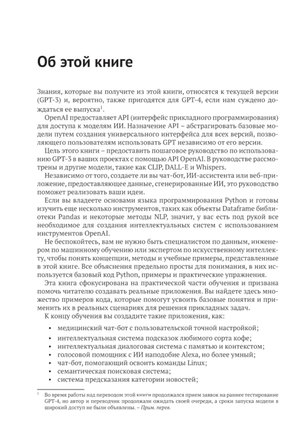 Цель книги - предоставить пошаговое руководство по использованию GPT-3 в ваших проектах с помощью API OpenAI. Также рассмотрены и другие модели, такие как CLIP, DALL-E и Whispers.