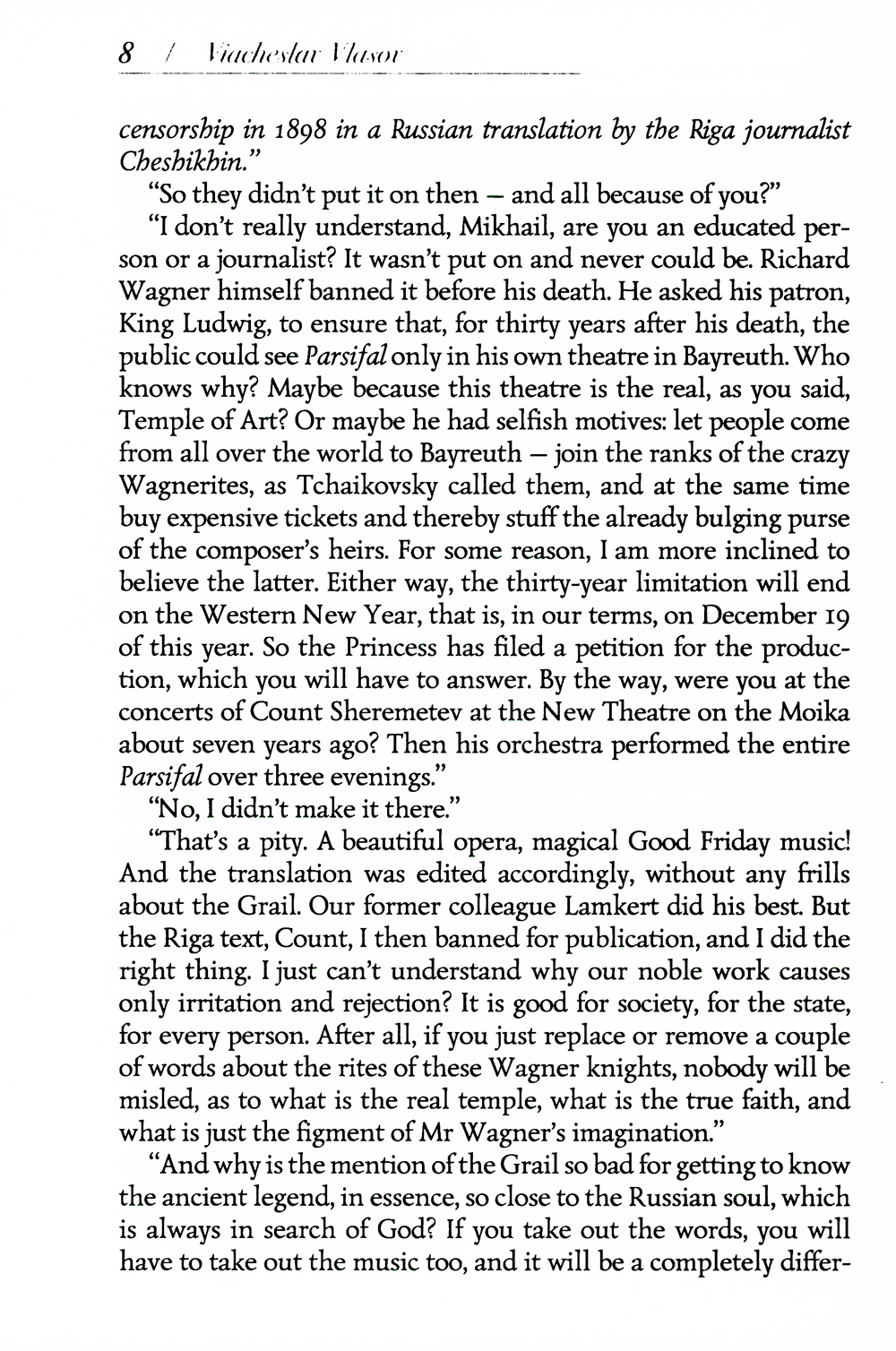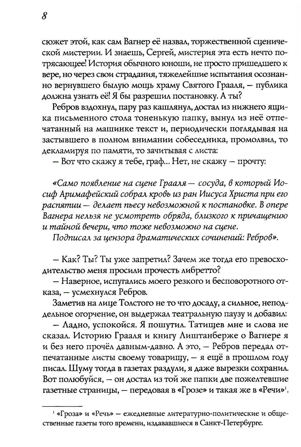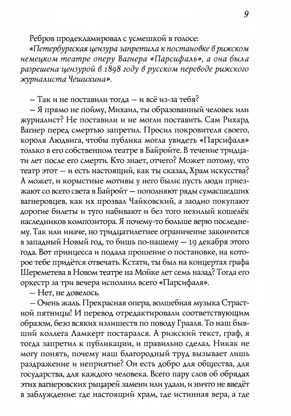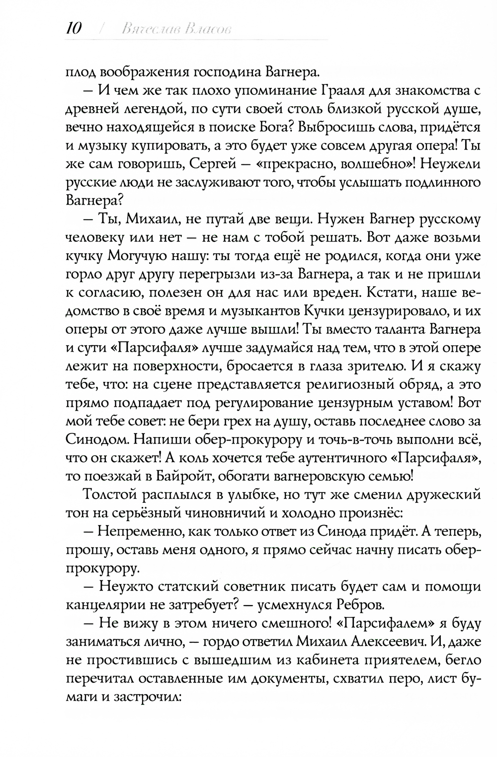 Повесть Вячеслава Власова «Грааль и Цензор» посвящена истории первой постановки торжественной сценической мистерии Рихарда Вагнера «Парсифаль» в Российской империи в 1913 году. Её герои - цензоры, служебный долг которых борется с их жгучим желанием познакомить просвещённую публику с высочайшим музыкальным искусством, подарить соотечественникам колоссальное духовное переживание. На страницах произведения переплелись великая музыка, театральные интриги, история нашей страны начала XX века и актуальные размышления об искусстве.| Издательство | ИПО "У Никитских ворот" |