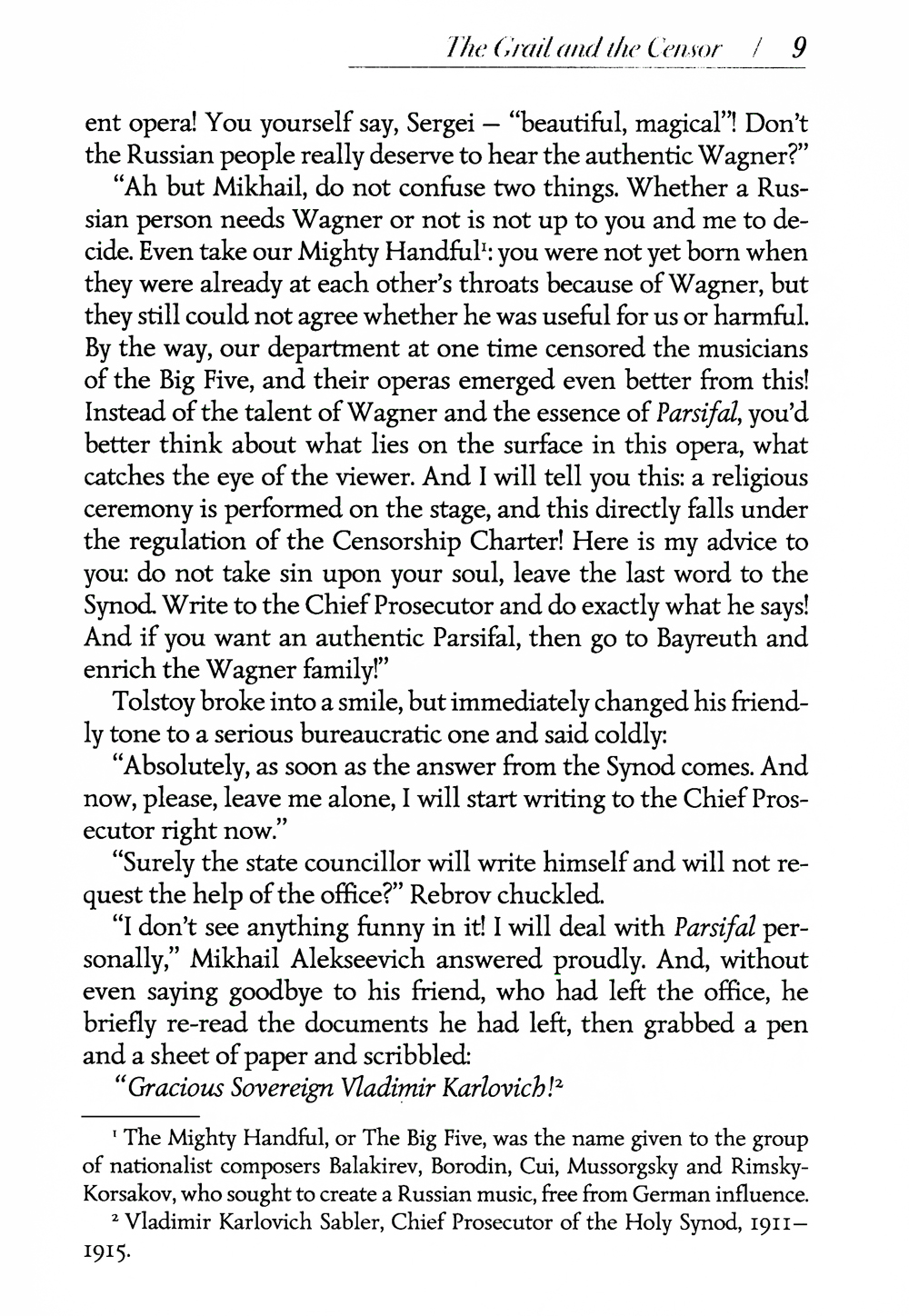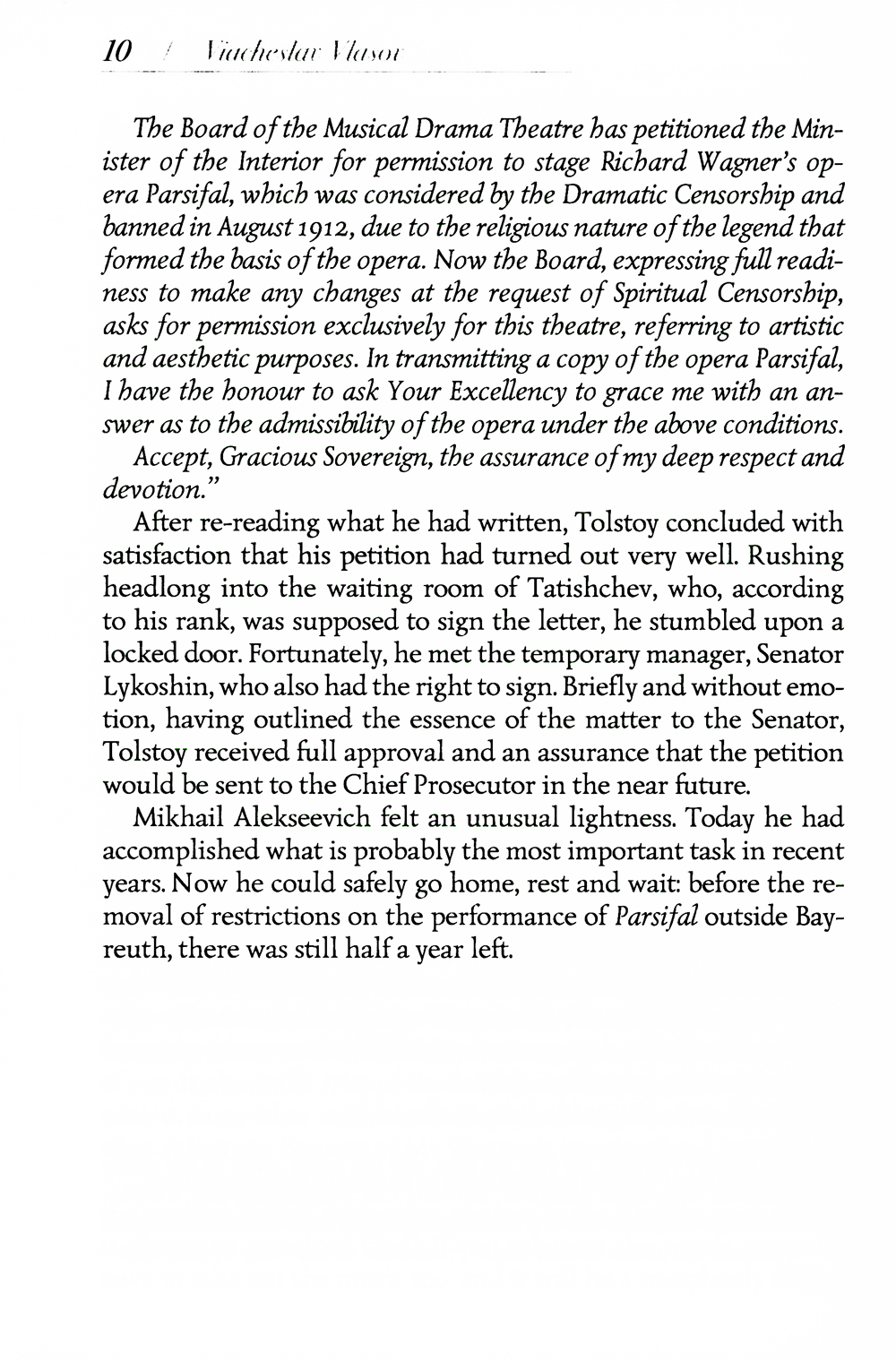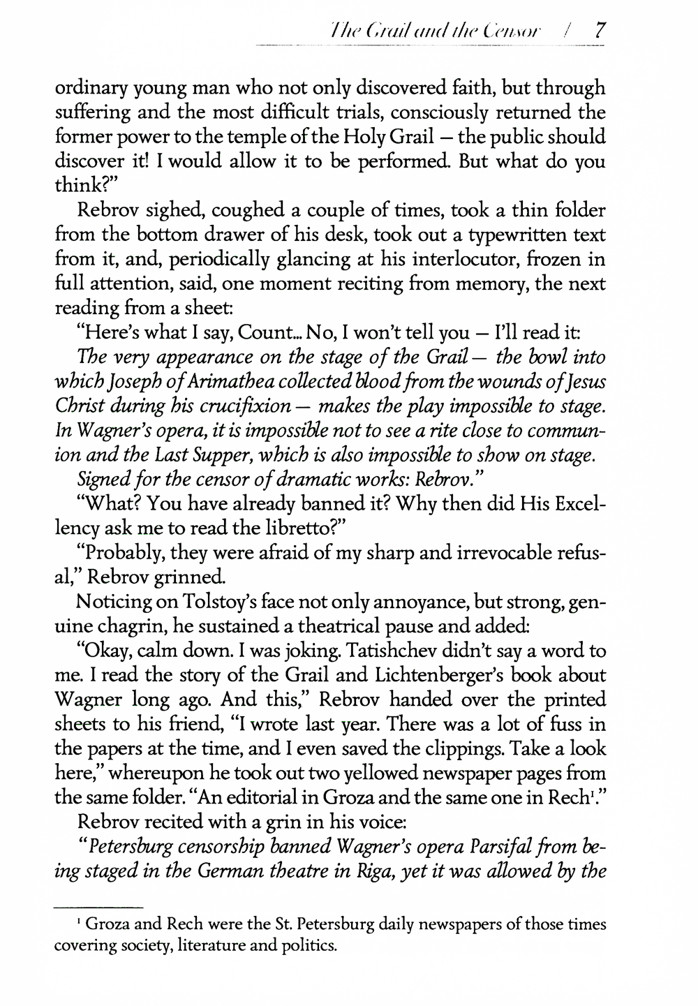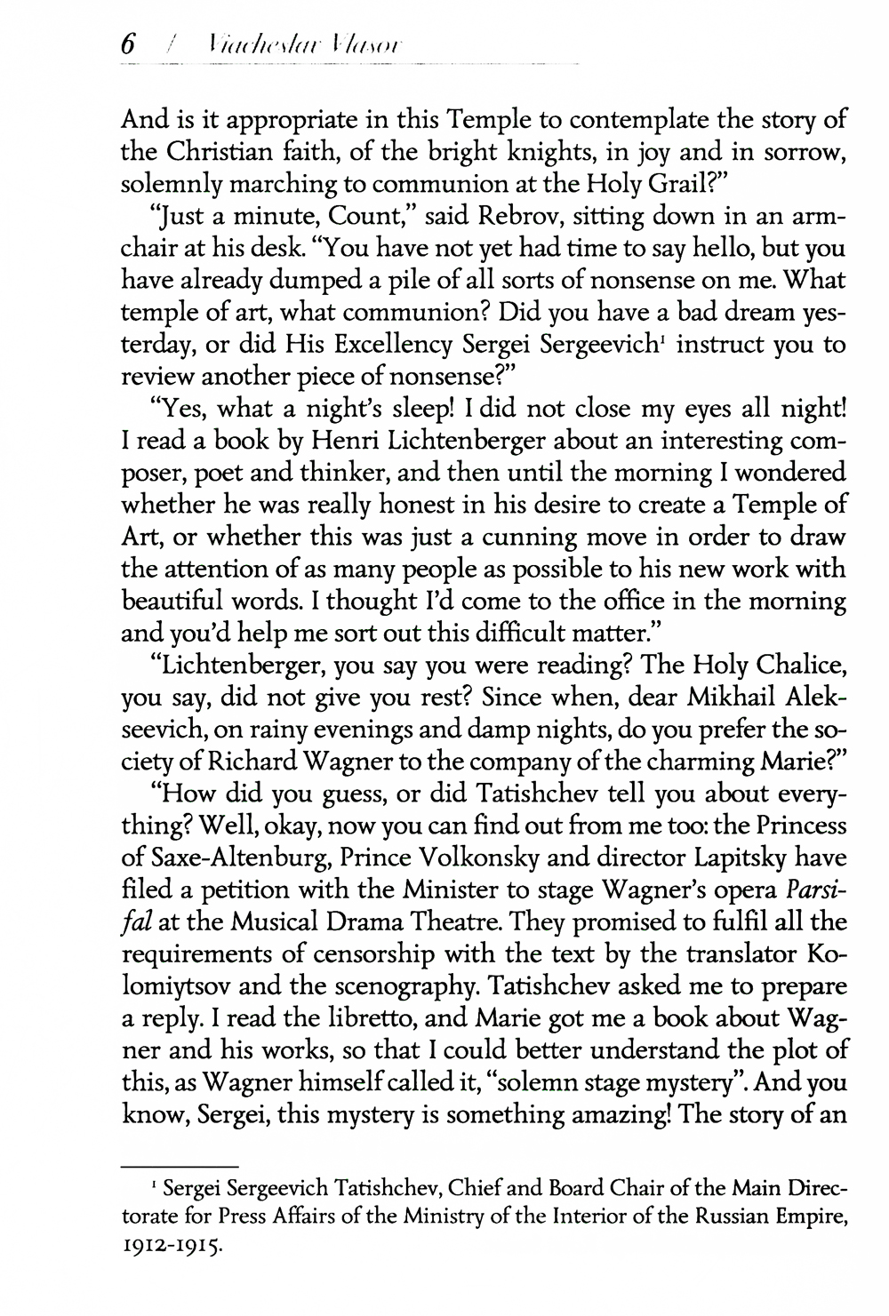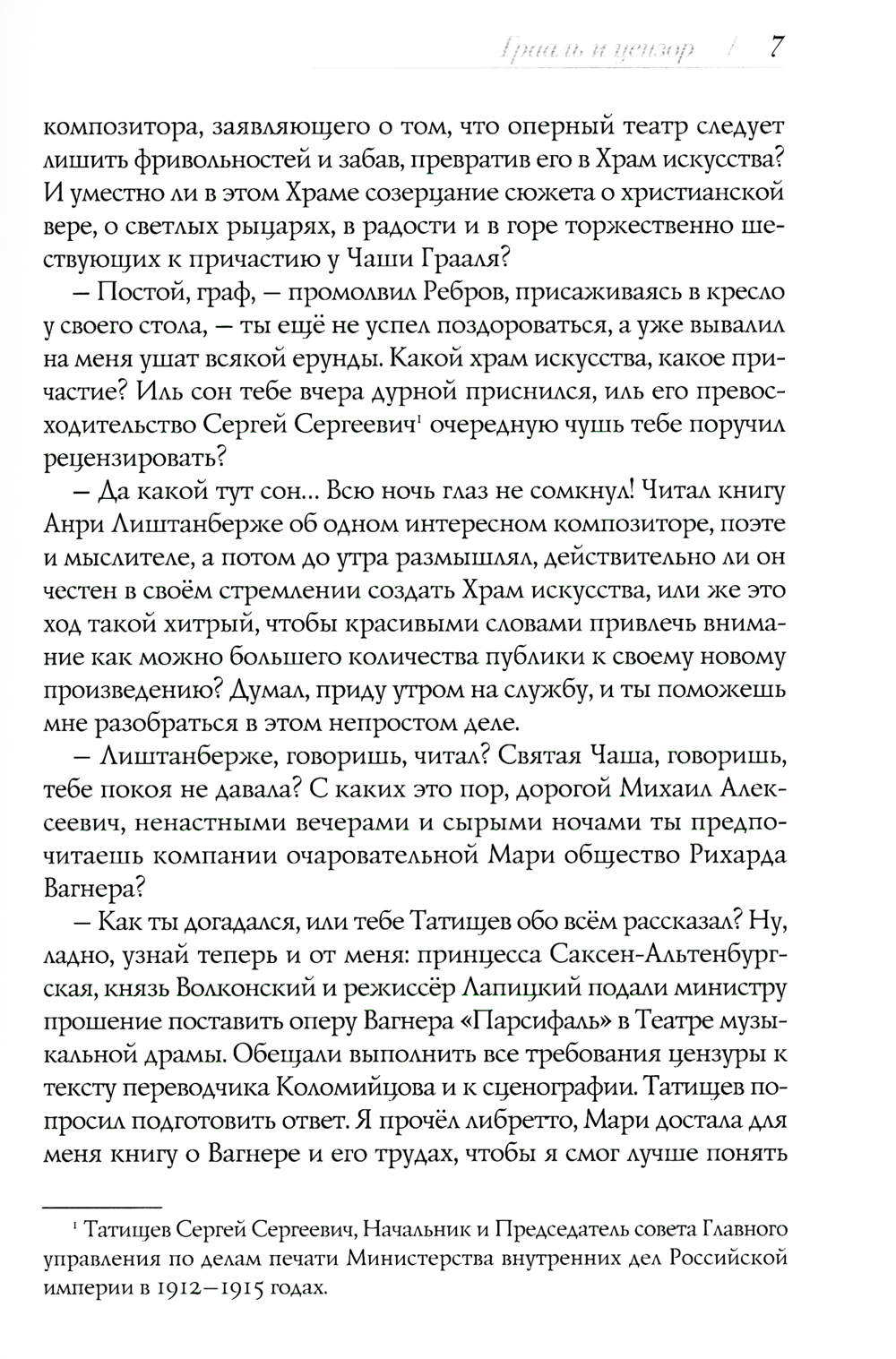 Повесть Вячеслава Власова «Грааль и Цензор» посвящена истории первой постановки торжественной сценической мистерии Рихарда Вагнера «Парсифаль» в Российской империи в 1913 году. Её герои - цензоры, служебный долг которых борется с их жгучим желанием познакомить просвещённую публику с высочайшим музыкальным искусством, подарить соотечественникам колоссальное духовное переживание. На страницах произведения переплелись великая музыка, театральные интриги, история нашей страны начала XX века и актуальные размышления об искусстве.| Издательство | ИПО "У Никитских ворот" |