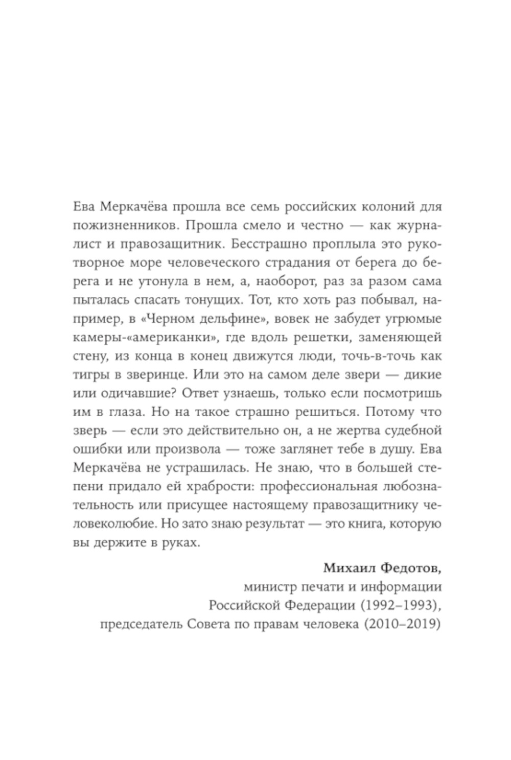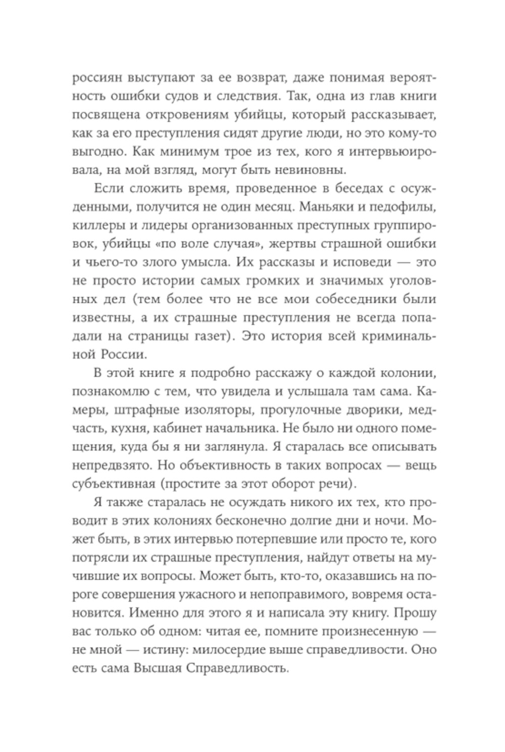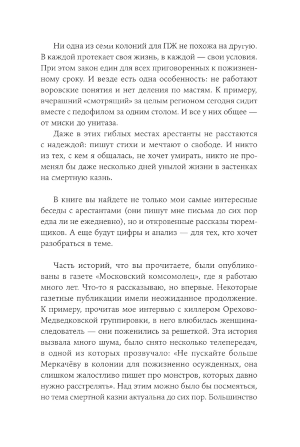 Журналист и правозащитник Ева Меркачёва побывала во всех семи российских колониях для пожизненно осужденных - там, где никто не хочет оказаться по своей воле. Она брала интервью у сотрудников колоний и у заключенных и рассказала в своей книге честно и без прикрас всё, что ей удалось увидеть и узнать. Автор подробно описала распорядок дня в колониях, быт заключенных, их самих и то, как меняют людей тюрьма, осознание тяжести совершенных преступлений и того, что им не выйти на свободу до конца жизни. Ева Меркачёва общалась с киллерами, маньяками, педофилами и другими преступниками, совершившими поступки настолько страшные, что общество предпочло навсегда исключить их из своей жизни. Она пыталась понять, что толкало их, когда-то совершенно нормальных, на преступления, что делало чудовищами в человеческом обличье; раскаиваются ли они или, наоборот, сожалеют о том, что не могут продолжать творить зло.| Издательство | Альпина Паблишер |