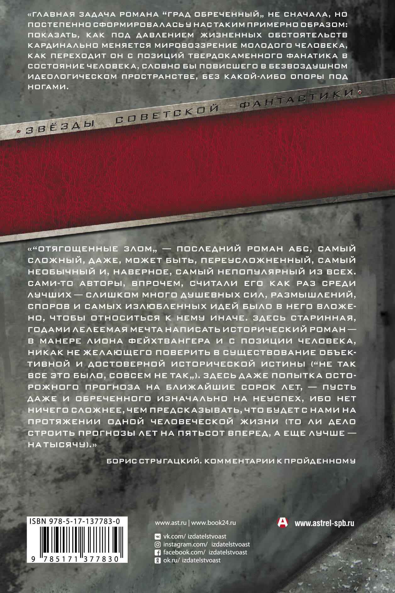 "Главная задача романа "Град обреченный" не сначала, но постепенно сформировалась у нас таким примерно образом: показать, как под давлением жизненных обстоятельств кардинально меняется мировоззрение молодого человека, как переходит он с позиций твердокаменного фанатика в состояние человека, словно бы повисшего в безвоздушном идеологическом пространстве, без какой-либо опоры под ногами". ""Отягощенные злом" - последний роман АБС, самый сложный, даже, может быть, переусложненный, самый необычный и, наверное, самый непопулярный из всех. Сами-то авторы, впрочем, считали его как раз среди лучших - слишком много душевных сил, размышлений, споров и самых излюбленных идей было в него вложено, чтобы относиться к нему иначе. Здесь старинная, годами лелеемая мечта написать исторический роман - в манере Лиона Фейхтвангера и с позиции человека, никак не жела ющего поверить в существование объективной и достоверной исторической истины ("не так все это было, совсем не так"). Здесь даже попытка осторожного прогноза на ближайшие сорок лет,- пусть даже и обреченного изначально на неуспех, ибо нет ничего сложнее, чем предсказывать, что будет с нами на протяжении одной человеческой жизни (то ли дело строить прогнозы лет на пятьсот вперед, а еще лучше - на тысячу)". Борис Стругацкий. Комментарии к пройденному| Издательство | ИЗДАТЕЛЬСТВО "АСТ" |
