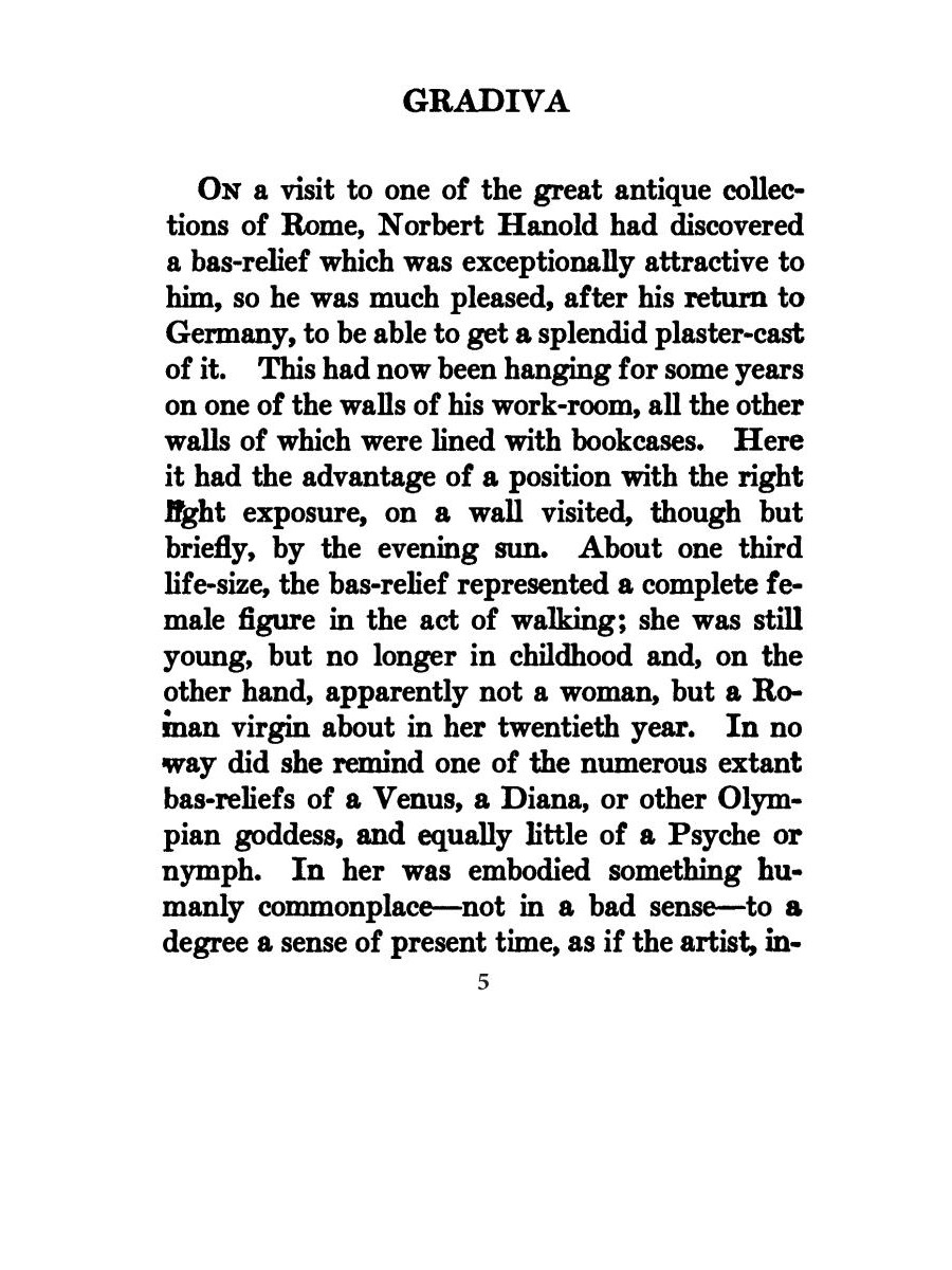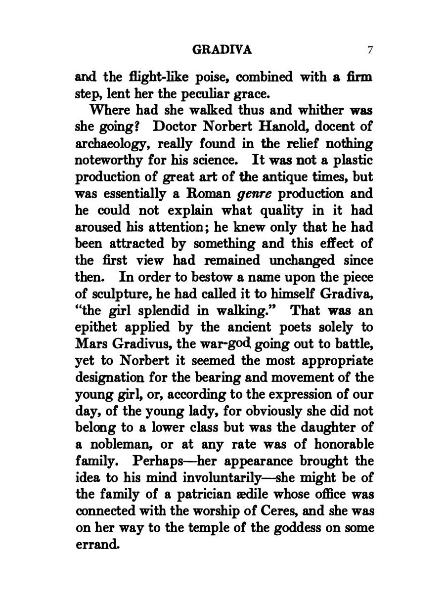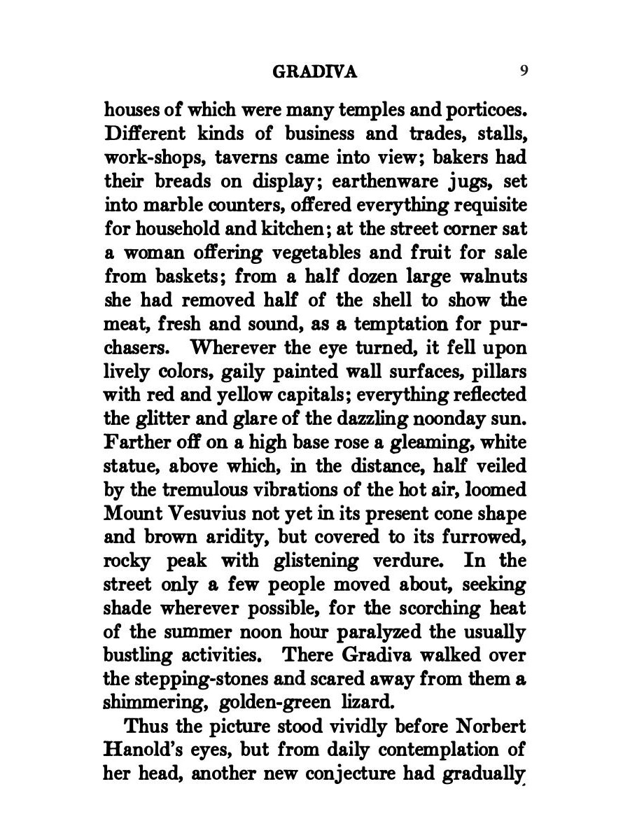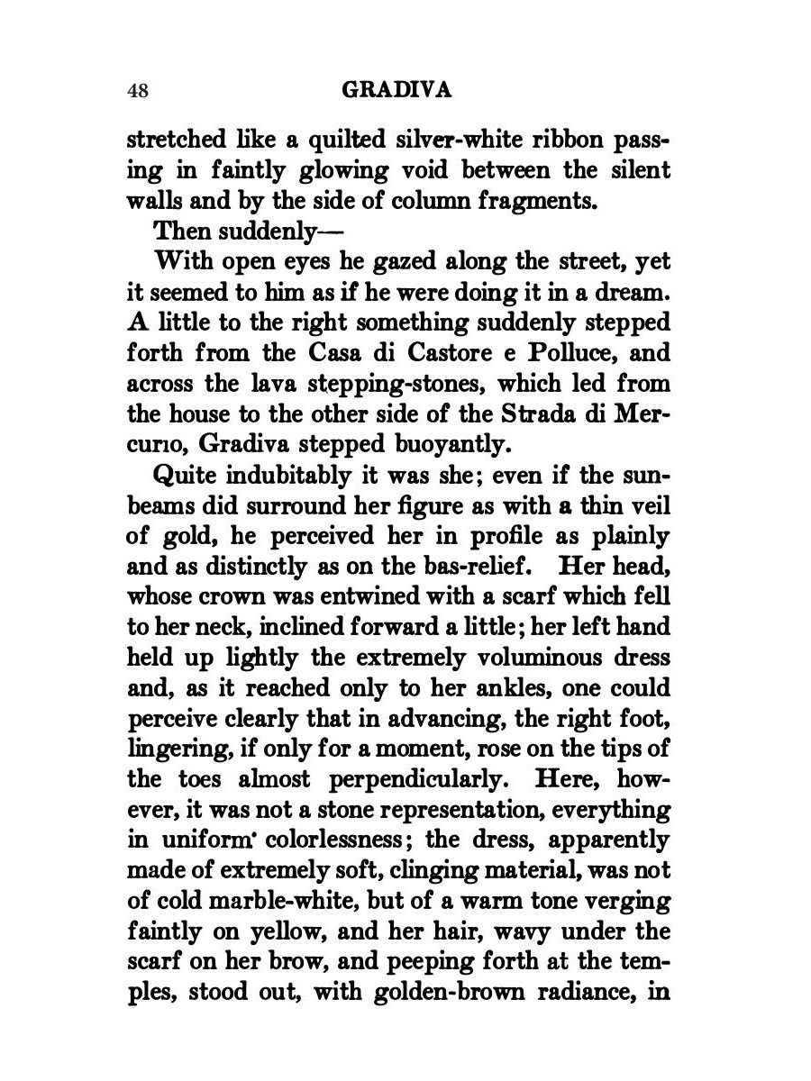 Повесть «Градива» является одним из самых известных произведений автора. Главный герой, Норберт Ганольд, влюбился в увиденный в музее античный барельеф. Однако таинственное явление девушки, изображённой на барельефе, сподвигло главного героя отправиться в Помпеи в надежде разыскать возлюбленную и подтвердить её действительное существование...