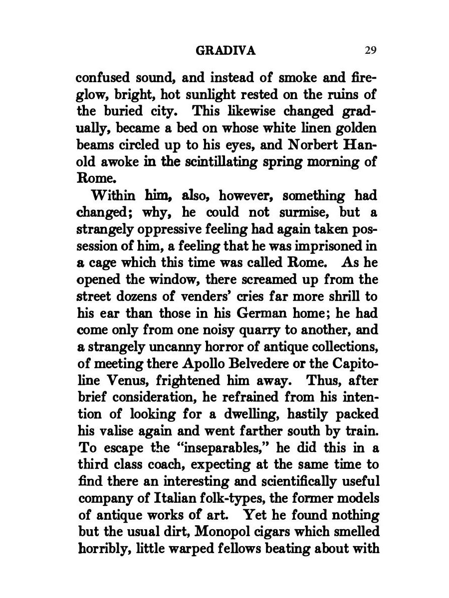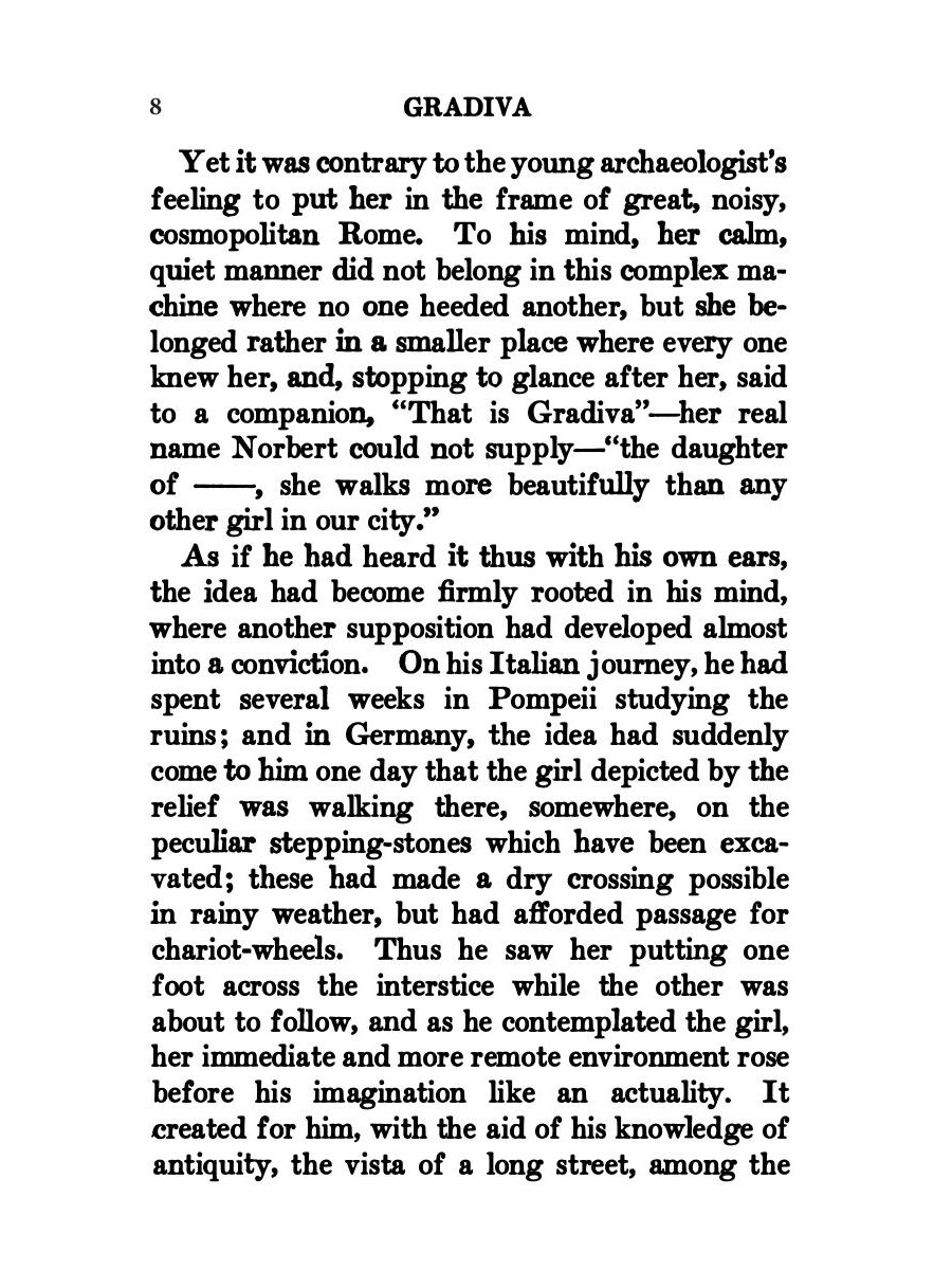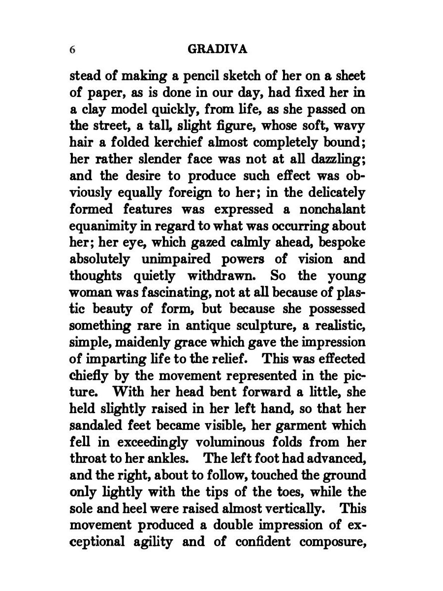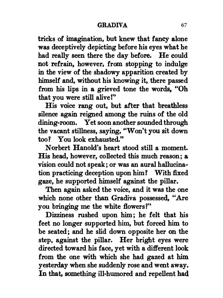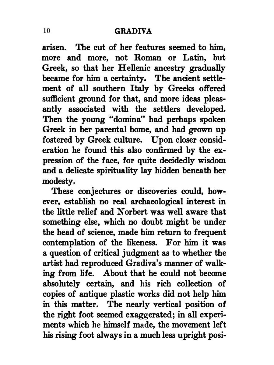 Повесть «Градива» является одним из самых известных произведений автора. Главный герой, Норберт Ганольд, влюбился в увиденный в музее античный барельеф. Однако таинственное явление девушки, изображённой на барельефе, сподвигло главного героя отправиться в Помпеи в надежде разыскать возлюбленную и подтвердить её действительное существование...