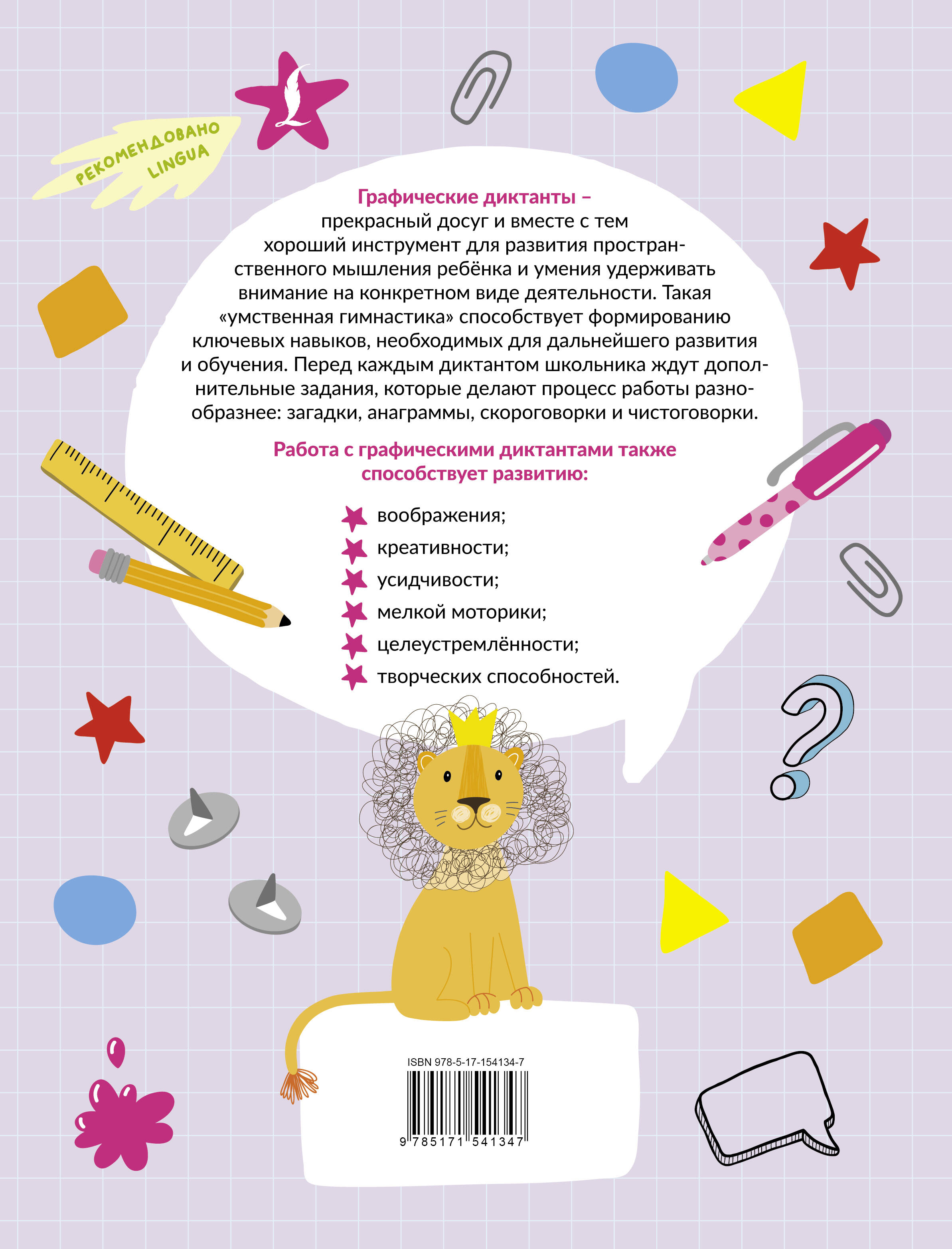 Графические диктанты - хороший инструмент для развития пространственного мышления ребёнка, мелкой моторики, усидчивости, воображения, а также умения удерживать внимание на конкретном виде деятельности. В издании представлено более 20 графических диктантов разного уровня сложности. Работать с ними просто, однако важно чётко следовать инструкции и быть внимательнее. Перед каждым графическим диктантом школьнику предлагаются дополнительные задания: загадки, шифровки, анаграммы, скороговорки и чистоговорки, а также гимнастика. Они не только станут подсказкой для школьника о том, какое изображение получится в результате выполнения диктанта, но и сделают процесс работы более увлекательным и продуктивным. Книга идеально подходит детям младшего школьного возраста, будет интересна родителям и учителям.| Издательство | ИЗДАТЕЛЬСТВО "АСТ" |