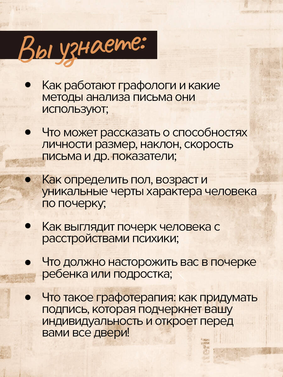 Наш почерк говорит о нас многое, он узнаваем независимо от его выражения. В книге рассматриваются методы графологического анализа, помогающие распознать особенности почерка и их связь с эмоциональным и психологическим состоянием личности. Автор подробно разбирает различные аспекты почерка, такие как размер и форма букв, наклон, давление и многое другое. На конкретных примерах вы увидите, какие черты могут свидетельствовать об интеллектуальных и психоэмоциональных способностях человека. Вы узнаете: • основы графологического анализа; • как почерк определяет нашу личность; • как провести комплексный анализ почерка; • от чего зависит уровень развития почерка и на что он влияет; • как подпись отражает представление человека о самом себе; • что должно насторожить в почерке ребенка, подростка и многое другое! Лариса Дрыгваль - клинический психолог, графолог, кандидат психологических наук. Эксперт в области психологического анализа письменного текста, руководитель Центра графологии. Победитель телепроекта "Я могу!" и конкурса профессиональных психологов "Эпоха Мастера". Автор программы обучения "Теория и техника графологического анализа". Проходила обучение графологическому анализу у мировых экспертов-графологов Израиля и Аргентины.