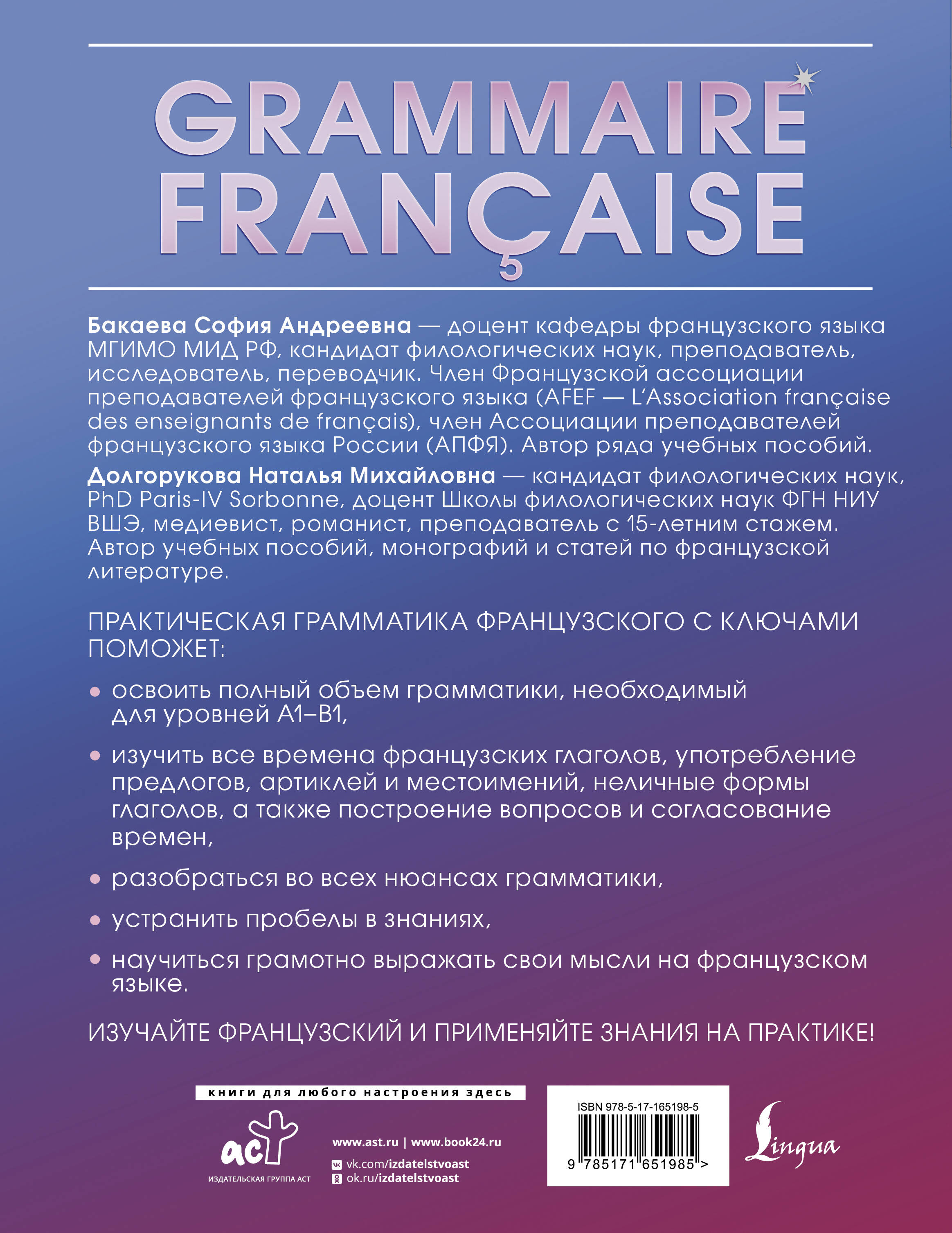 Бакаева София Андреевна - доцент кафедры французского языка МГИМО МИД РФ, кандидат филологических наук, преподаватель, исследователь, переводчик. Член Французской ассоциации преподавателей французского языка (AFEF - L'Association française des enseignants de français), член Ассоциации преподавателей французского языка России (АПФЯ). Автор ряда учебных пособий. Долгорукова Наталья Михайловна - кандидат филологических наук, PhD Paris-IV Sorbonne, доцент Школы филологических наук ФГН НИУ ВШЭ, медиевист, романист, преподаватель с 15-летним стажем. Автор ряда учебных пособий, монографий и статей по французской литературе. В этом издании представлен полный объем грамматики французского языка уровней А1-В1, даны все базовые правила, подробно рассмотрены части речи и их особенности, также уделено внимание фонетике и синтаксису. Теоретический материал сопровождается упражнениями, для большей части которых даны ответы. Великолепное издание, без которого не обойтись при изучении французского языка!| Издательство | Издательство "АСТ" |