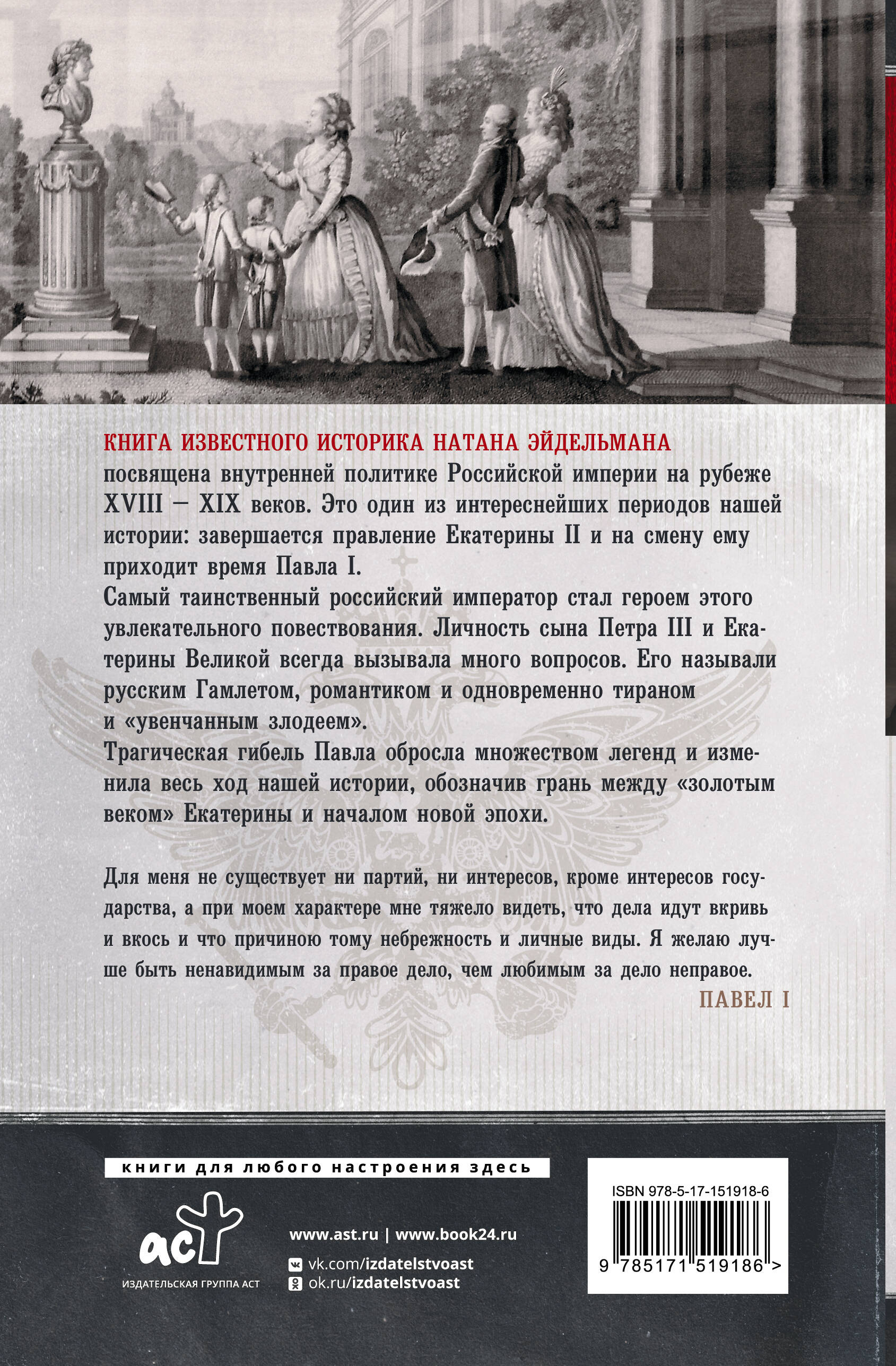 Книга известного историка Натана Эйдельмана посвящена внутренней политике Российской империи на рубеже XVIII-XIX веков. Это один из интереснейших периодов нашей истории, который необратимо обозначил грань между "золотым веком" Екатерины и началом новой эпохи. Героем этого увлекательного повествования стал самый таинственный российский император. Личность сына Петра III и Екатерины Великой всегда вызывала много вопросов. Его называли русским Дон Кихотом, романтиком и одновременно тираном и "увенчанным злодеем". Трагическая гибель Павла обросла множеством легенд и изменила ход нашей истории. Подробности заговора и обстоятельства кровавого переворота описаны в данном исследовании.| Издательство | ИЗДАТЕЛЬСТВО "АСТ" |