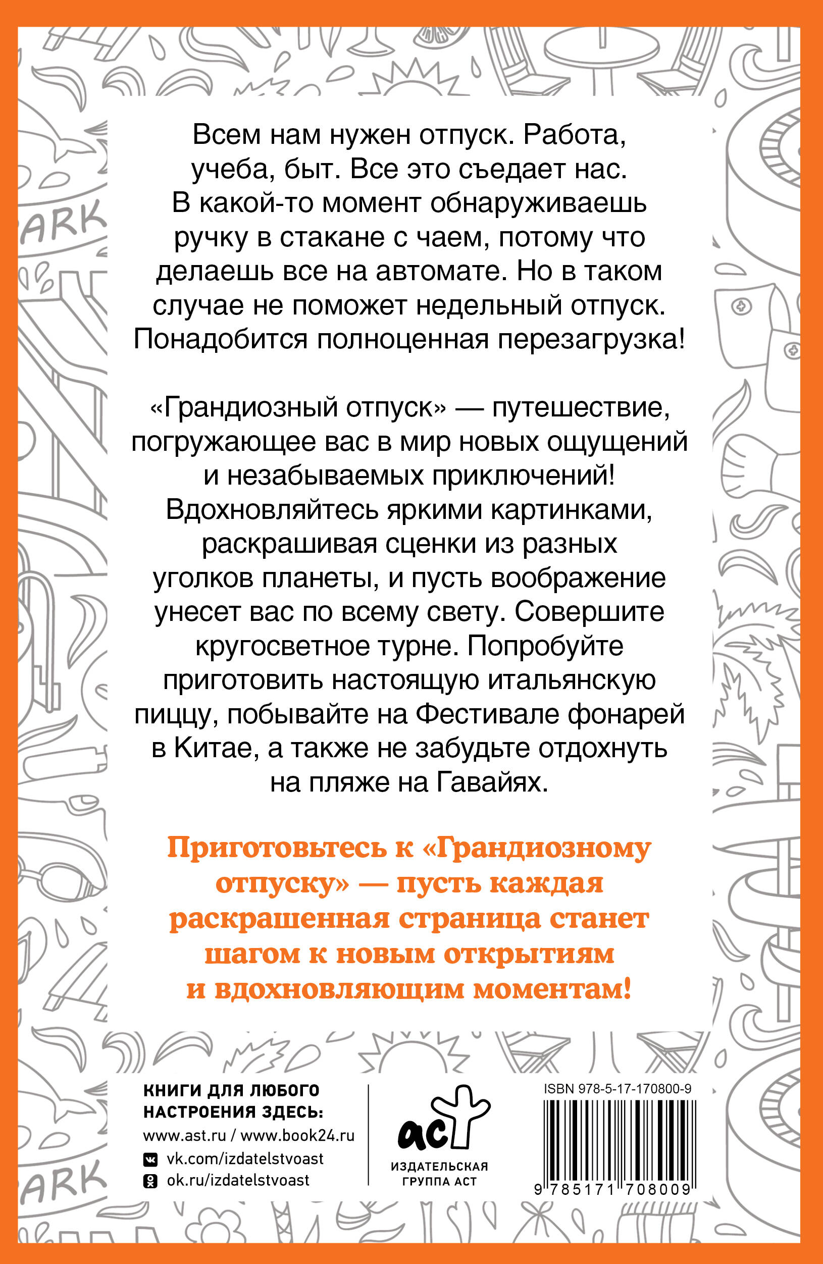 Всем нам нужен отпуск. Работа, учеба, быт. Все это съедает нас. В какой-то момент обнаруживаешь ручку в стакане с чаем, потому что делаешь все на автомате. Но в таком случае не поможет недельный отпуск. Понадобится полноценная перезагрузка! "Грандиозный отпуск" - путешествие, погружающее вас в мир новых ощущений и незабываемых приключений! Вдохновляйтесь яркими картинками, раскрашивая сценки из разных уголков планеты, и пусть воображение унесет вас по всему свету. Совершите кругосветное турне. Попробуйте приготовить настоящую итальянскую пиццу, побывайте на Фестивале фонарей в Китае, а также не забудьте отдохнуть на пляже на Гавайях. Приготовьтесь к "Грандиозному отпуску" - пусть каждая раскрашенная страница станет шагом к новым открытиям и вдохновляющим моментам!| Издательство | Издательство "АСТ" |