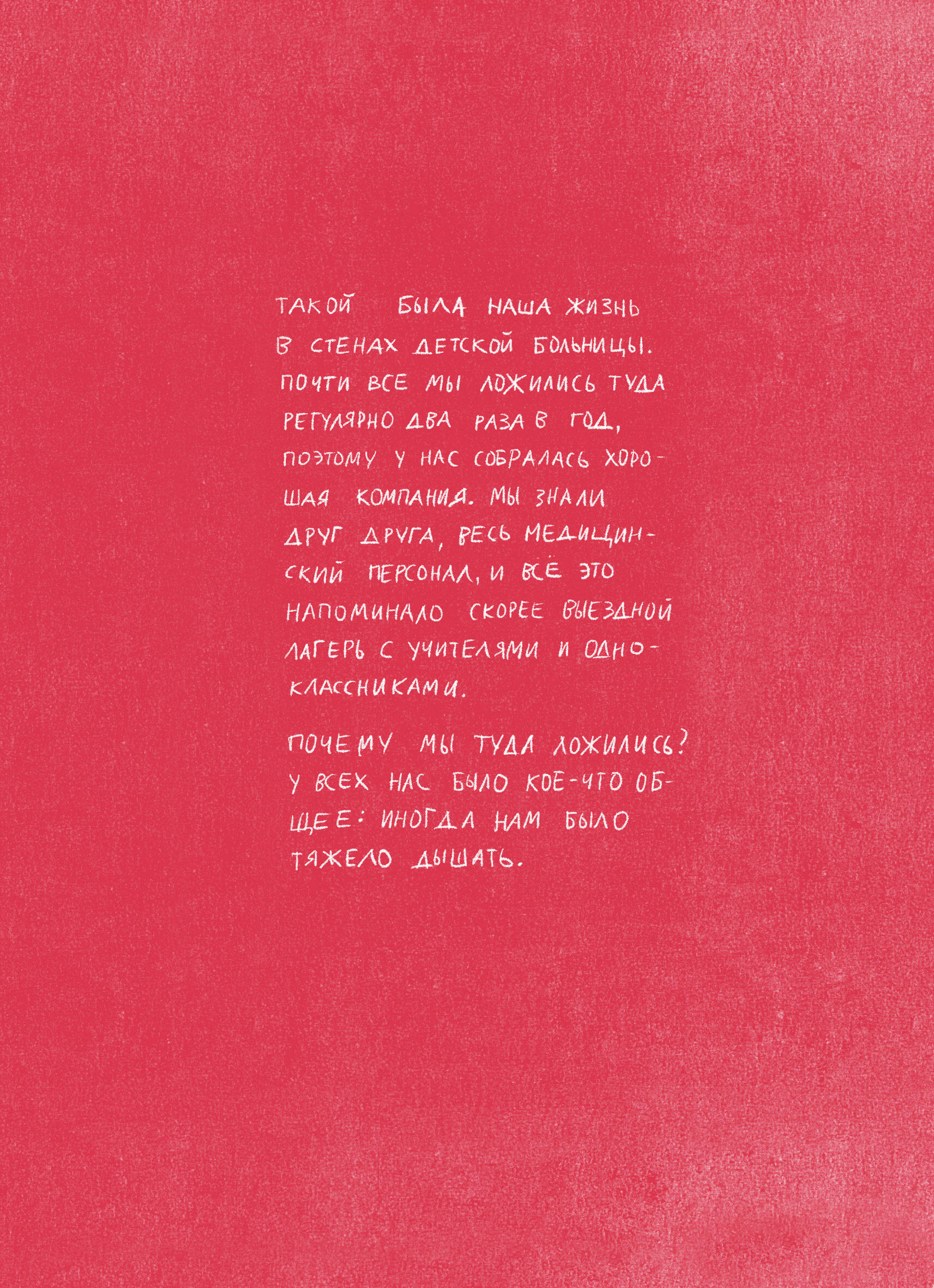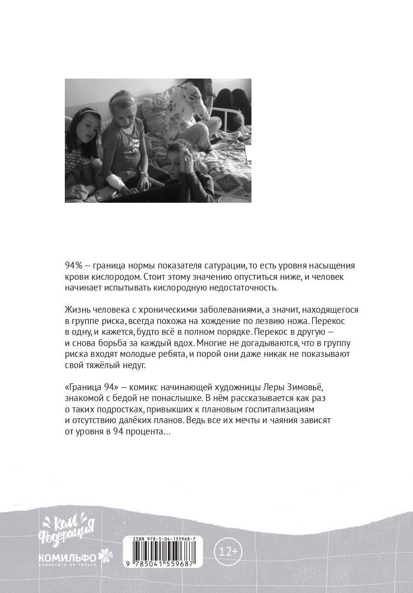 94% - граница нормы показателя сатурации, то есть уровня насыщения крови кислородом. Стоит этому значению опуститься ниже, и человек начинает испытывать кислородную недостаточность. Жизнь человека с хроническими заболеваниями, а значит, находящегося в группе риска, всегда похожа на хождение по лезвию ножа. Перекос в одну сторону, и кажется, будто всё в полном порядке. Перекос в другую - и снова борьба за каждый вдох. Многие не догадываются, что в группу риска входят молодые ребята, и порой они даже никак не показывают свой недуг. В 2020-м году настали тяжёлые времена для всех людей с хроническими заболеваниями. Особенно трудно стало лёгочникам: тем, кто до этого планово ложился в больницу по два раза в год, теперь приходилось лечиться своими силами на дому, ведь почти все пульмонологические отделения в России перепрофилировались под лечение COVID-19. Из аптек пропали необходимые лекарства. До сих пор многие из них не могут получить лечения, потому что риск заражения в больницах всё ещё очень велик. «Граница 94» - комикс начинающей художницы Леры Зимовье, знакомой с бедой не понаслышке. В нём рассказывается о подростках, привыкших к плановым госпитализациям и отсутствию далёких планов. Ведь все их мечты и чаяния зависят от уровня в 94 процента.