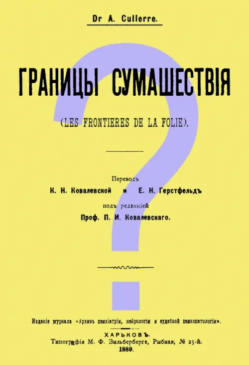 Репринт с издания. Харьков, журн. "Арх. психиатрии, нейрологии и судеб. психопатологии", 1889. Пер. также под загл. "Современные психопаты". Александр Кюллер (1849 -1934) - известный французский психиатр. Настоящее французское название книги `Границы безумия`. Во вступительной части автор берет быка за рога и делает глубокий вывод о том, " с того дня, как не будет полупомешанных, мир цивилизации погибнет - не от избытка мудрости, а от избытка посредственности". Оглавление: Глава первая. Сумашествие. Наследственность умственного и нравственного вырождения. ; I. Природа и происхождение сумашествия; II. Границы сумашествия; III. Физические и психические признаки вырождения; Глава вторая. Насильственные явления. ; I. Боязнь пространства; II. Помешательство сомнения; III. Бред прикосновения; IV. Различные душевные насильственные явления; Глава третья. Импульсивность; I. Импульсы к самоубийству и убийству; II. Дипсомания; III. Влечение к воровству, покупкам и игре; IV. Пиромания; Глава четвертая. Экоцентрики; I. Скитальцы, неустойчивые личности, авантюристы; II. Странные люди, скряги; III. Тщеславные, расточители; IV. Изобретатели, мечтатели, утописты; Глава пятая. Преследователи; I. Преследуемые преследователи; II. Сутяги; III. Ревнивцы; Глава шестая. Мистики; I. Мистики; II. Фанатики; III. Эротоманы; Глава седмая. Извращенные; I. Истеричные; II. Лгуны; III. Притворщики; IV. Преступники; Глава восьмая. Вопросы судебной меднцины; I. Преступление и сумашествие; II. Дифференциальный диагноз; III. Ответственность; Глава девяиая. Сумашествие и цивилизация; I. Сумашествие в истории; II. Сумашествие, талант и гений; III. Патология в литературе и искусстве.