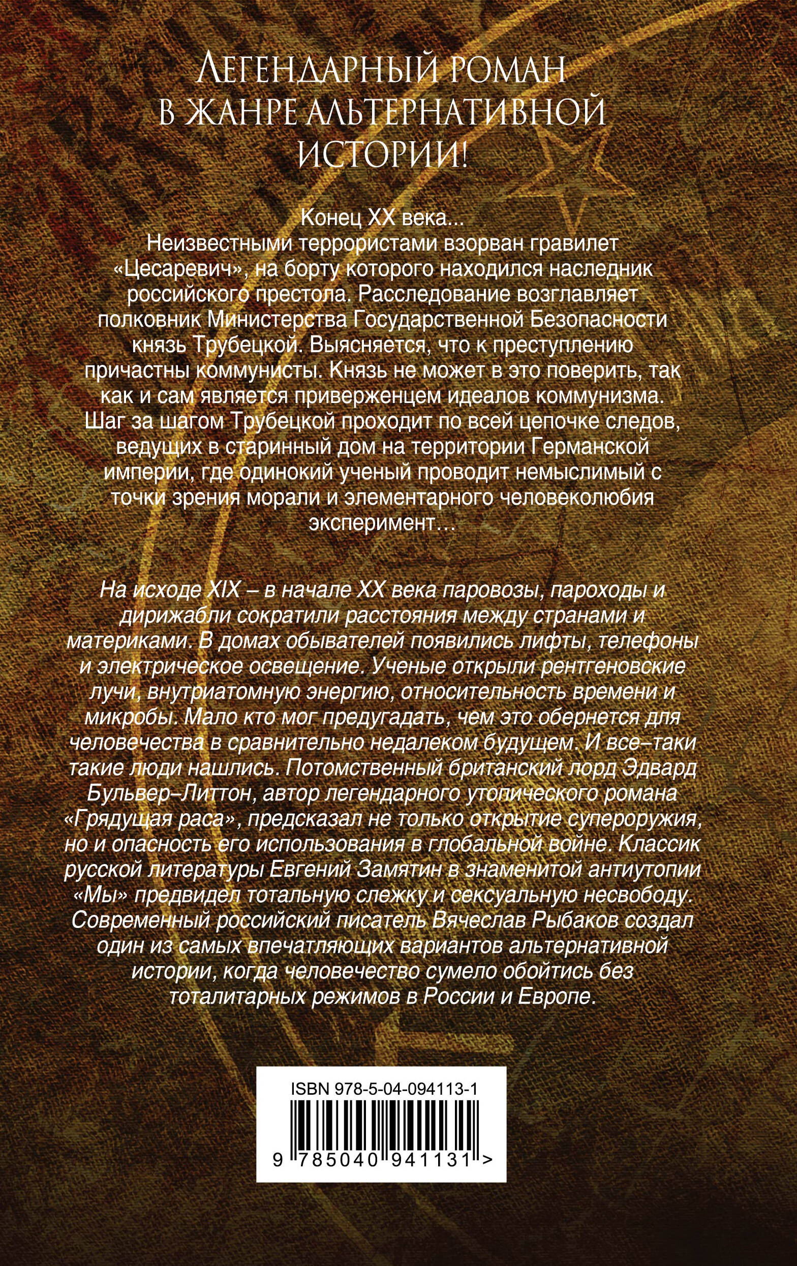 Легендарный роман в жанре "альтернативной истории"! Конец ХХ века… Неизвестными террористами взорван гравилет "Цесаревич", на борту которого находился наследник российского престола. Расследование возглавляет полковник Министерства Государственной Безопасности князь Трубецкой. Выясняется, что к преступлению причастны коммунисты. Князь не может в это поверить, так как и сам является приверженцем идеалов коммунизма. Шаг за шагом Трубецкой проходит по всей цепочке следов, ведущих в старинный дом на территории Германской империи, где одинокий ученый проводит немыслимый с точки зрения морали и элементарного человеколюбия эксперимент…| Издательство | ООО "Издательство "Эксмо" |