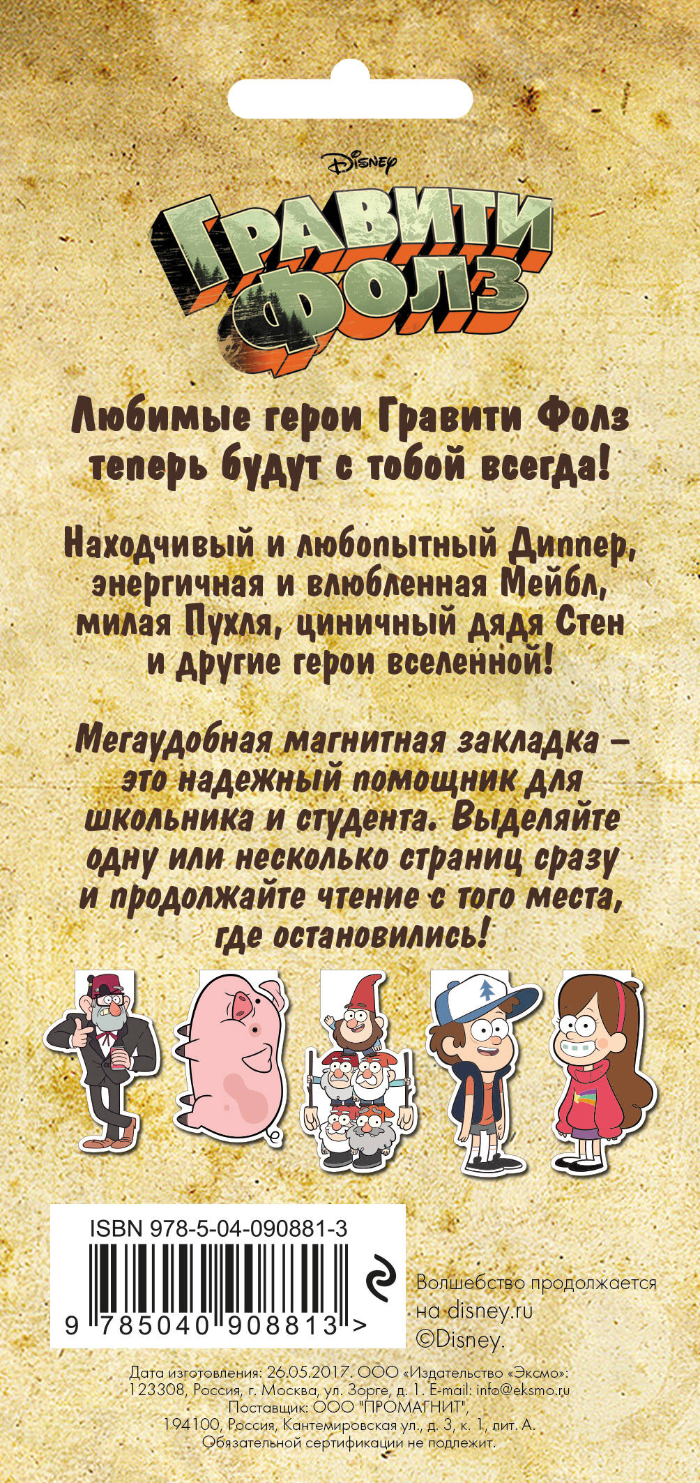 Впервые на рынке большие магнитные закладки с изображением персонажей «Гравити Фолз»! Лицензионные суперзакладки с героями популярнейшего мультсериала теперь на полках всех книжных страны. Возьмите их и окунитесь в яркий мир Диппера, Мейбл, Стэна, Пухли и других любимых героев! Суперкрутой сувенир для фанатов «Гравити Фолз», а также надежный помощник для школьника и студента. Закладка изготовлена по принципу клипсы: зажимает страницу книги между двух магнитов, выполнена из плотного ламинированного картона. Удобный формат позволяет не только выделять одну или несколько страниц сразу, но и выделиться из толпы! Для кого это: - для тех, кто просто обожает вселенную «Гравити Фолз», - для тех, кто хочет отличаться от других, - для любителей стиля в мелочах. Фишки: - яркий эксклюзивный дизайн, - официальные продукты самого популярного мультсериала, - множество сюжетов и персонажей, - каждый найдет закладку для себя, - удобная упаковка, - уникальный формат закладок, - впервые на рынке!| Издательство | Эксмо |