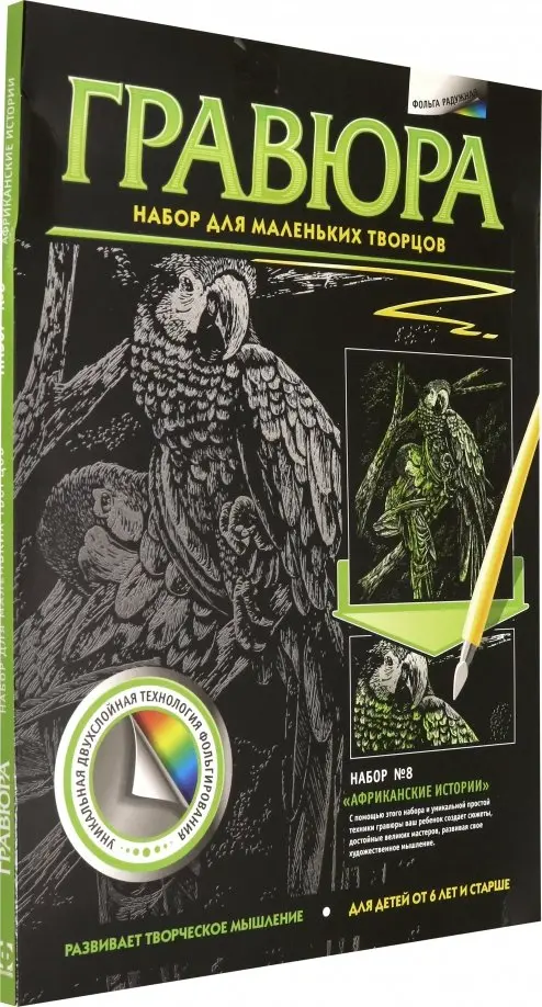 С помощью этого набора и уникальной простой техники гравюры ваш ребенок создает сюжеты, достойные великих мастеров, развивая свое художественное мышление.