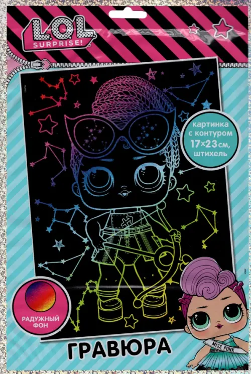 Гравюра - удивительный вид творчества, а с популярными героинями ЛОЛ становится интересным. Собери всю коллекцию ярких изображений, сделанных своими руками у себя дома! Набор для творчества включает в себя: Многослойная основа - металлизированное покрытие с черным грунтом и контурным рисунком для процарапывания сверху.